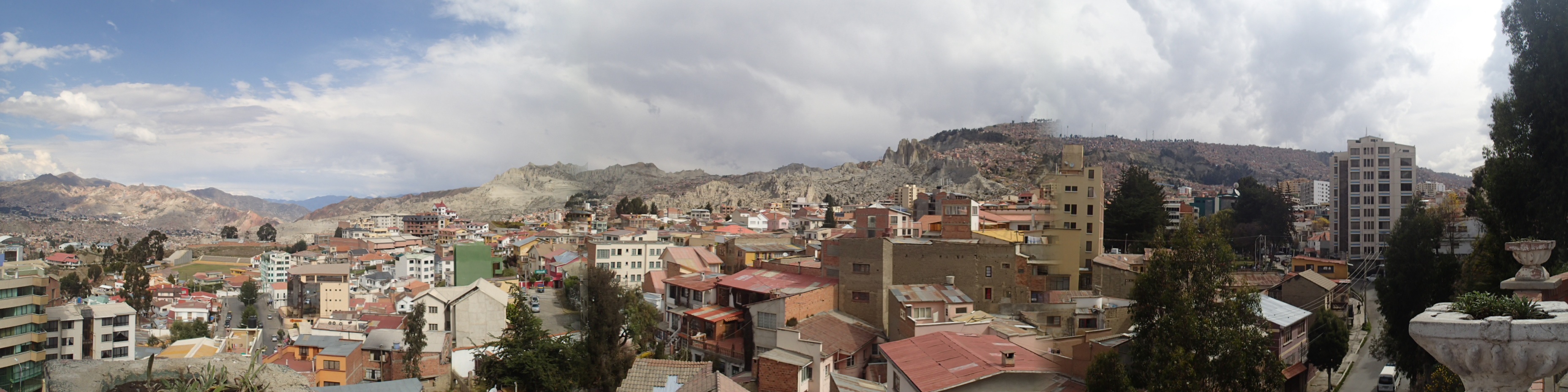Dès notre sortie un chauffeur de taxi nous aborde en Espagnol (voila l’immersion qui commence), nous voila partis pour la ville a 400 m plus bas. Sur notre route le chauffeur nous fait descendre a un belvédère qui offre une vue splendide sur La Paz et son immensité a perte de vue entre les montagnes (certaines avec de neiges éternelles au sommet) voir la photo.