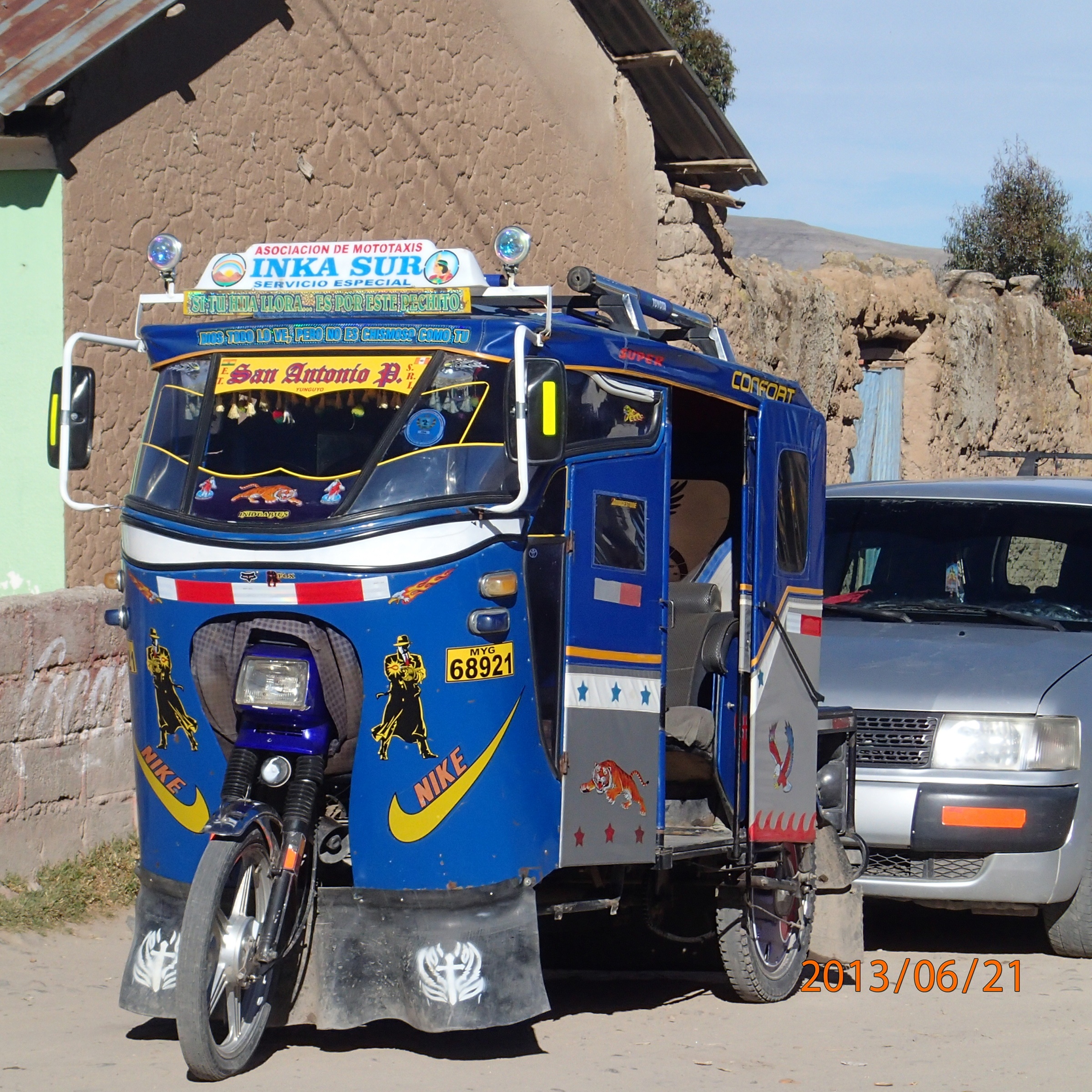 3h30 plus tard on est à Puno, on débarque au terminal de bus qui comme tous les autres ou presque n’est pas sur les cartes du routard (on dirait que dans ce livre ils ont complètement oubliés que c’est surtout quand on arrive que l’on à besoin de pouvoir se repérer afin de se rendre à l’hôtel!!!! Enfin le prochain voyage on va voir avec le Lonely Planet si les cartes sont mieux!!!). Heureusement nous sommes de jours et il y a un kiosque d’information au terminus. On se renseigne et il nous remettent urne carte de la ville, on sait maintenant que notre hôtel est à environ 40 min. de marche et hop on est repartis pour une autre aventure! « Lo que es interesante acerca de caminar antes de tomar un taxi es que entonces podemos tomar el pulso de la ciudad y comenzar inmediatamente a sentir el ritmo » (ce que nous faisons dans presque toutes nos destination). Premier constat ici ce sont les taxis, des genres de motos 3 roues mais complètement couverts, conducteur à l’avant, 2-3 passagers à l’arrière et petit espace pour les bagages. Tous sont personnalisés aux dessins de leurs proprio!!!!
