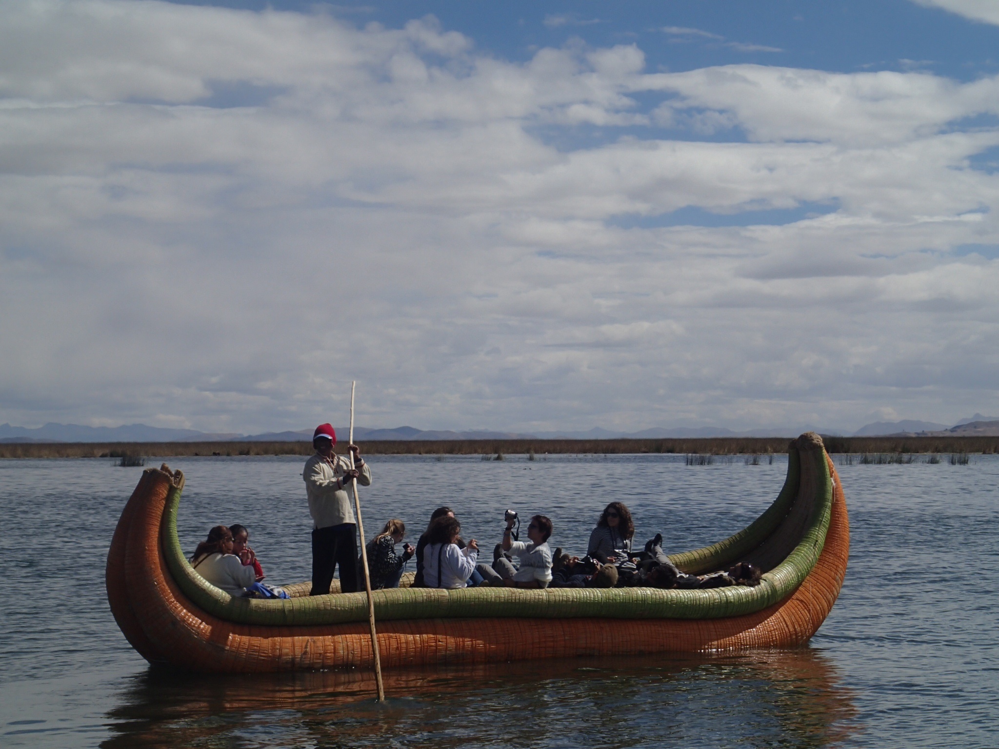 8h, départ pour les îles sur le Lac, le soleil est au rendez-vous et première destination les Uros (Îles flottantes). Environ 3hrs plus tard on arrive. Un petite Île faite de roseaux superposés,(il y en a des dizaines sur le coté Péruvien ou vivent des petites communautés de 10 à 30 personnes). On s’attendait à voir quelque chose de beaucoup plus grand et assister un peu à leurs coutumes. Mais pas du tout, c’est vraiment touristique, à part l’île elle même, rien de trop authentique…..Même le petit tour sur un bateau en roseau (10 soles/pers) fait cliché. Enfin notre guide nous donne plein d’information sur les origines ainsi que la construction de ces îles, il est vraiment très bon. Plus tard on entendra dire que certaines îles ne seraient pas réellement habités mais que la communauté se déplacerait que pour recevoir les touristes ! ( hum ….à vérifier)