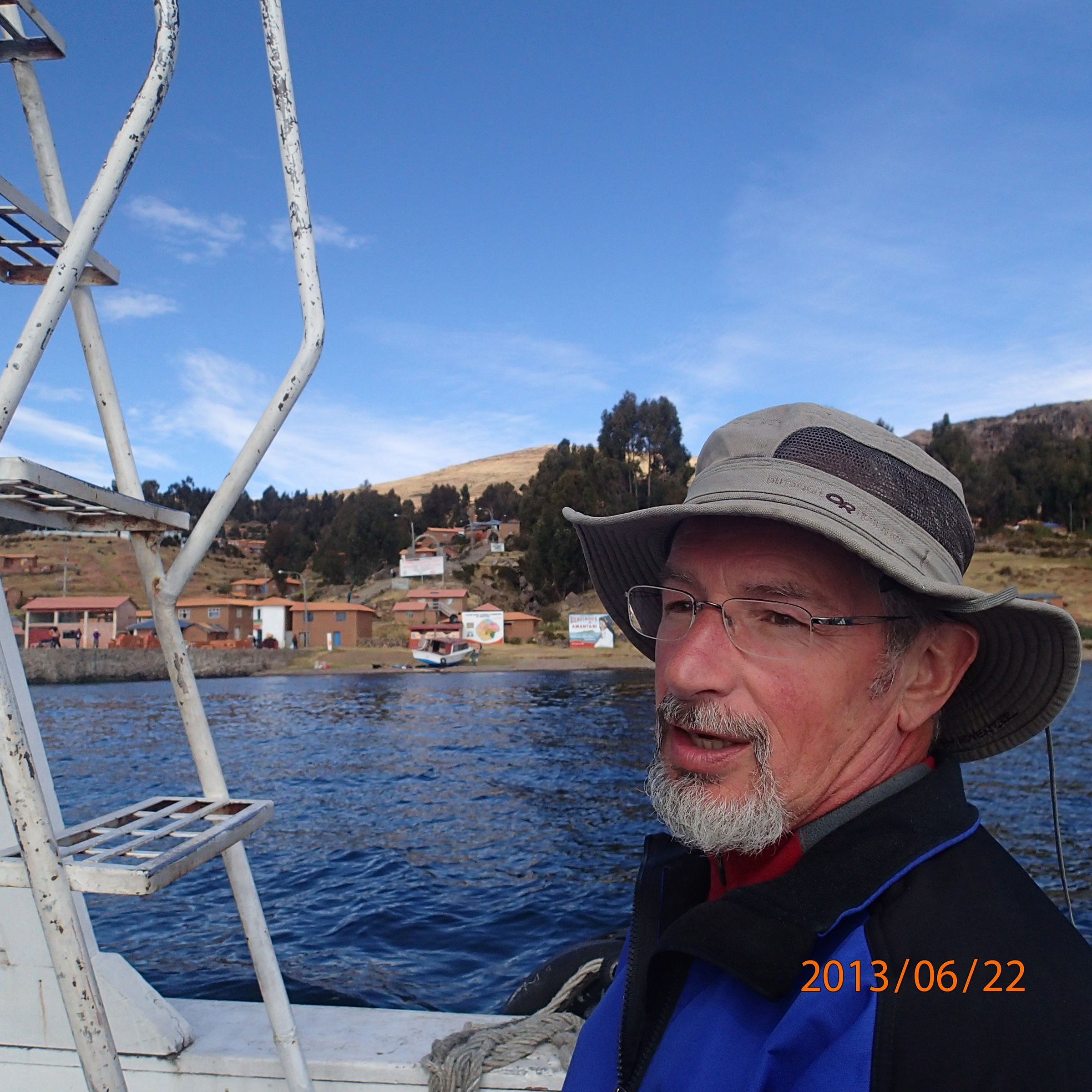 Retour au bateau après une descente ~800 marches…put put put et direction Puno. Au départ ça brasse un peu car beaucoup plus venteux que lors de l’aller. A un certain moment donné les vagues faisaient plus de un mètre de haut, ça brassait pas mal dans le petit bateau… put put put…et Nath restera assise à l’extérieure et à l’arrière du bateau à fixer l’horizon tout ce temps. (Denis avait en tête l’air des Joyeux naufragés, vous vous rappelez Guilligan et le Capitaine….).