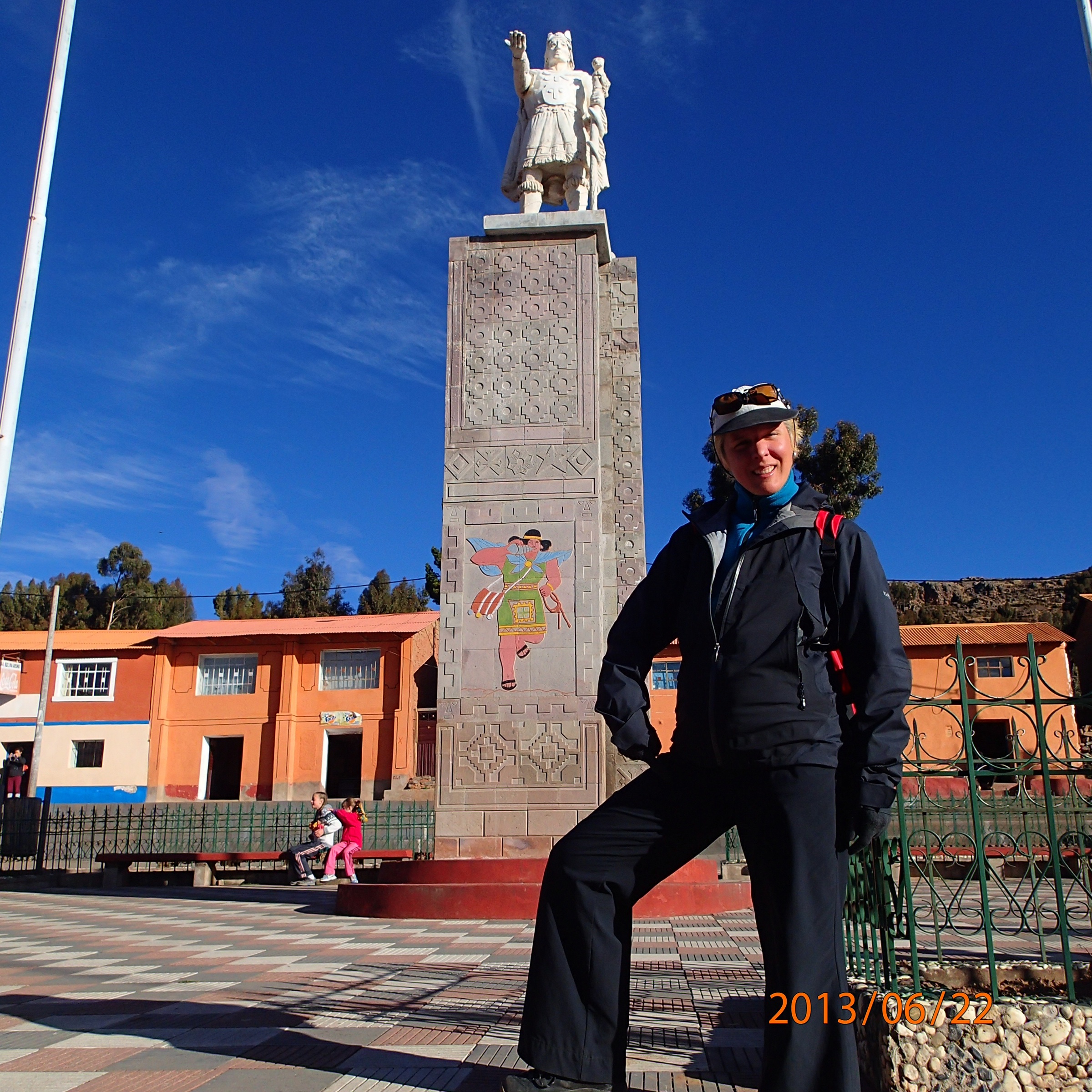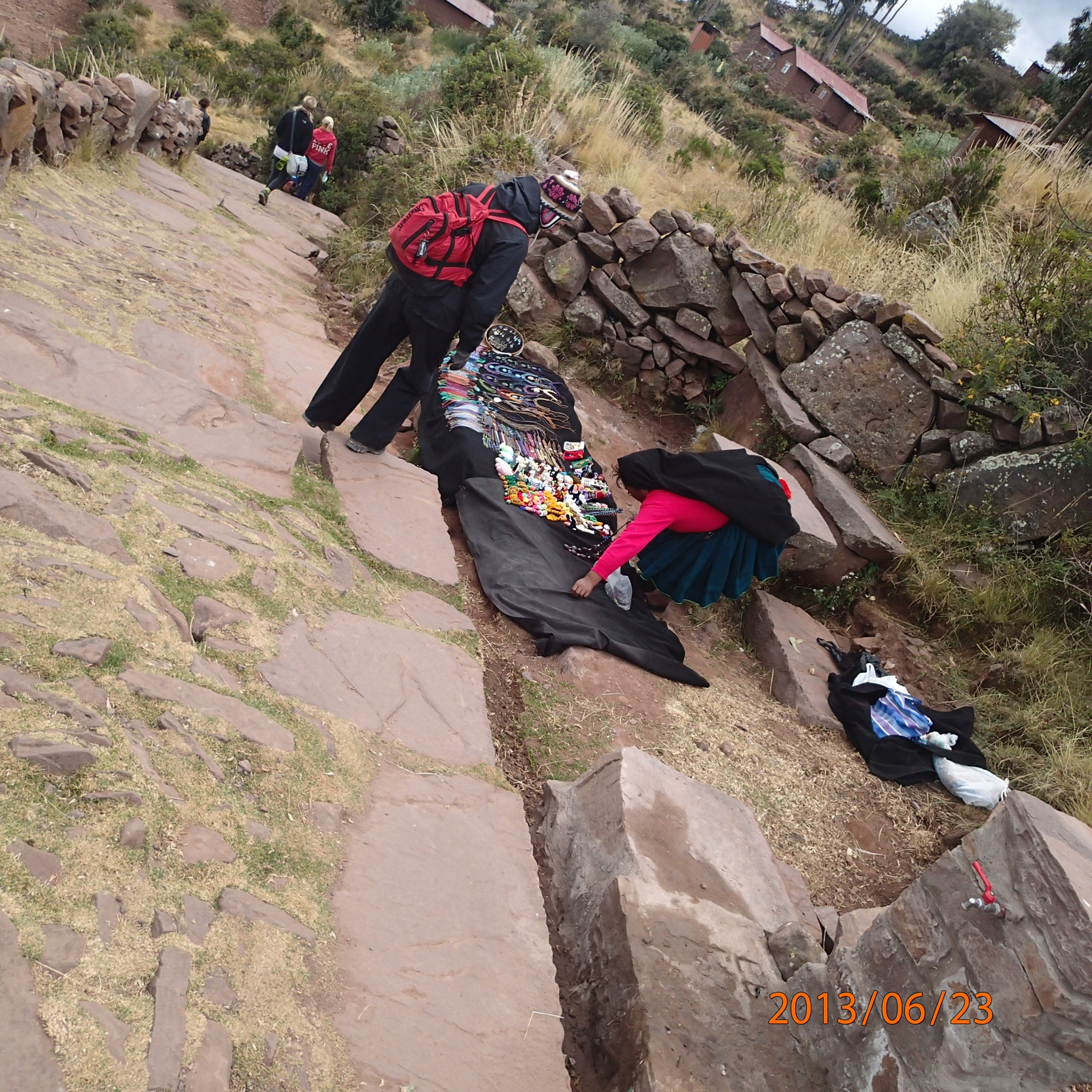 Put put put….enfin arrivés à l’île Taquille! On marche en faisant le tour de l’île et en montant pendant environ 1h. Le long de la route plusieurs vendeurs (oui surprise car c’est normalement des femmes) sont postés pour vendre bijoux, colliers, et autres. Nath tombe sous le charme d’un bracelet et l’achète immédiatement (une chance car nous n’en reverrons aucun comme ça sur le reste de l’île). Rassemblement sur la plaza principale pour un peu d’informations de la part de notre guide. Taquille compte près de 2,500 habitants comparé à Amantani qui en compte près de 4,000 pourtant Taquille semble beaucoup plus peuplée. Autre fait est que Taquille est ouvert aux touriste depuis près de 25 ans alors que Amantani depuis 10 ans seulement alors la gestion du tourisme cest quelque peu améliorés et des règlement se sont imposé tel que de ne prendre des photos des habitants qu’en leurs demandant et remettant un sol (40 cents) en échange …ça du bon et du moins bon! (….pas de monde parfait! Mais imaginons le contraire si partout ces gens nous prendrait (Denis et Nath) en photos….on finirait par se sentir comme des bêtes de cirque!)