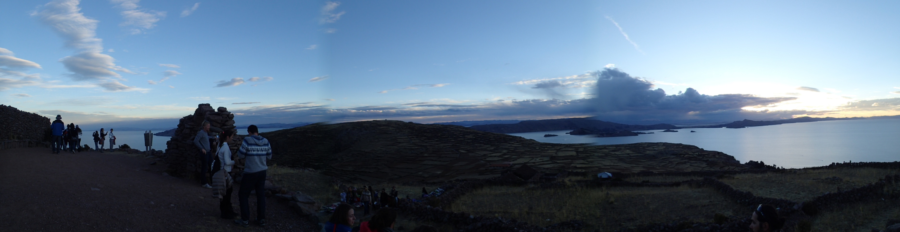 Petit repos avant le rassemblement de tous sur la place centrale du village afin de monter au sommet d’une des montagnes de l’île pour voir le coucher du soleil et un temple Incas. La montée est assez ardue après notre journée presqu’inerte et la nuit dernière à Puno! Enfin on y est quelque centaines de mètre plus haut avec une superbe vue à 360 degrés! Pour ce qui est du temple, ce ne sont que le ruines dont nous ne pouvons imaginer la forme originale tellement il ne reste presque rien… Redescente vers la place centrale ou Saturnino (le nom du papa) nous attends pour nous ramener chez lui (dieu merci car ça n’aurait pas été évident du tout de retrouver notre chemin à la noirceur). Et là on nous dit que le souper sera servi dans 15 minutes… (Il me semble qu’on vient de sortir du lunch)!