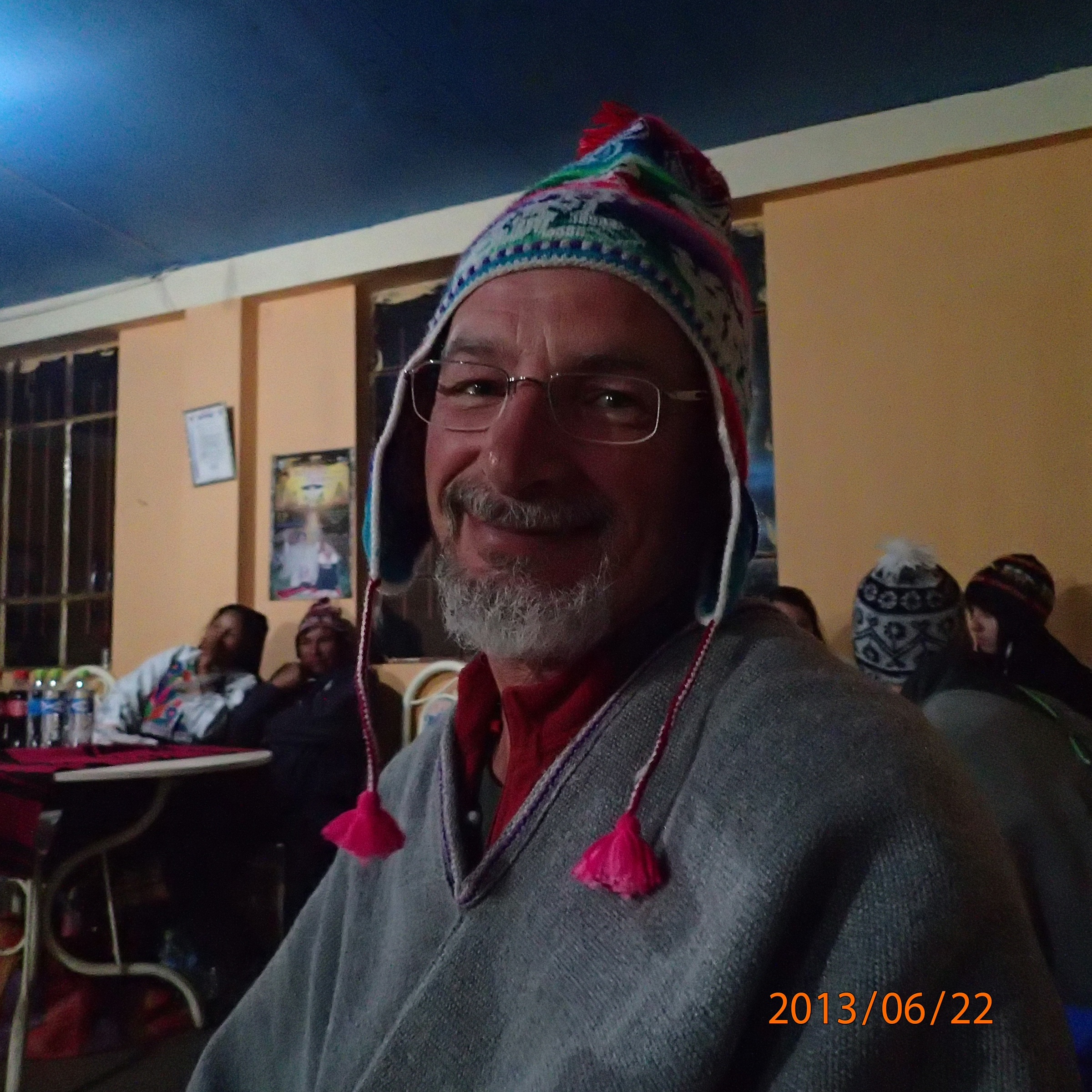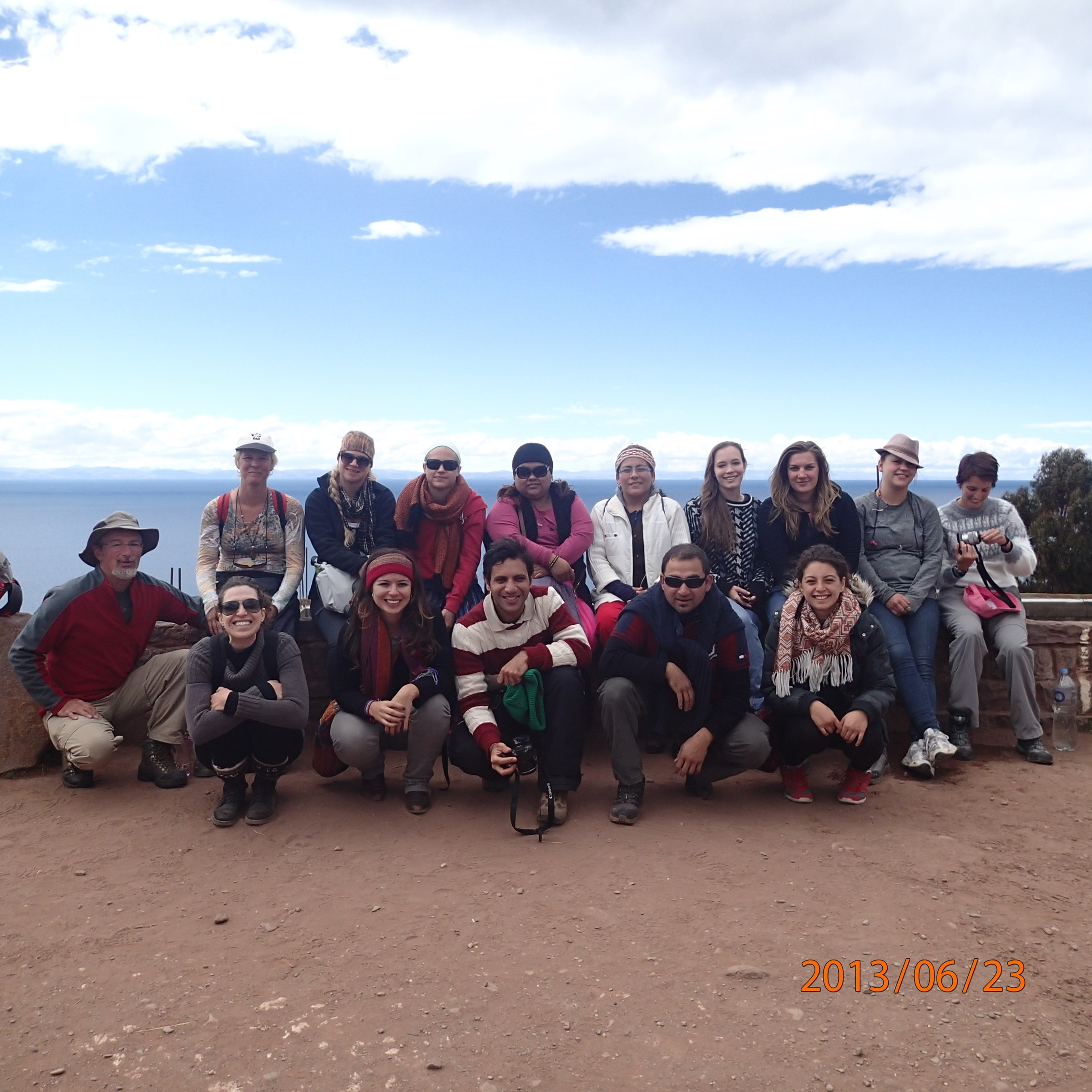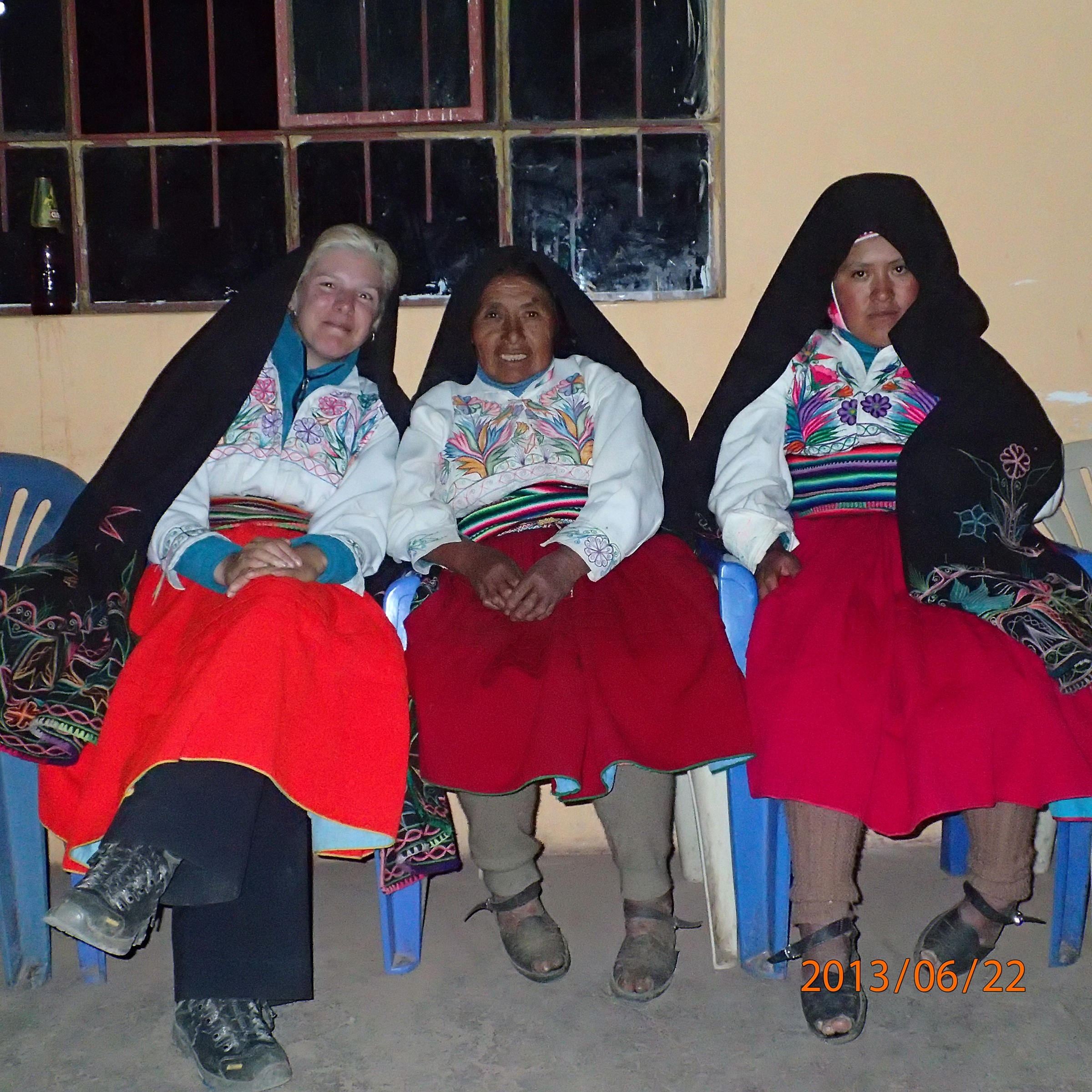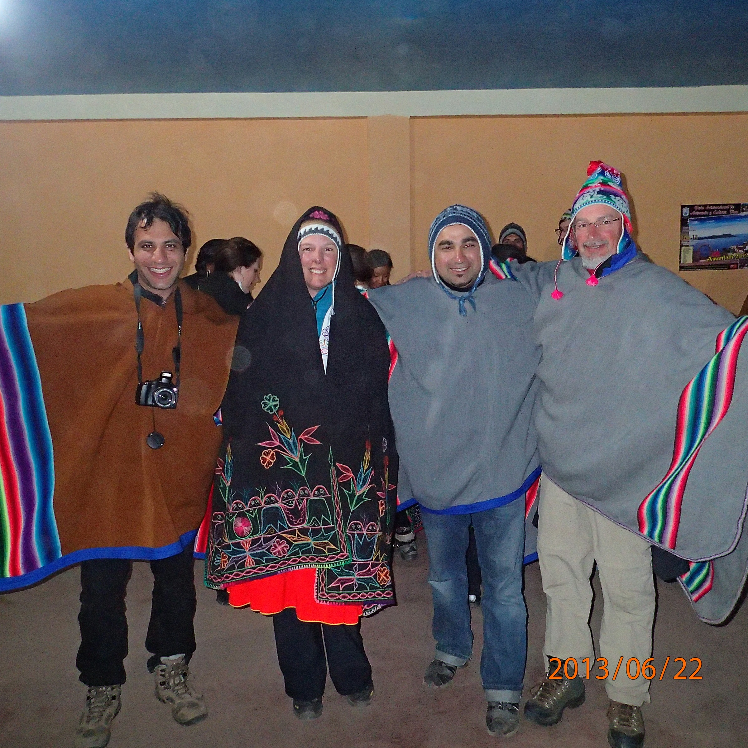 Photos de groupe puis on se dirige vers notre lieux pour le diner. Arriver sur place notre guide nous montre certains vêtements locaux tout en nous expliquant leurs origines et fonctions (exemple une ceinture pour homme remise par la future épouse lors du mariage et confectionnée avec les cheveux de la mariée en guise de leurs liens éternels!!!). Diner dans une famille locale, excellent poisson grillé avec papa fritas, légumes et bien sur avant il y avait une soupe qu’on apprécit puisque c’est « mucho frio »!!!