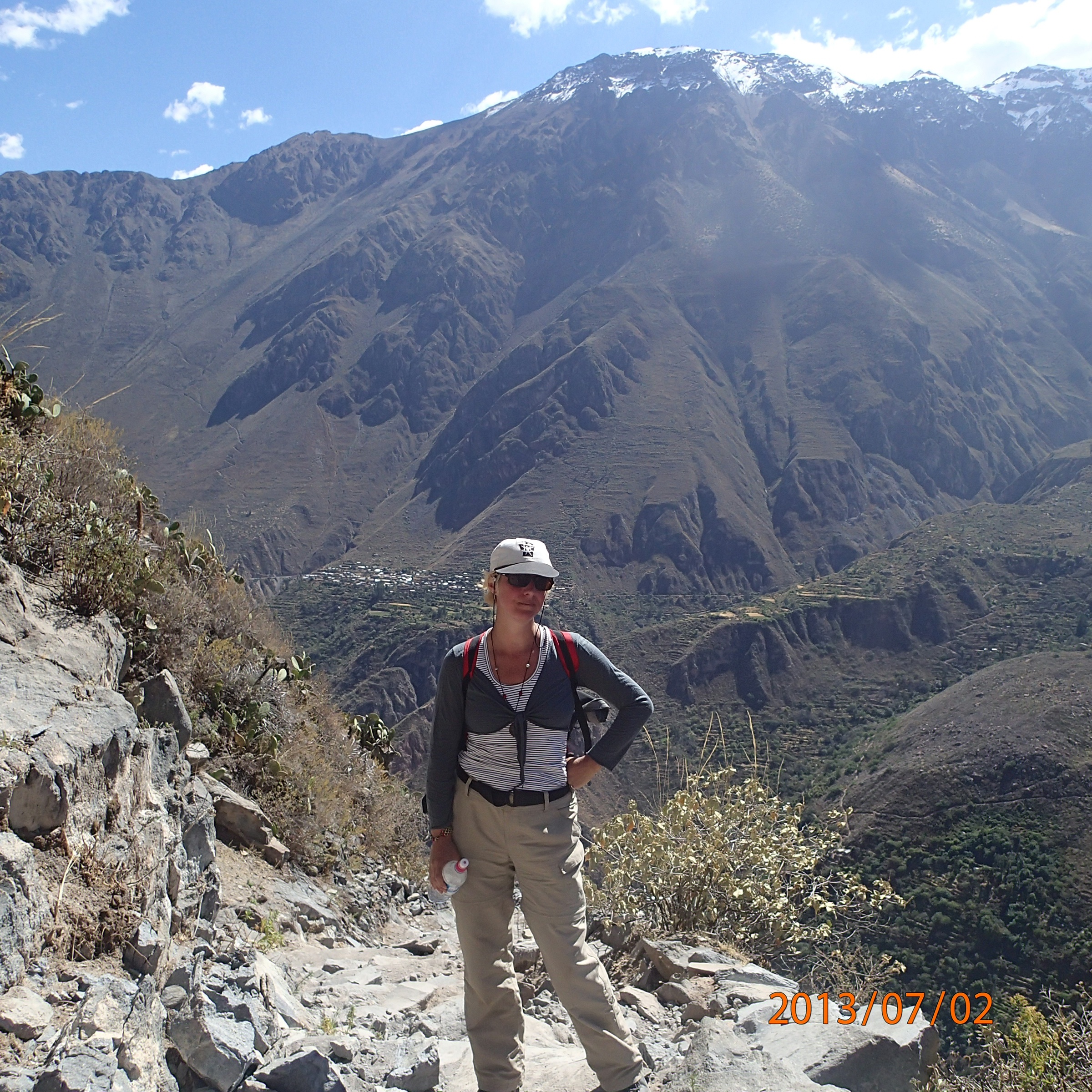 Arequipa – Tour au Cañon del Rio Colca: bon c’est mieux quand on est sur la photo que juste le paysage, non? Notez que c’est quand même remarquable comme endroit avec ces montagnes majestueuses…en arièere on voit le petit village où je crois qu’on a été diner