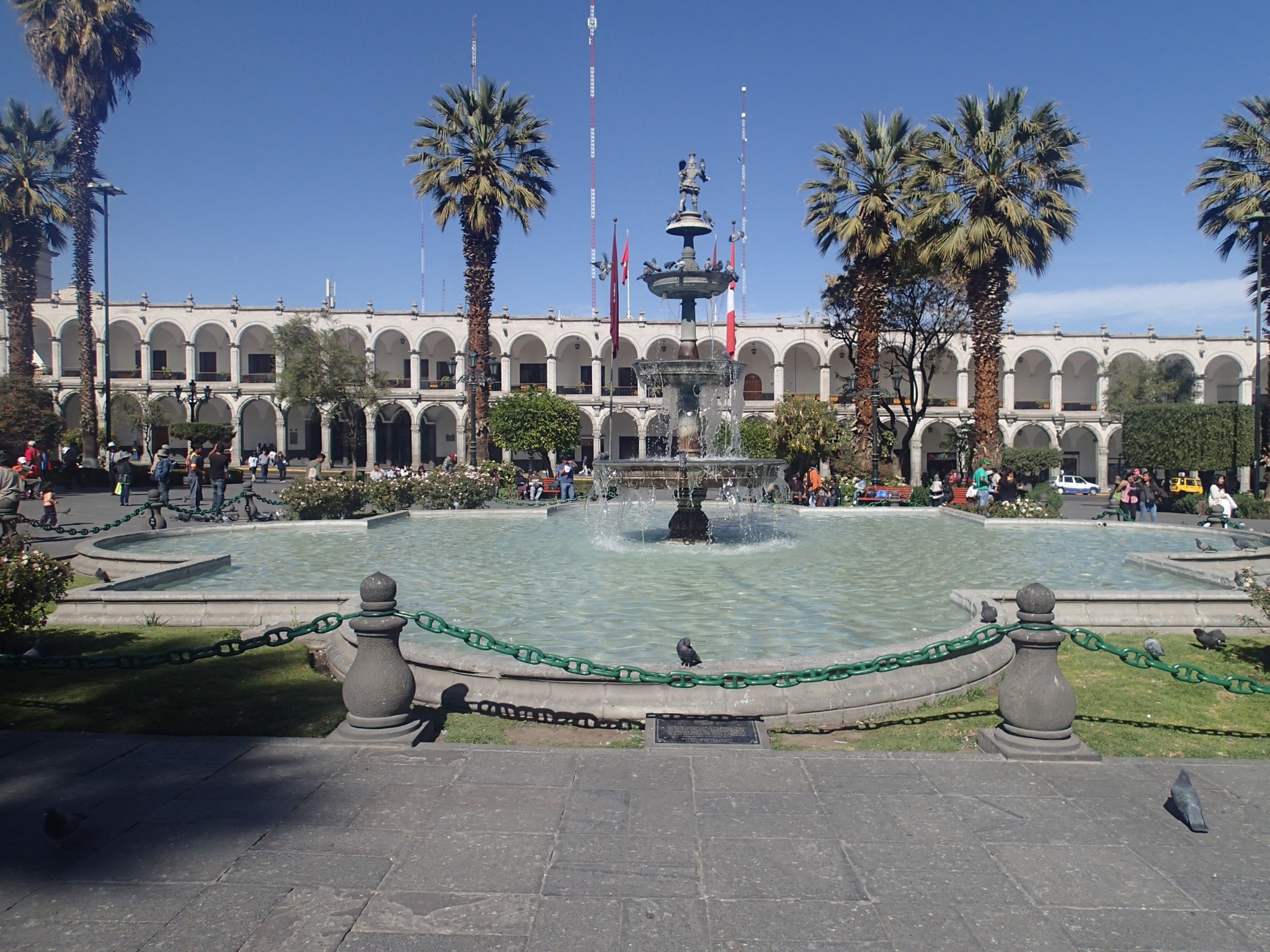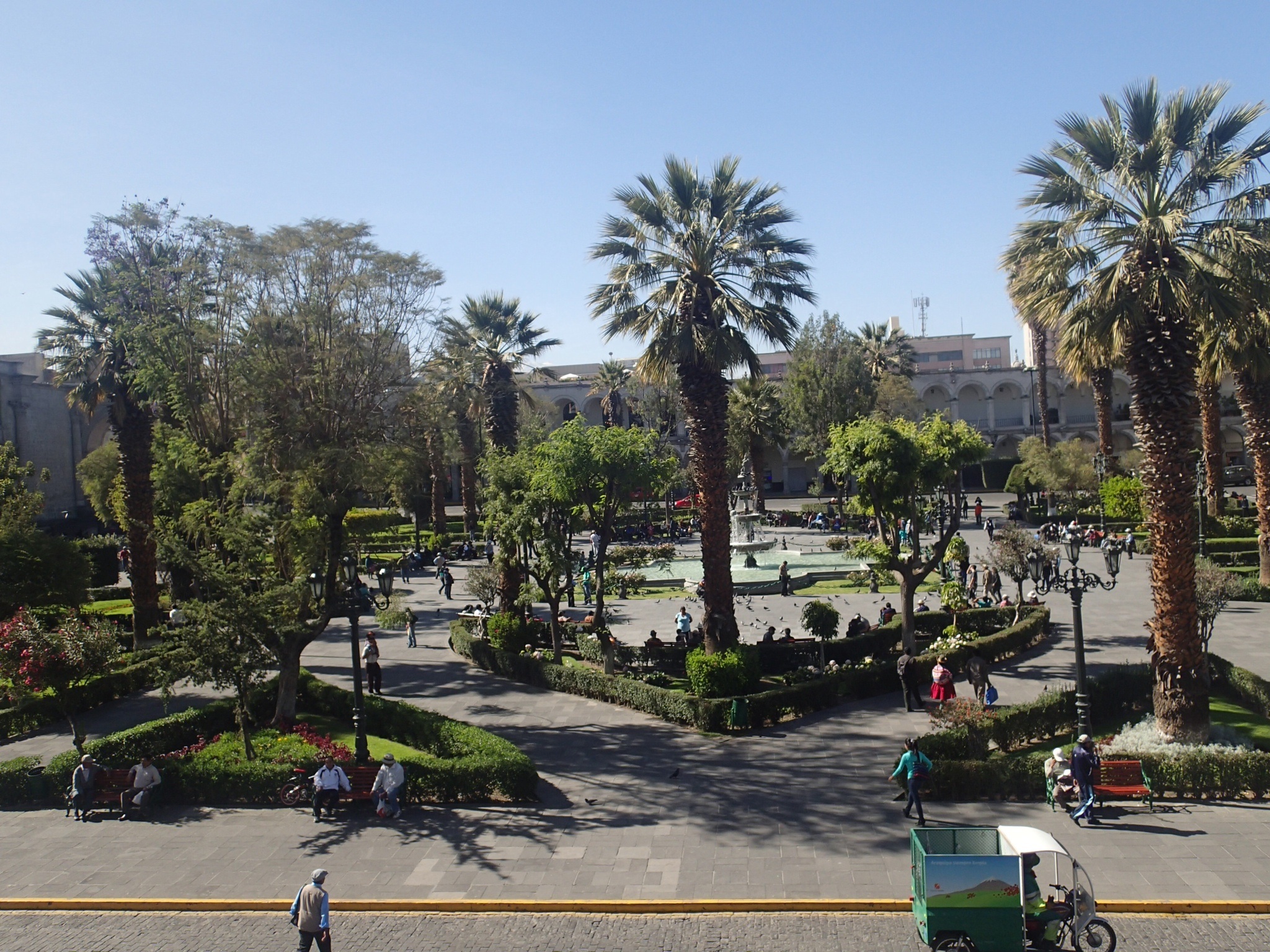 Arequipa – la plaza vue du resto…(ça ressemble au parc de la ville de Sucre en Bolivie)