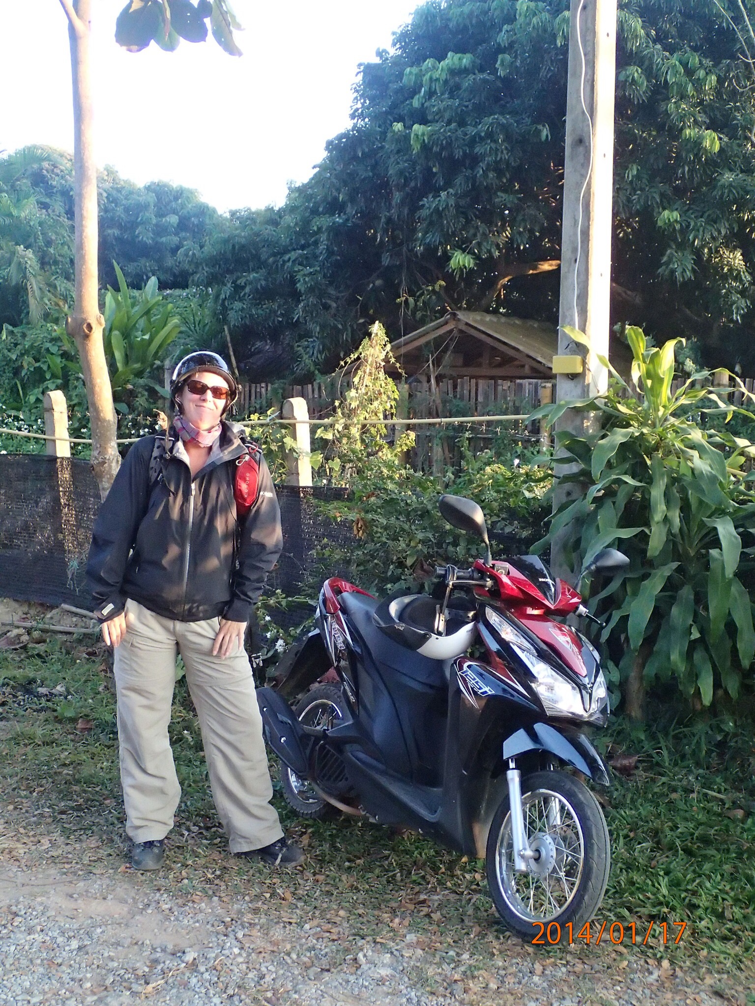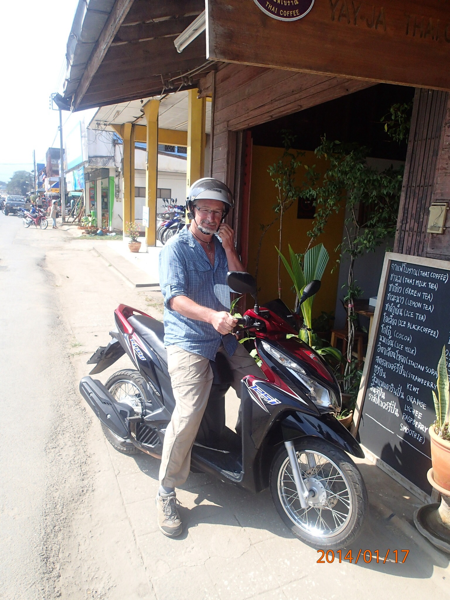 nous avions déjà vue à Chiang Mai. Direction comfort food au centre (un autre centre) du bazard avec aussi scène et spectacle. Cette fois on va chercher notre nourriture dans une des dizaines de petit food shop autour et on bouffe à une table au hazard. On choisi une espèce de fondue chinoise (hot pot) mais à la Thaïlandaise; c’est génial, le plat à fondue est chauffé avec des copeaux de bois! Excellent même si on improvise la façon de faire cuire tout les ingrédients! Puis dodo!Petit déj. et on aura notre 125cc automatique vers 10:00. Oui oui on s’en va en moto à la frontière du Myanmar! Donc c’est presque partis… Denis pensait que Nath conduirait et Nath voulait que Denis conduise car un peu anxieuse d’avoir un