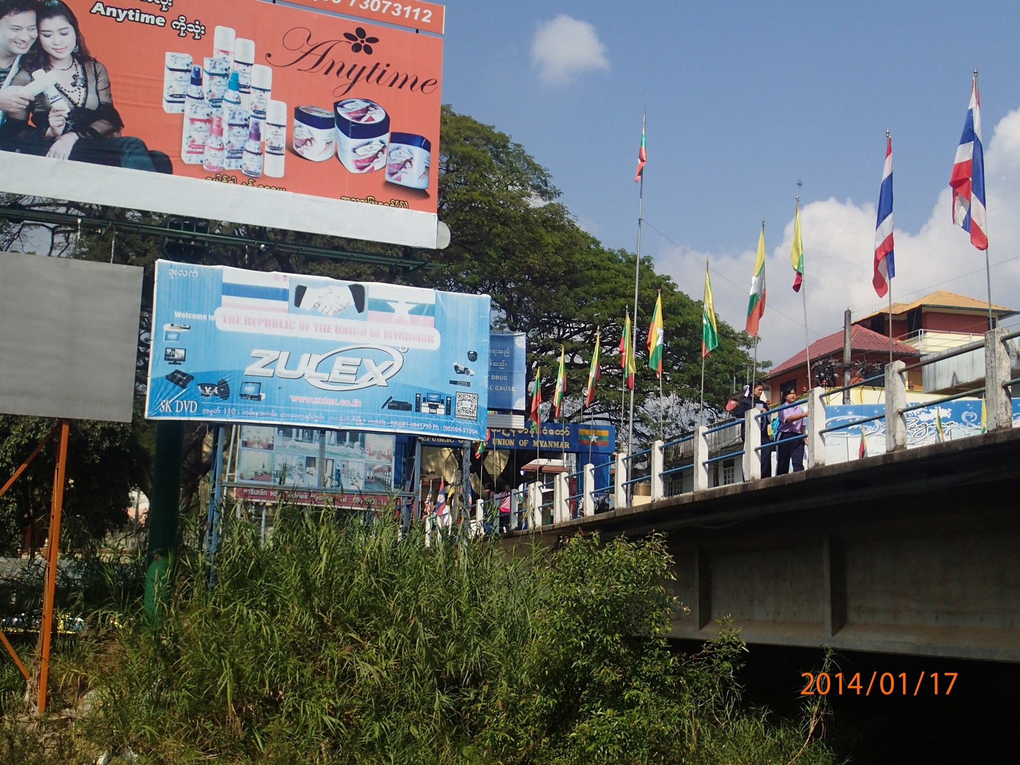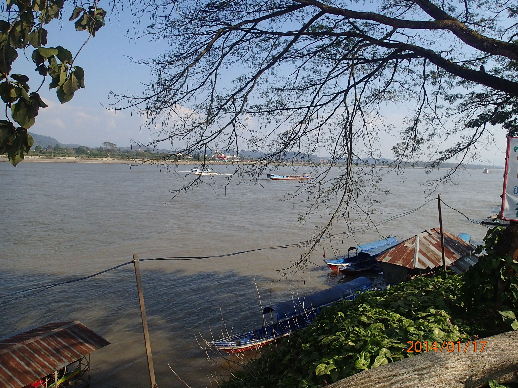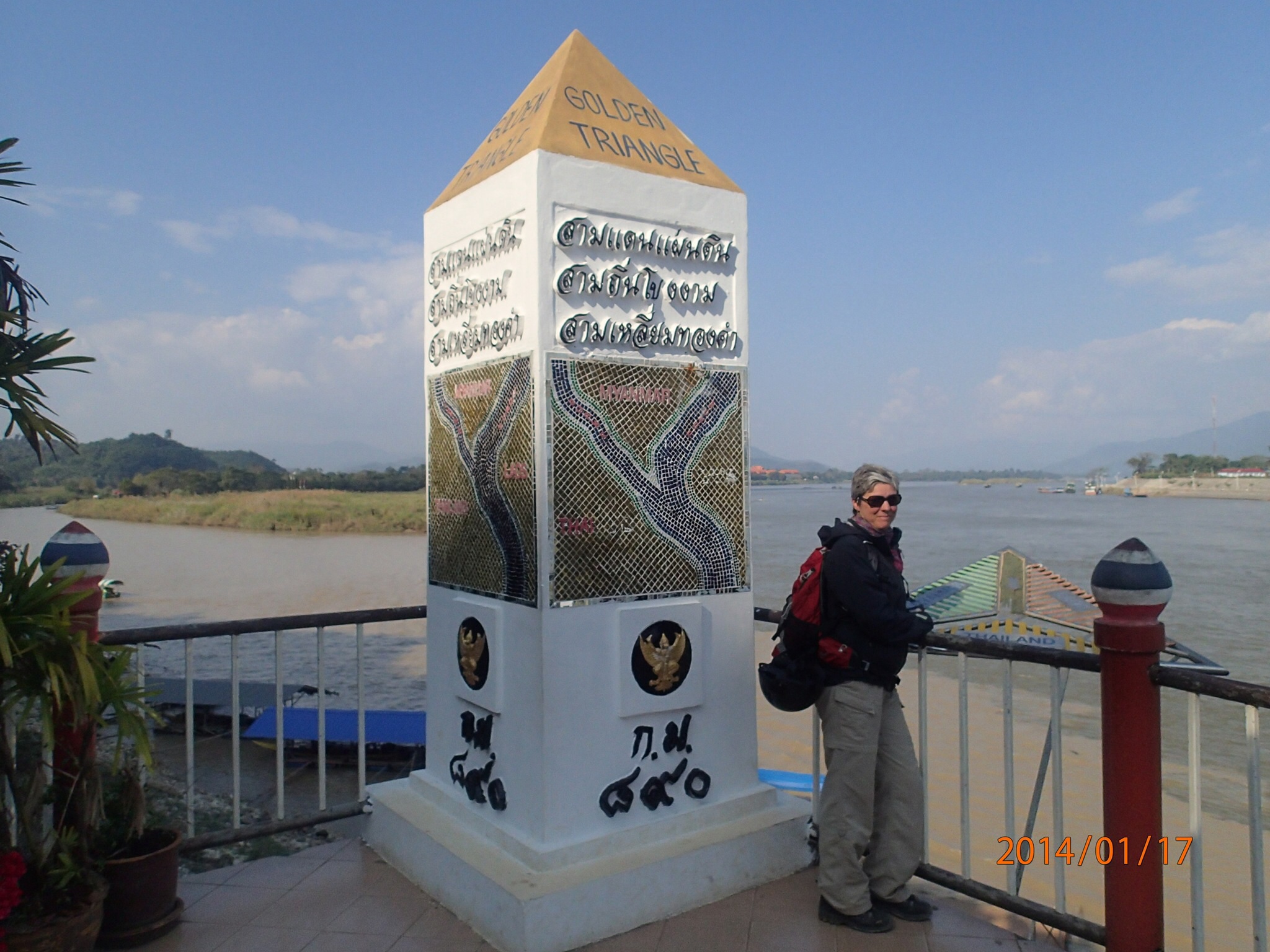 Arrivés à Mae Sai on aperçoit le pont frontalier donnant sur la Birmanie et la file de véhicules attendant de passer la douane, vrai ville frontalière avec une rue principale bondée de kiosques et boutiques. On spot un resto juste au bord de la rivière à coté du pont. Bon dîner typique: riz, poulet et Fried Spring rolls! Puis direction le triangle d’or, là ou les trois pays se rejoignent sur le Mekong i-e: le Laos, la Birmanie et la Thaïlande. Intéressant de voir cet emplacement extrêmement touristique (parait que ce n’est même pas le vrai emplacement car avant le triangle d’or était l’endroit où l’Opium se transigeait entre les pays). Ça vaut quand même