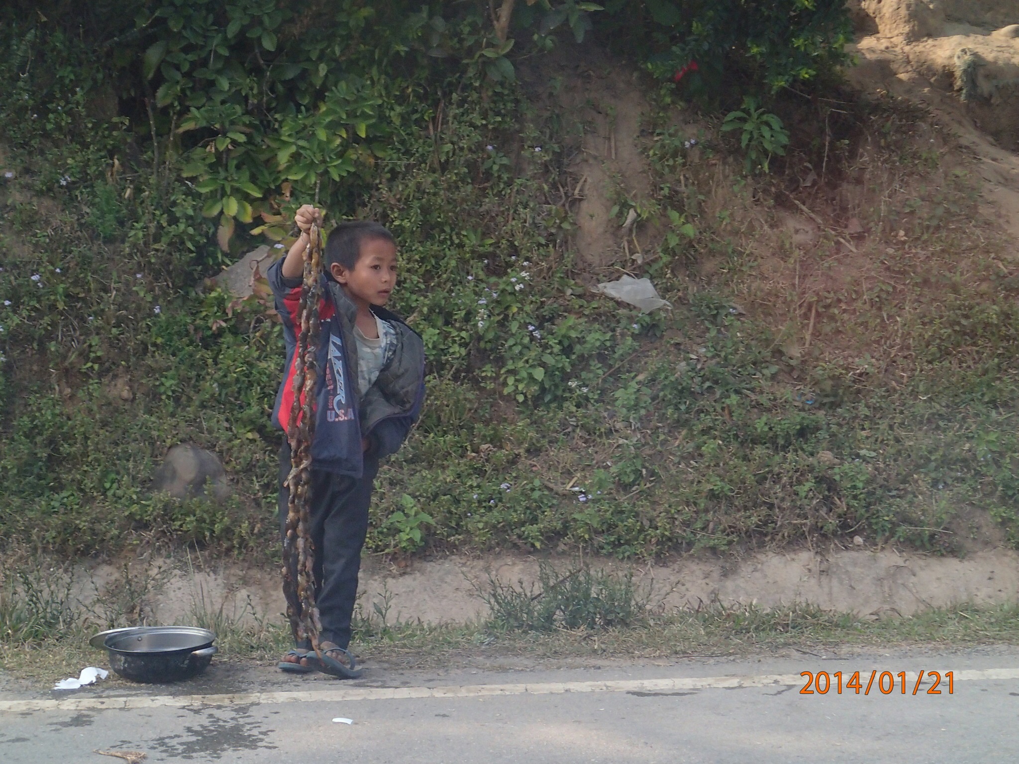 Ah oui, il était sur le chemin à vendre cet espèce de chapelet au passant, nous on était dans l’autobus! On croit que c’était des touts petits poissons enfilés!