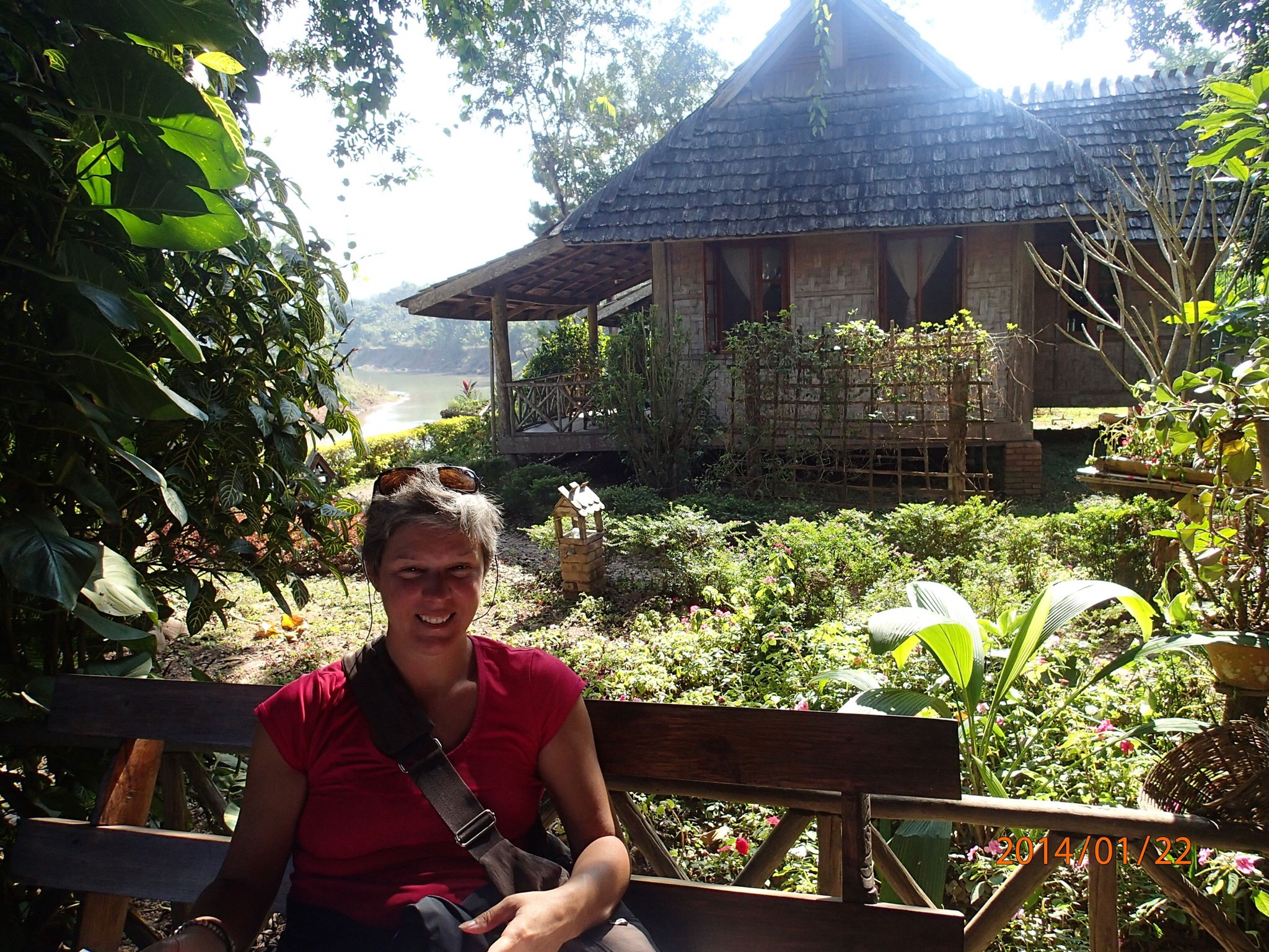 sort de la brume que vers 10h30 et plus! Déjeuner au Café gourmet où on trouve une place à l’intérieure à l’abris du vent et c’est excellent! Changement de Guest House puis après s’être installés, on décide de parcourir les alentours à vélo. On enfourche nos montures et direction un resto que Nath veut essayer en dehors de la ville (le Boat Landing). Après avoir cherché un peu on y est! Wow, terrasse ouverte sur la rivière et tranquille avec aussi de jolies maisonnettes en bambou louées (guest house). En entrant, un