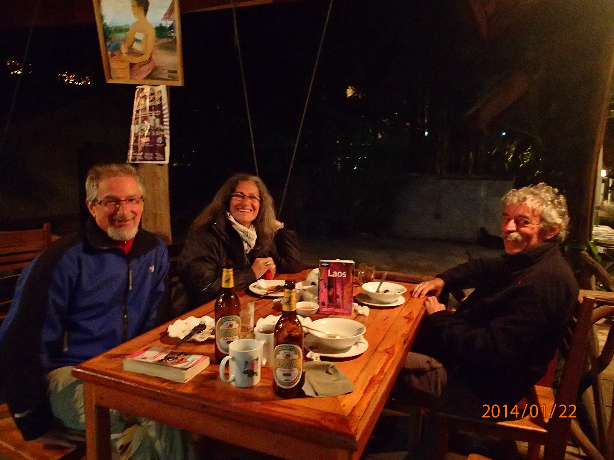 n étant accompagné par un petit chaton! Pendant que nous mangeons et entre nos miam miam et les miaou miaou du minou, un des Laotiens vient nous offrir de leur bière whisky que nous ne pouvons refuser (enfin Denis car Nath elle s’en sort!!!), pas si mal pour un mélange local!!!Puis 2 Parisiens, se joignent à nous où on discute de voyages et plein d’autres choses avec eux, ils