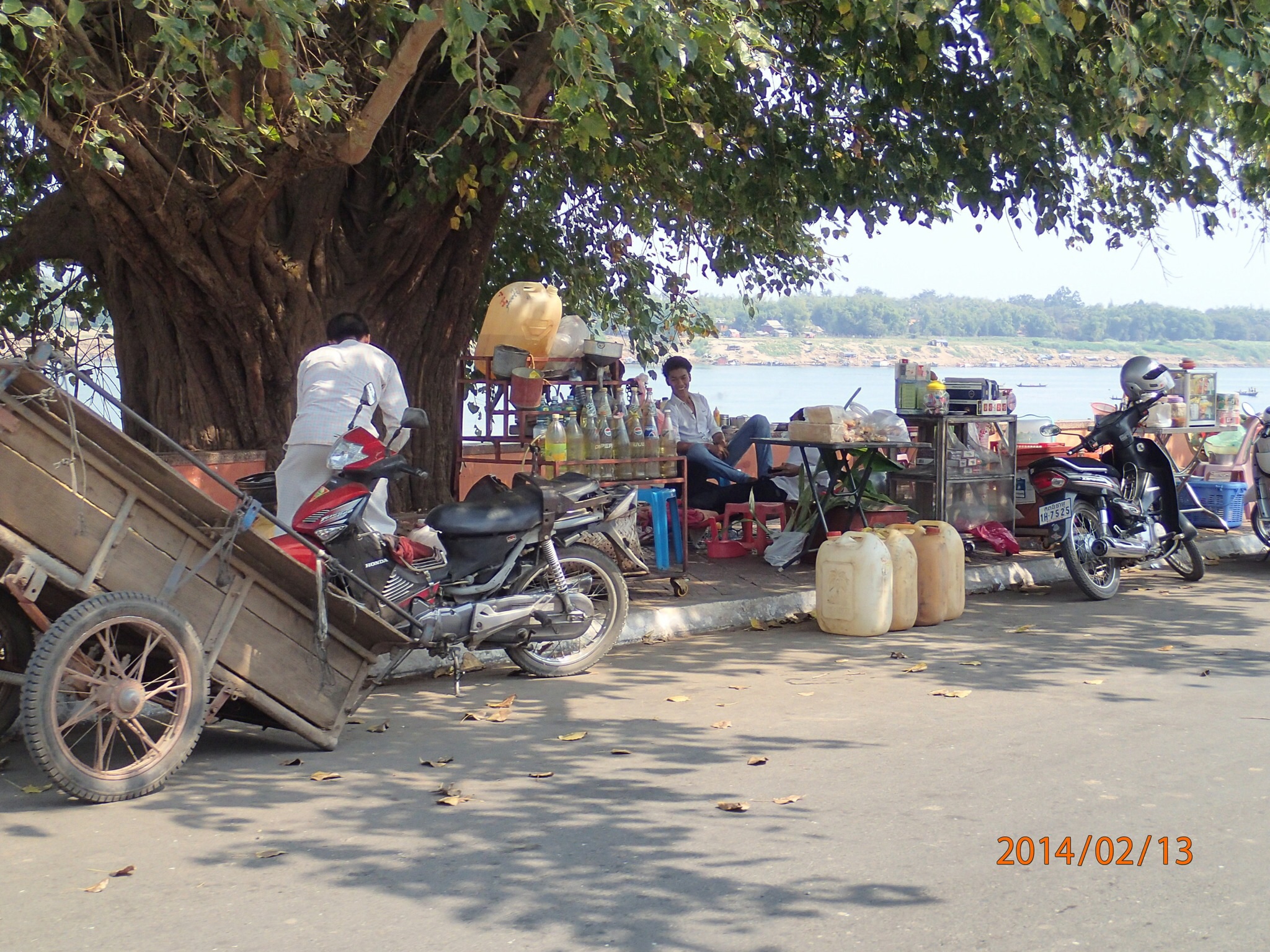 on arrête déjeuner à un guest house où le proprio est très sympathique (mais malheureusement ses chambres son loin de bien le représenter) tellement que nous allons y revenir plus tard pour d’autres services qu’il offre. Après avoir séché un peu, on continu nos recherches (lire pour Nath « on continu d’avancer sous soleil similaire au désert du Sahara »…bon je n’y ai jamais été mais je peux me l’imaginer) puis finalement on trouve un bon hôtel à un prix qui est dans notre budget.Pause (douche), puis on va prendre un verre au bord du fleuve à l’ombre, en