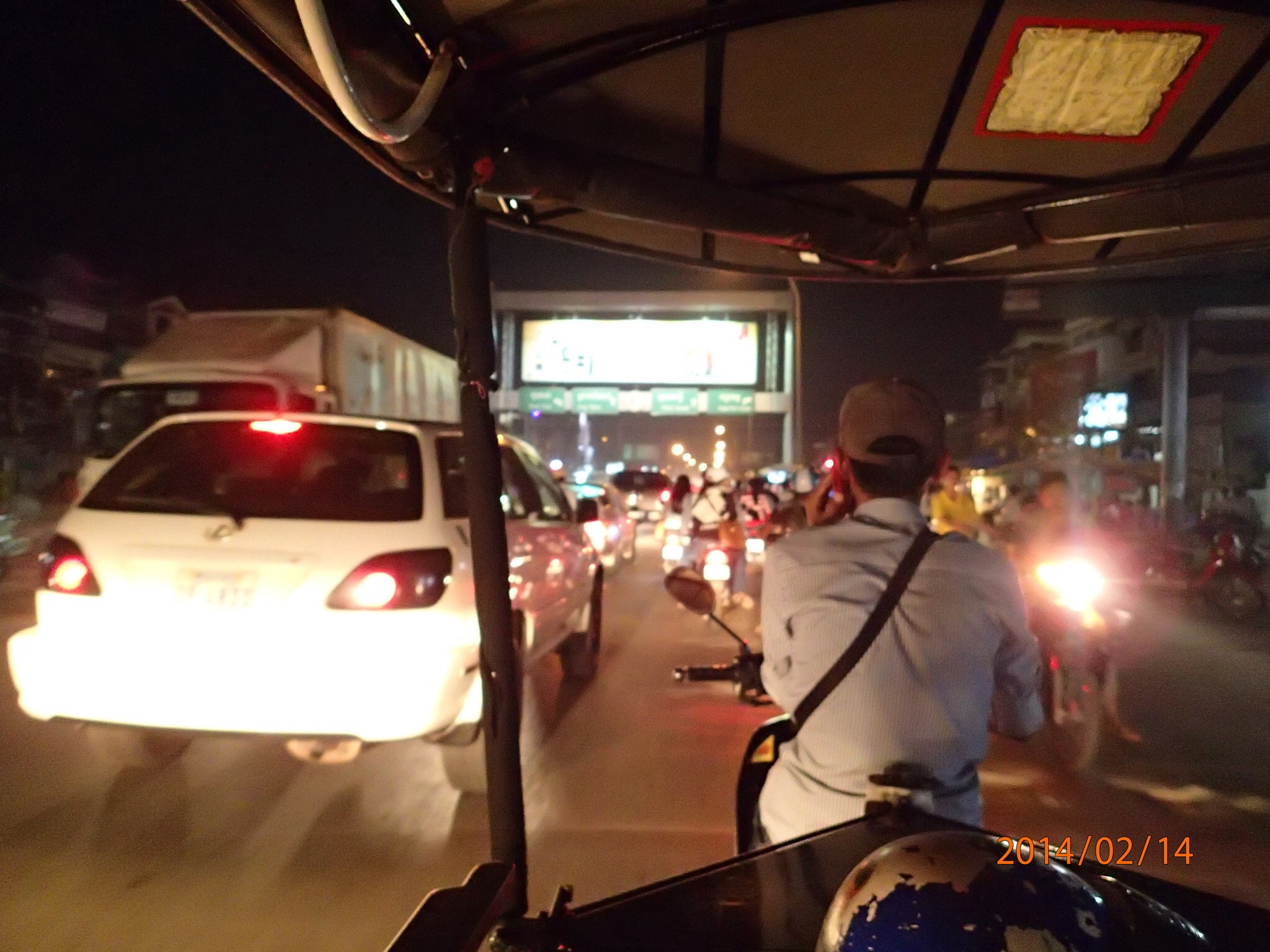 Après déj., et que Nath eu jasée avec une jeune Suisse, chef de cuisine qui parcours le monde quelques mois par année, départ de Kampong Cham. On part cette fois en bus local mais très confortable, ce sera ~6 hrs de transport sur une route disons-le: quand même assez belle! Petit arrêt pour diner mais on a pas vraiment faim, quelques beaux paysages et puis on arrive, hourra! Scénario habituel c’est la valse des tuk tuk…on marche jusqu’à notre hôtel. On a aucune idée où il est, mais tout en répondant à un chauffeur insistant où nous allions et voyant son lâcher prise immédiat en lui mentionnant notre intention, on était certain que c’était tout prêt. Quelques minutes plus tard on aperçoit l’enseigne, cool car y fait très chaud, soleil de plomb et pour finir on est tout mouiller (encore).
