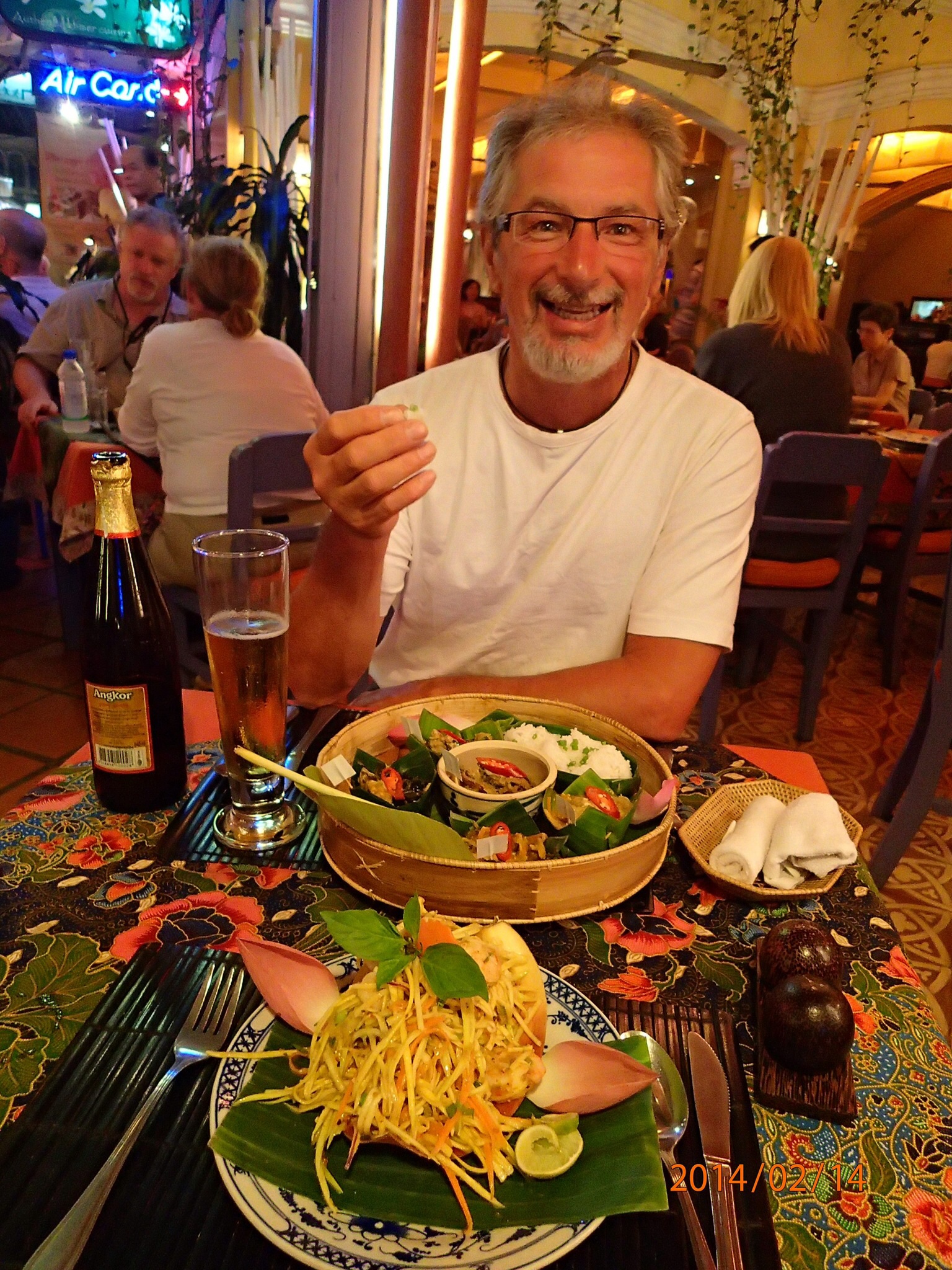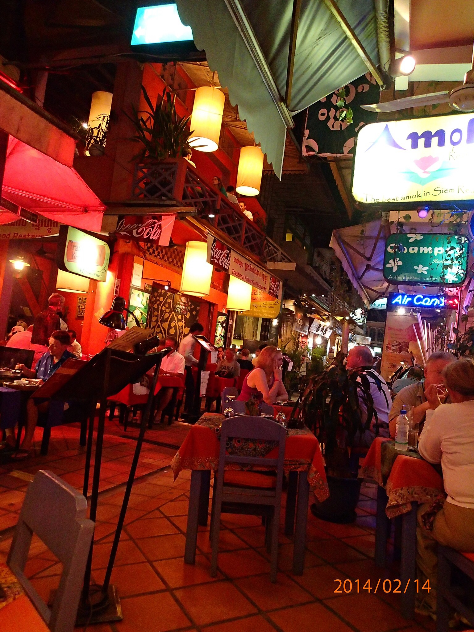 plénitude de restaurants pour tous les goûts. Souper au « Amok resto » où on a pris une assiette de dégustation d’une spécialitée Khmer: le Amok bien sûr, apprêté de cinq façons différentes, miam, miam, un régal! Petite marche dont la rue « Pub Street » et retour pour 21:30 car c’est le plus tard que le tuk-tuk revient nous chercher.