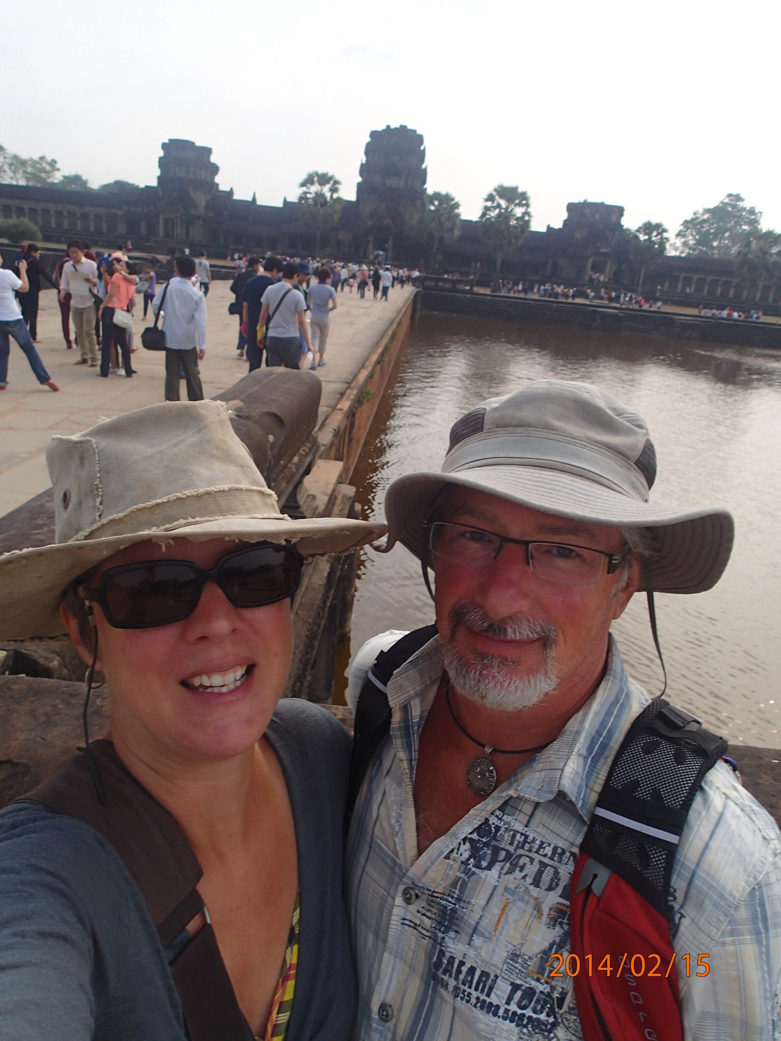 soit on est fou) mais il faut également se tenir en forme en voyage et n’oublier pas on est paumé car on a plus de job!!! Après déj. (lire petit déj pour nos lecteurs français), on est sur la route dès 8:30 pour aller chercher nos passes. Quelques kilomètres plus loin on arrive à l’entrée, beaucoup de monde mais ils sont vraiment bien organisés et en moins de deux minutes on a nos passes (3 jrs avec photos pour $40!) et on entre sur le site. Longue route droite bordée d’arbres majestueux, et on est chanceux pour l’instant c’est nuageux…encore quelques kilomètres et nous y sommes: le Angkor Wat!!!Angkor Wat
