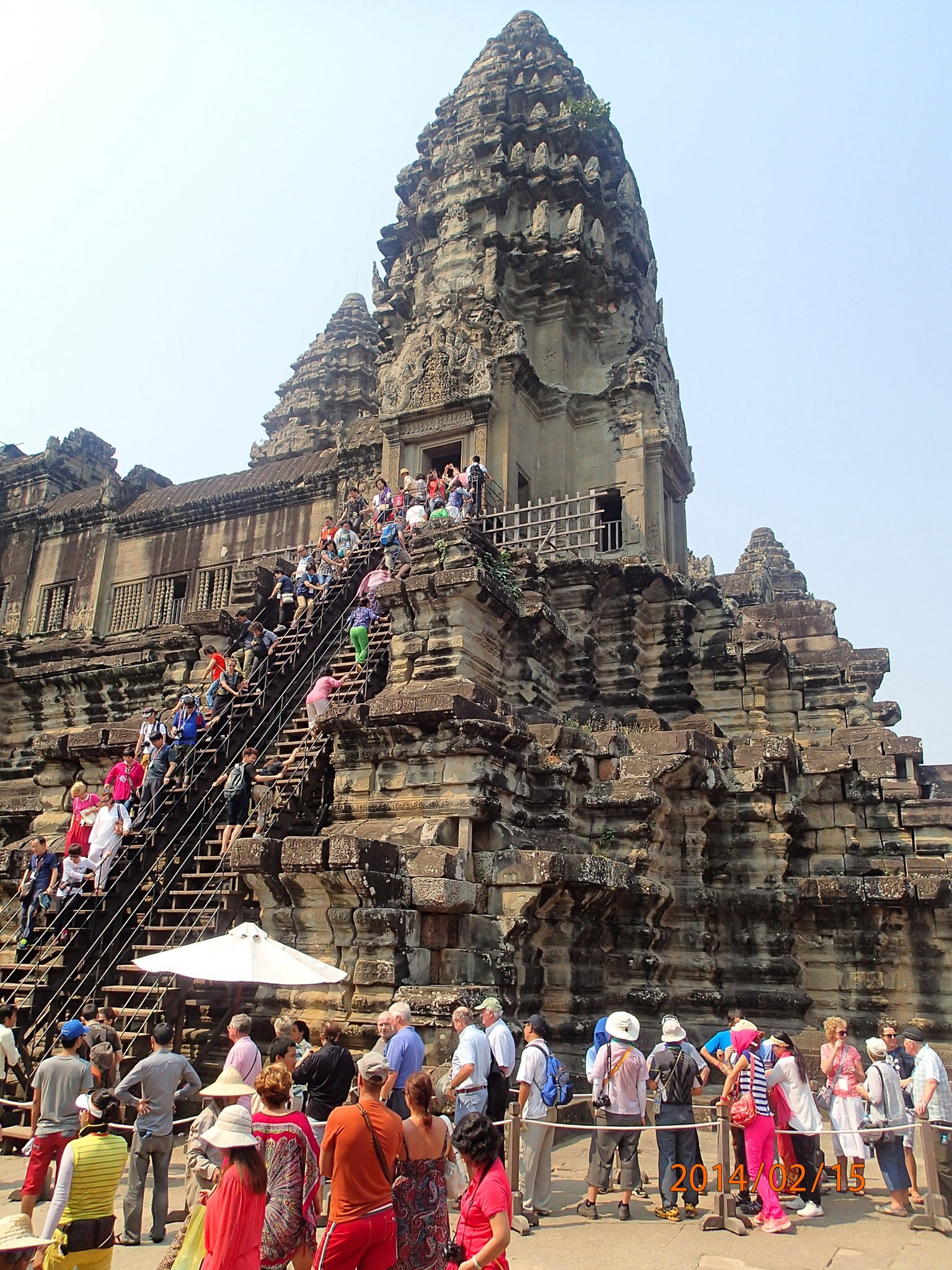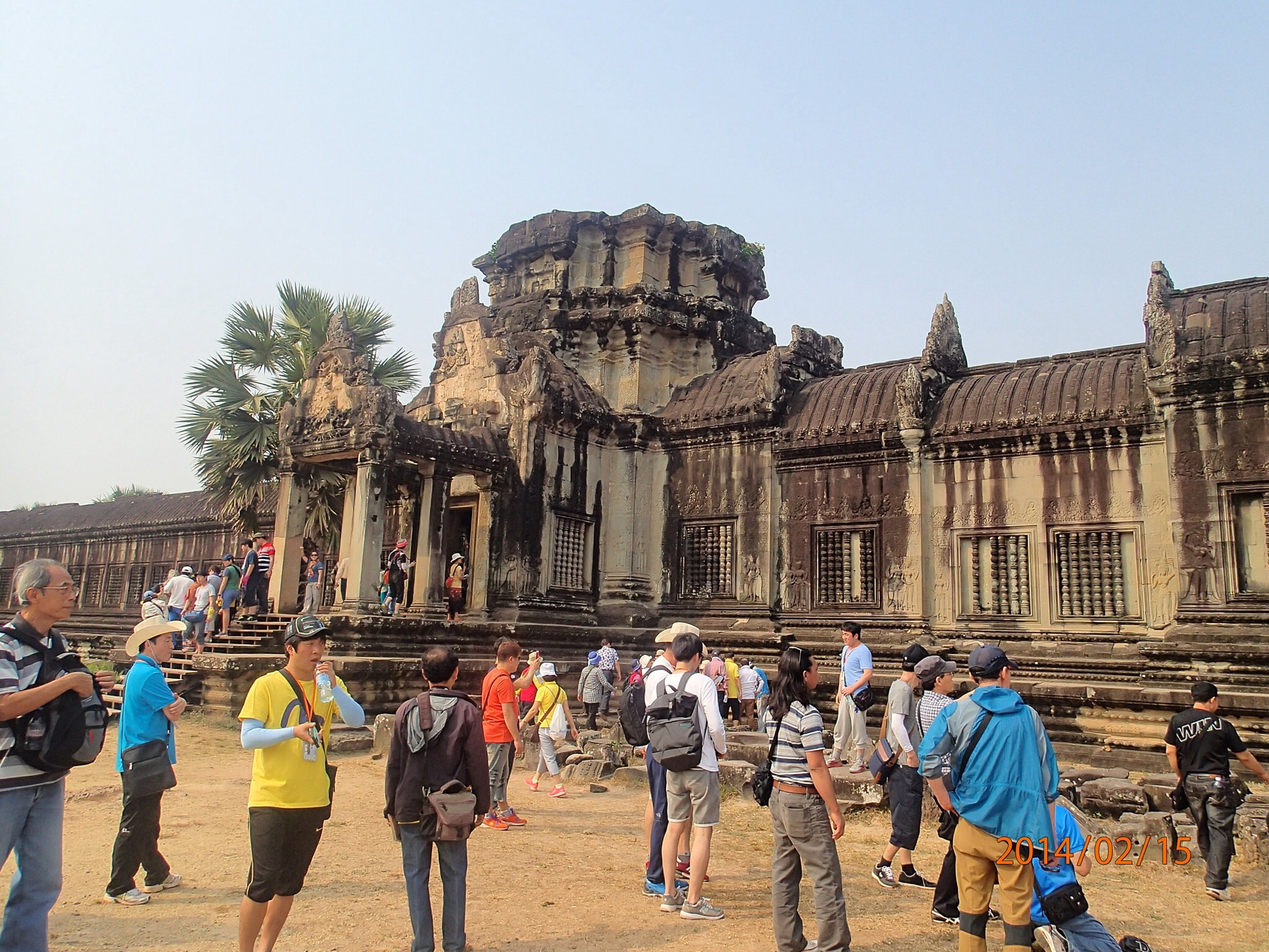 soit on est fou) mais il faut également se tenir en forme en voyage et n’oublier pas on est paumé car on a plus de job!!! Après déj. (lire petit déj pour nos lecteurs français), on est sur la route dès 8:30 pour aller chercher nos passes. Quelques kilomètres plus loin on arrive à l’entrée, beaucoup de monde mais ils sont vraiment bien organisés et en moins de deux minutes on a nos passes (3 jrs avec photos pour $40!) et on entre sur le site. Longue route droite bordée d’arbres majestueux, et on est chanceux pour l’instant c’est nuageux…encore quelques kilomètres et nous y sommes: le Angkor Wat!!!