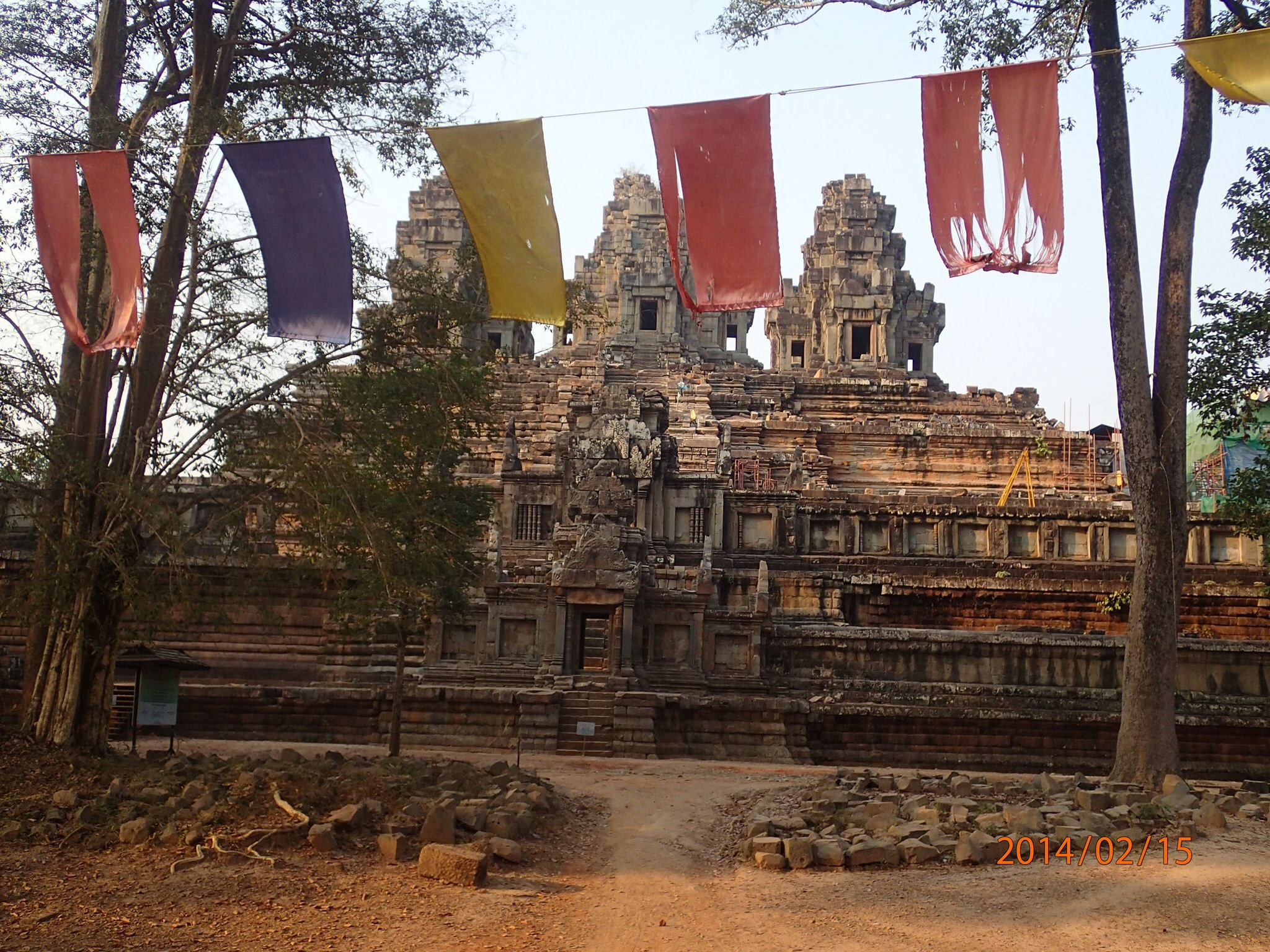 Deuxième journée à Angkor, cette fois on fera le chemin inverse (toujours à vélo) afin de débuter par la fin et revenir par la route ombragée (moins pénible en fin de journée). Cette fois on part plus tôt mais définitivement pas encore assez tôt… Il aurait fallut partir dès le soleil levé! Encore chanceux pour le moment car la journée débute sous les nuages et les arbres de notre chemin ne sont pas à maturités! Notre objectif est de voir les monuments les plus populaire que nous avons sélectionné sur notre itinéraire tout en revenant profiter de la piscine en après-midi…pis tant pis pour les autres on ira sur Internet les voir!Premier temple le Prasat Kravan (pas de photo), avec ses 5 tours fut un des premier temples