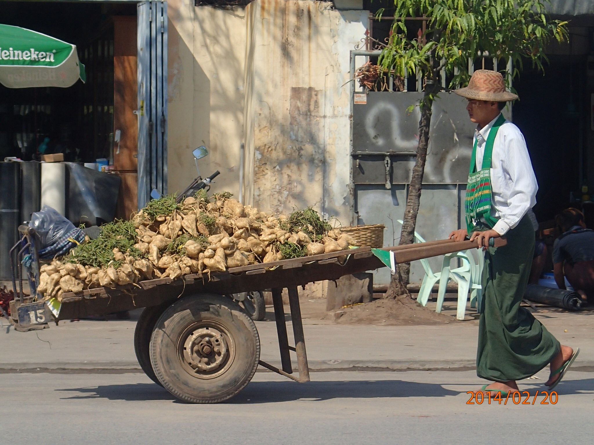 protège du soleil, évite la transpiration (attention mesdames c’est peut-être le truc pour les chaleurs) en plus d’être un anti-septique! Et les hommes ont les dents rouges foncés et pour beaucoup les dents abîmés. Ceci est causé par le bétel qu’ils chiquent et recrachent. Cela provient de la noix de bétel ou d’arak qui est enroulé dans une feuille de bétel avec de la chaux et parfois du tabac. Partout quand on marche on voit des tâches rouge par terre. Cela leurs procurent un certain bien-être en plus de leur couper la faim!Destination Mandalay