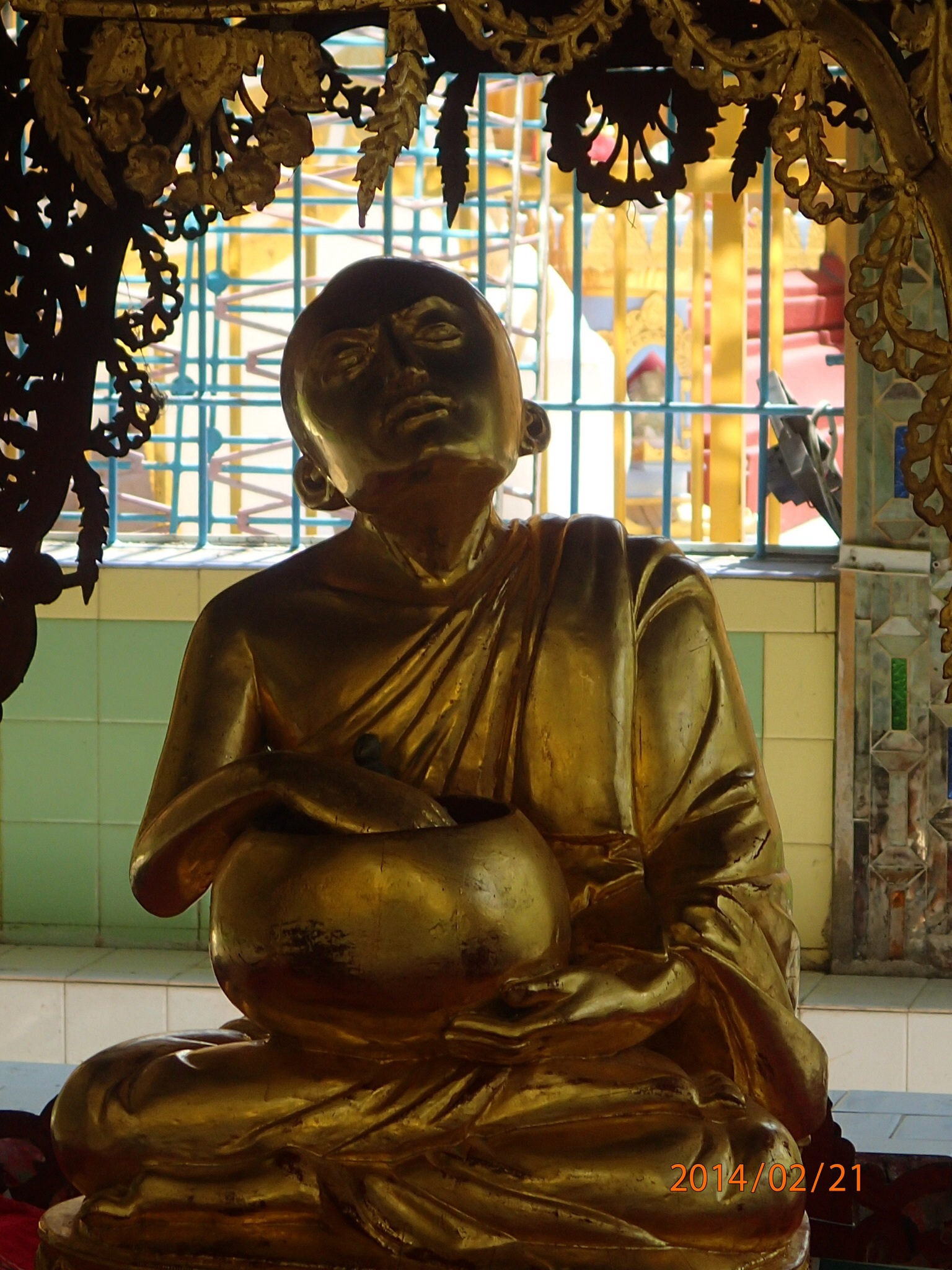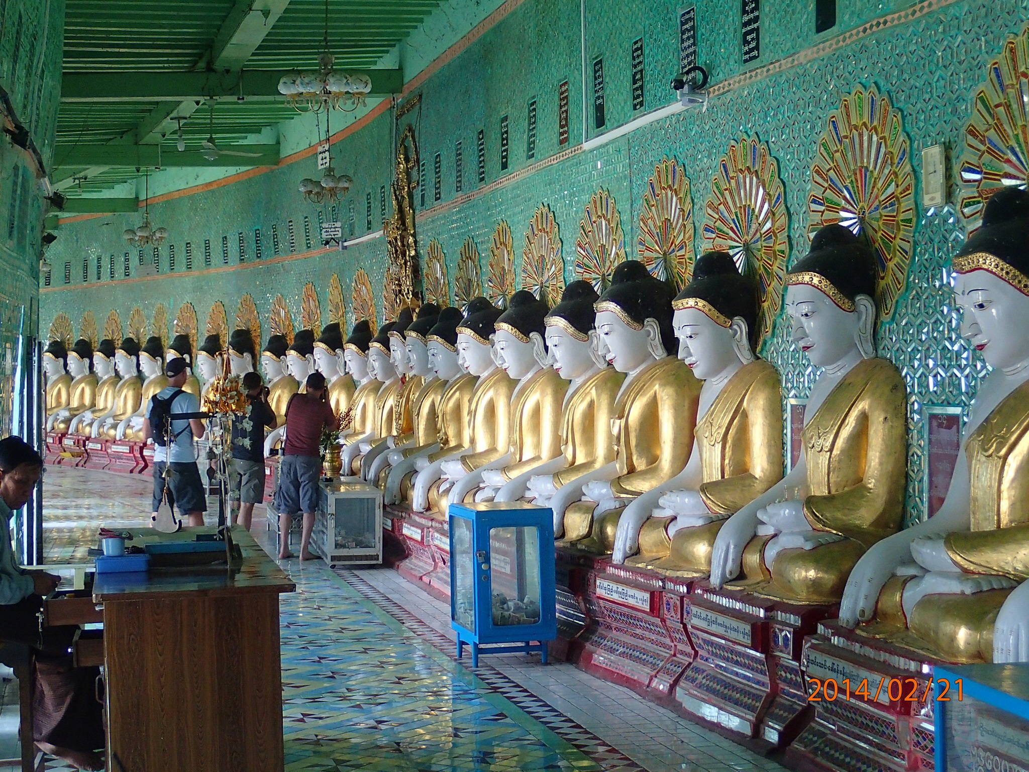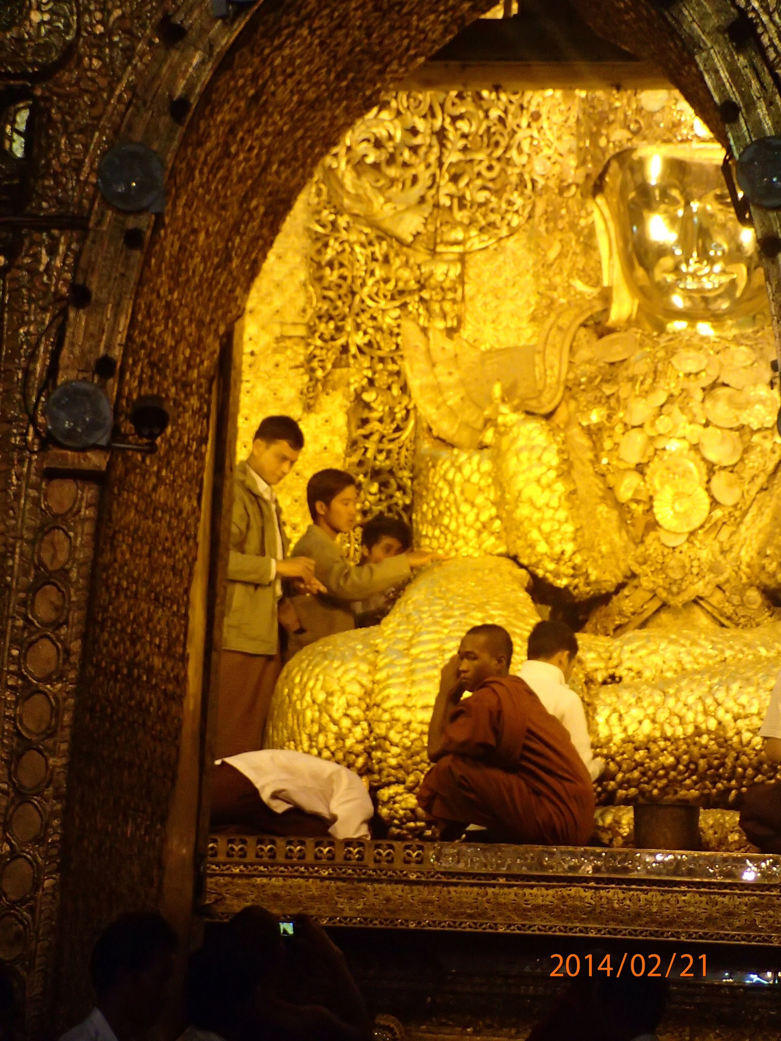 dame qui avait été si gentille hier et lui dire merci (rapidement car elle est très occupée), puis visite no.1: le Bouddha qui engraisse!!! Oui,oui, il parait que son volume à significativement augmenté et il est un peu difforme car ici les hommes (les femmes ne sont pas autorisées) viennent en grand nombre et de façon continue coller des feuilles d’or sur le Bouddha pour le remercier ou s’attirer des faveurs. À notre sortie, notre chauffeur n’est pas revenu encore alors Nath fait la lecture du temple pour se rendre compte que nous avons manqué plusieurs choses, on y retourne pour voir les statues khmer de bronze provenant du temple Angkor, le gong géant etc… Visite terminée, wow beaucoup plus que ce qu’on avait pensé!!!Alentours de Mandalay