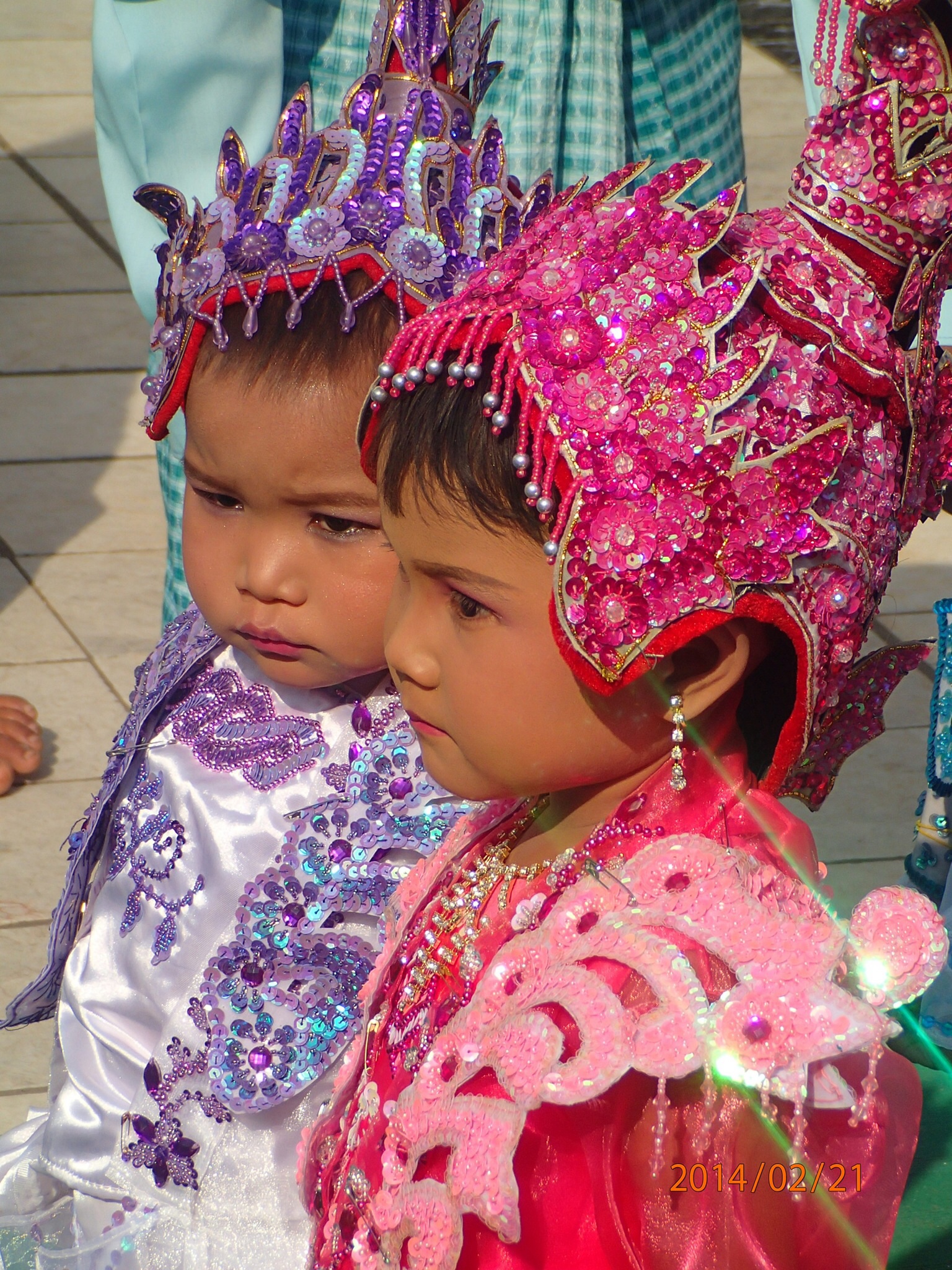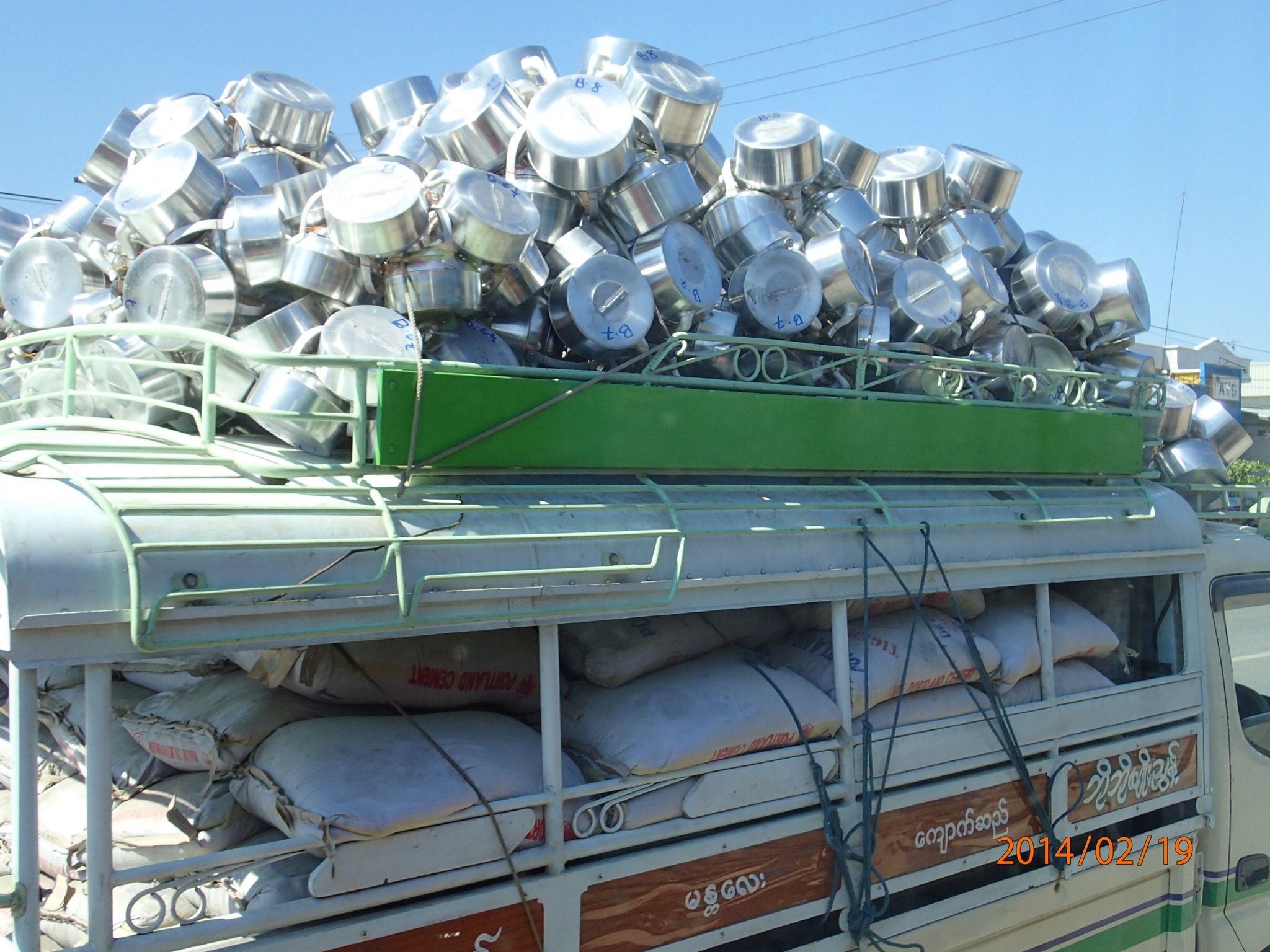 être qu’on devrait prendre exemple!) car déjà une route à 4 voies à été construite pour se rendre en ville! Puis on remarque que les hommes ici portent la jupe (longyi) à carreaux et les filles également, mais noué de façon différente. Et presque toutes les femmes et des fois quelques hommes, ont les joues couverte d’une crème jaune pâle avec