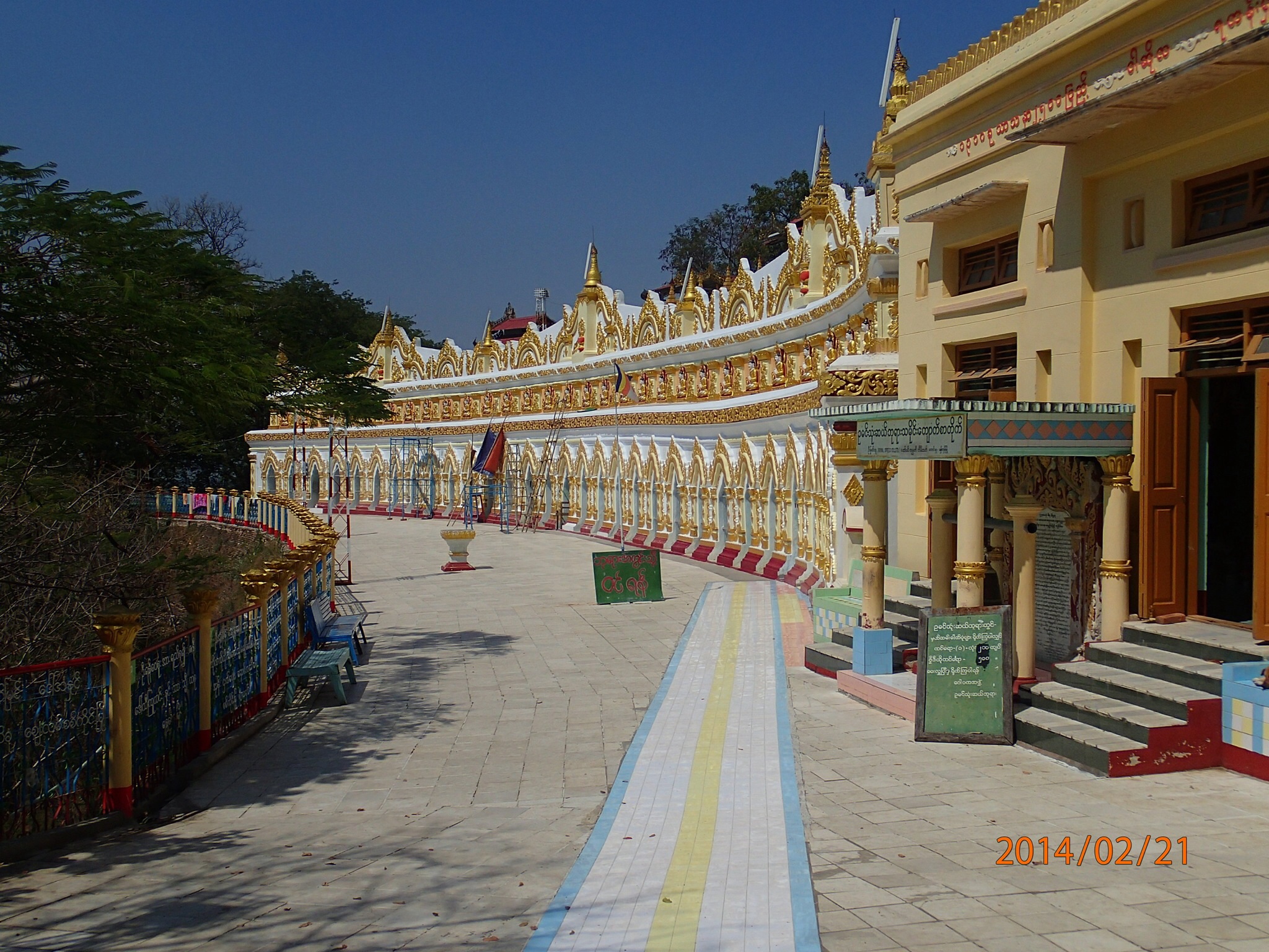 colline le Soon U Ponnya Shin Pagoda, celui-ci fait presque figure de décor un peu vieillot avec tous ses petits morceaux de miroirs intercalés de joints verdâtres (résultat fait un peu boule disco des années 70!) et un Bouddha immense doré au centre. Tout autour d’autres petites pagodes et une vue splendide des alentours dont la rivière Irrawaddy!
