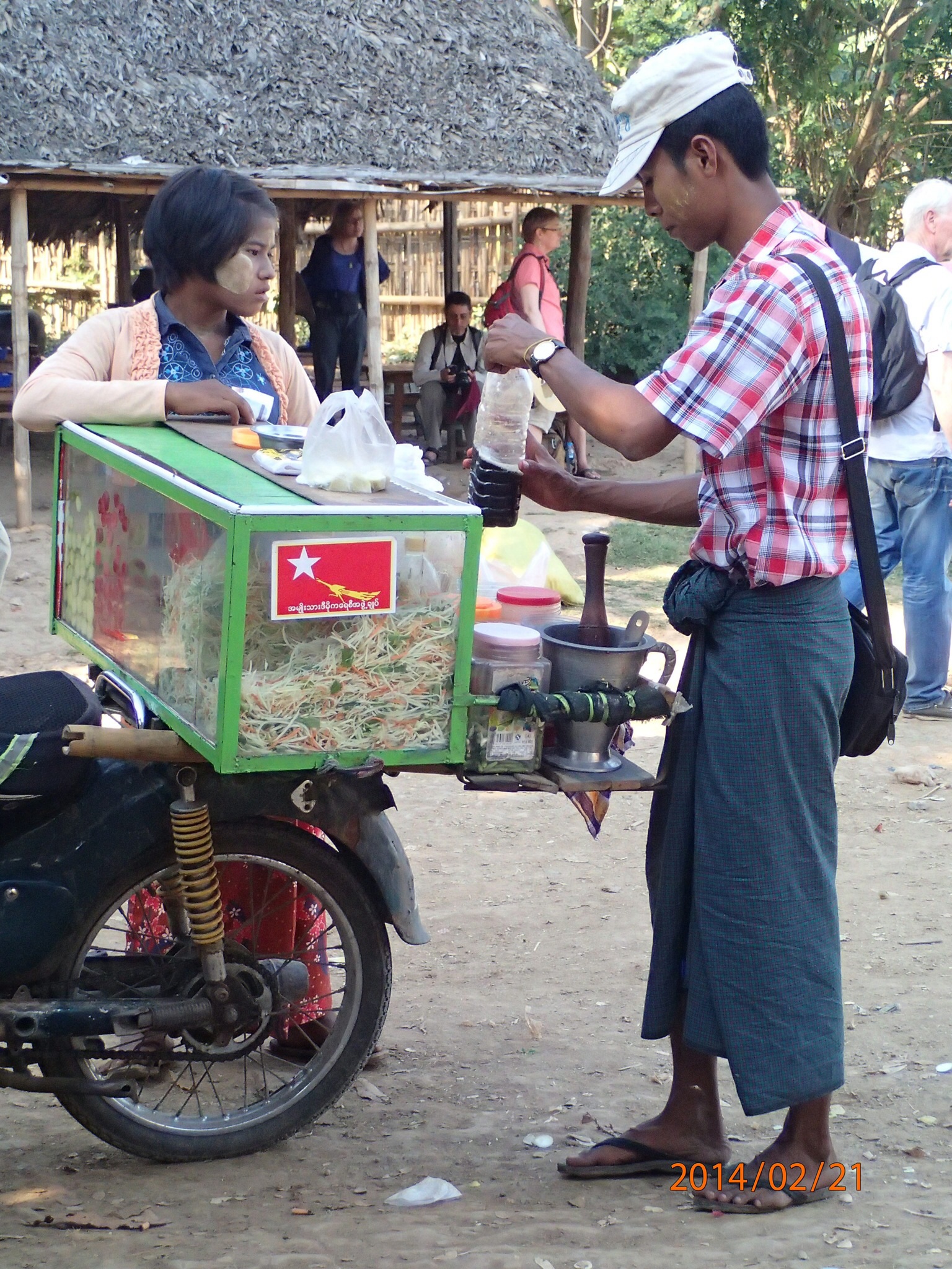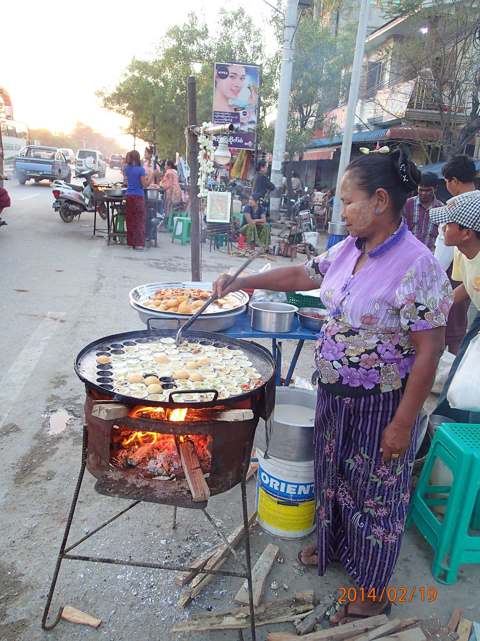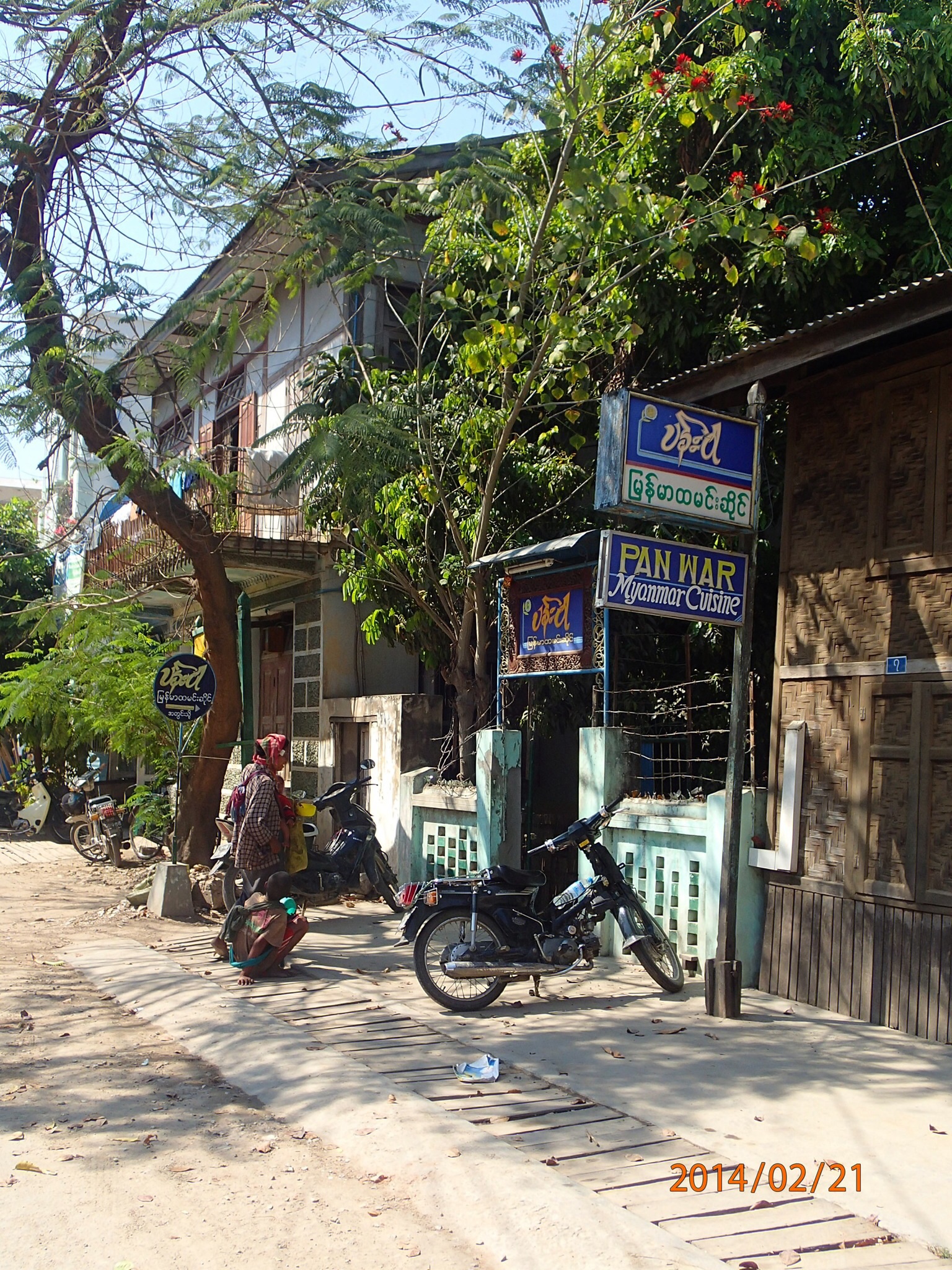 hop pour de la restauration vraiment typique du pays, ce sera lePanwar, genre de table d’hôte Birmane mais que l’on peut personnaliser, le proprio très attentionné (et coloré) nous fait la description des plats (ici pas de menus!) et c’est partis. Plusieurs plats sont disposés devant nous et là on se régale tout simplement, plusieurs locaux viennent diner ici et ne se gène pas pour en profiter et regarder les étranges se nourrir tout en nous rendant bien des sourire et Hello très sympathique. Très belle expérience culinaire et humaine!!!