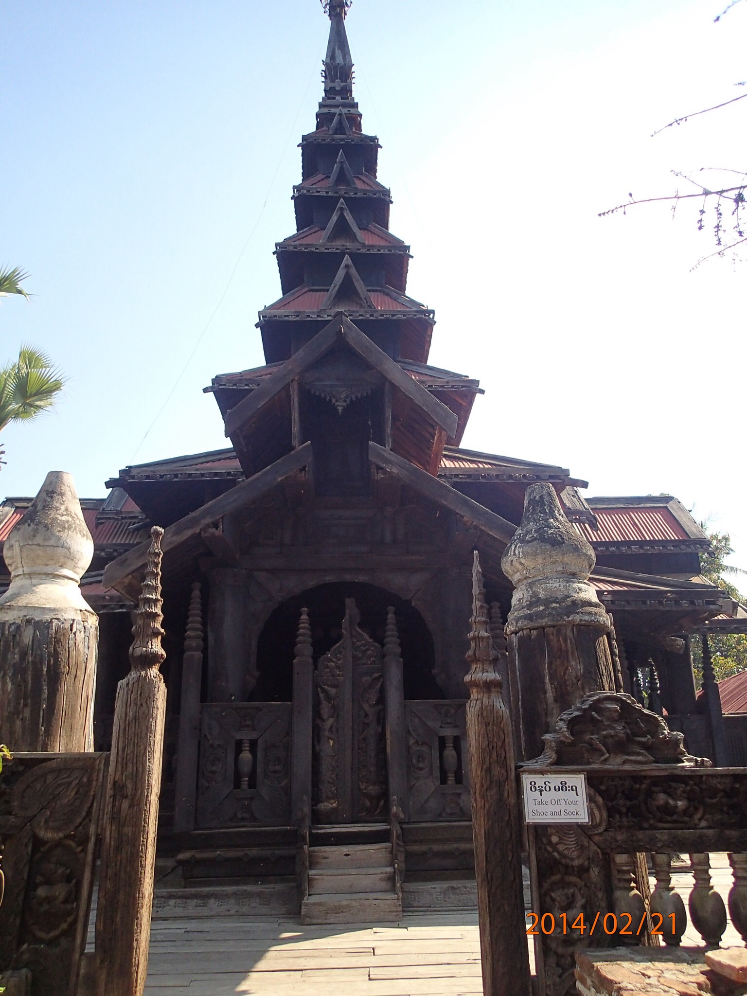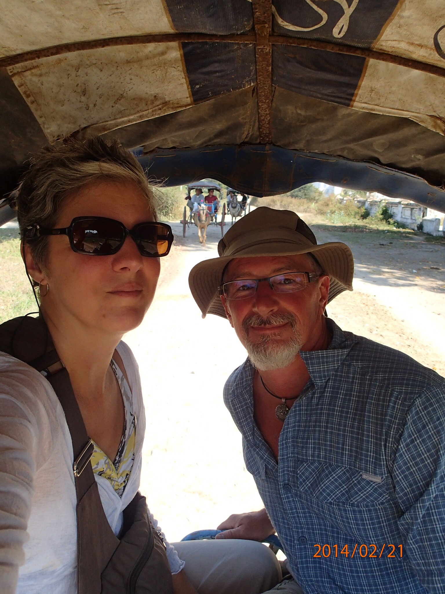 hop pour de la restauration vraiment typique du pays, ce sera lePanwar, genre de table d’hôte Birmane mais que l’on peut personnaliser, le proprio très attentionné (et coloré) nous fait la description des plats (ici pas de menus!) et c’est partis. Plusieurs plats sont disposés devant nous et là on se régale tout simplement, plusieurs locaux viennent diner ici et ne se gène pas pour en profiter et regarder les étranges se nourrir tout en nous rendant bien des sourire et Hello très sympathique. Très belle expérience culinaire et humaine!!!Direction Inwa (petite île artificielle) où on nous dépose à un embarcadère pour prendre un traversier polluant l’air (Nath est encore fragile aujourd’hui) et où une fois sur la terre ferme on nous attend pour faire un tour de