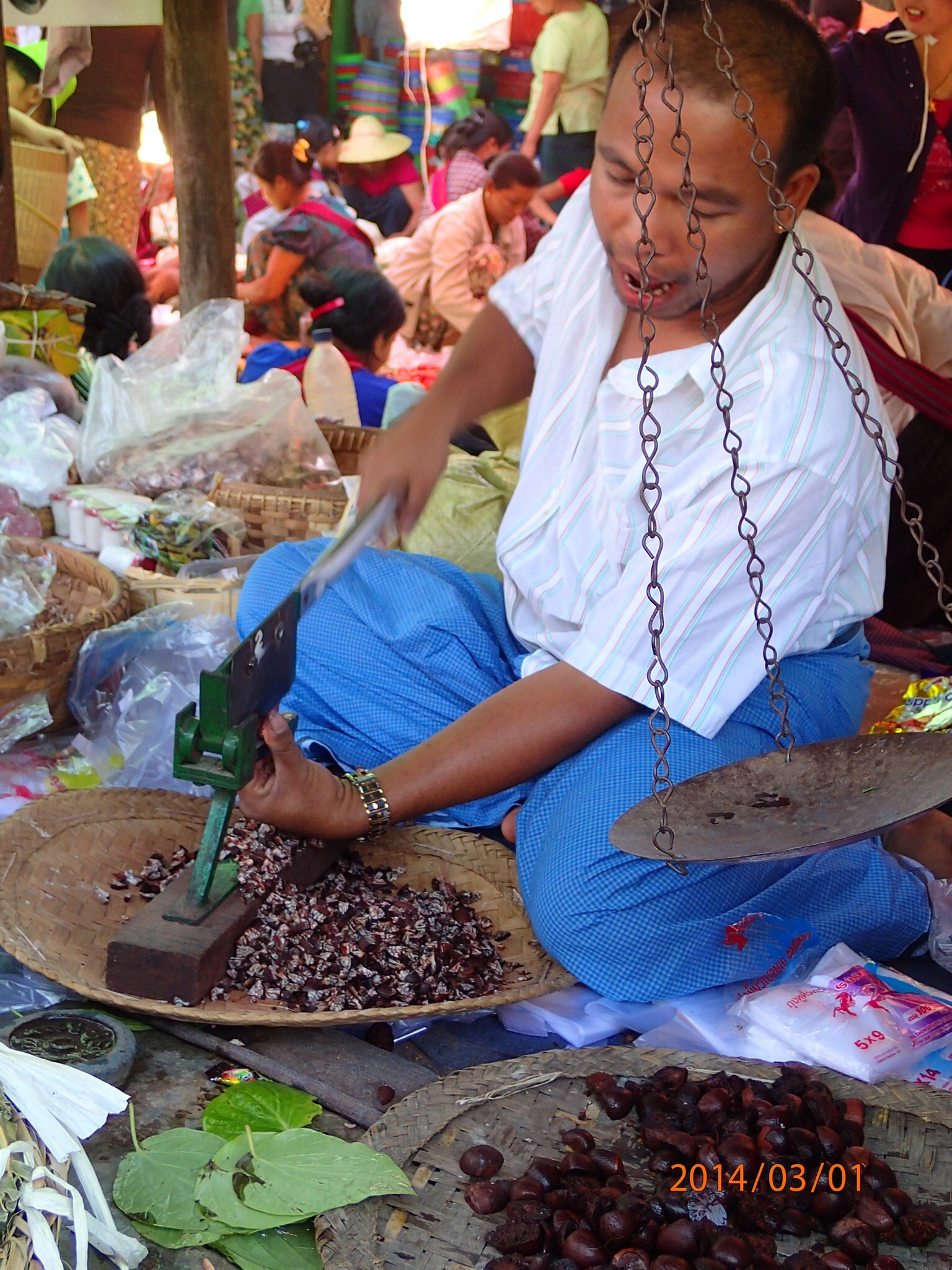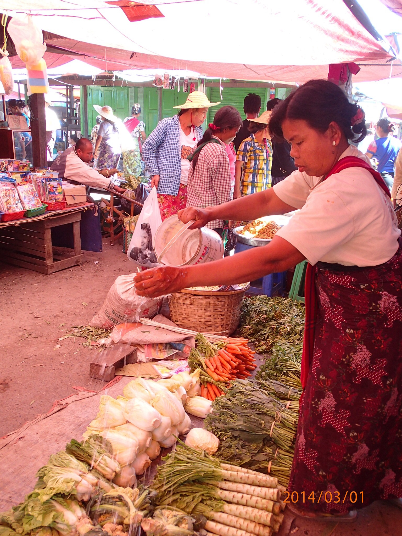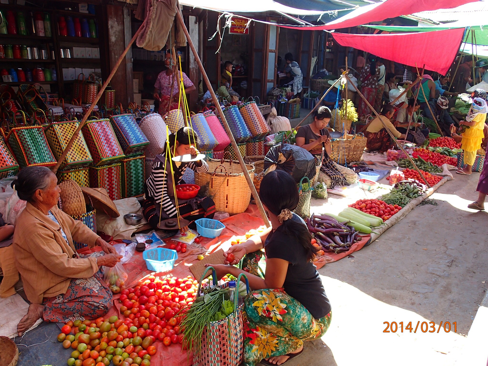 qui flottent, 1m d’épaisseur! Les petits bateaux circulent dans l’eau entre les rangées pour désherber et ramasser les légumes!!! Tout au long de la balade on observe les pêcheurs, les maisons sur pilotis, les grands hôtels (en superficie, pas en hauteur) et on réalise en regardant tout autour que le lac est vraiment dans une vallée et complètement entouré de montagnes (de plus en plus déforestré).Arrivés au marché du matin (2hrs plus tard), on y fait une courte visite car rien de très différent de ce que nous avons déjà vu et comme il se fait tard donc les marchands s’affairent à