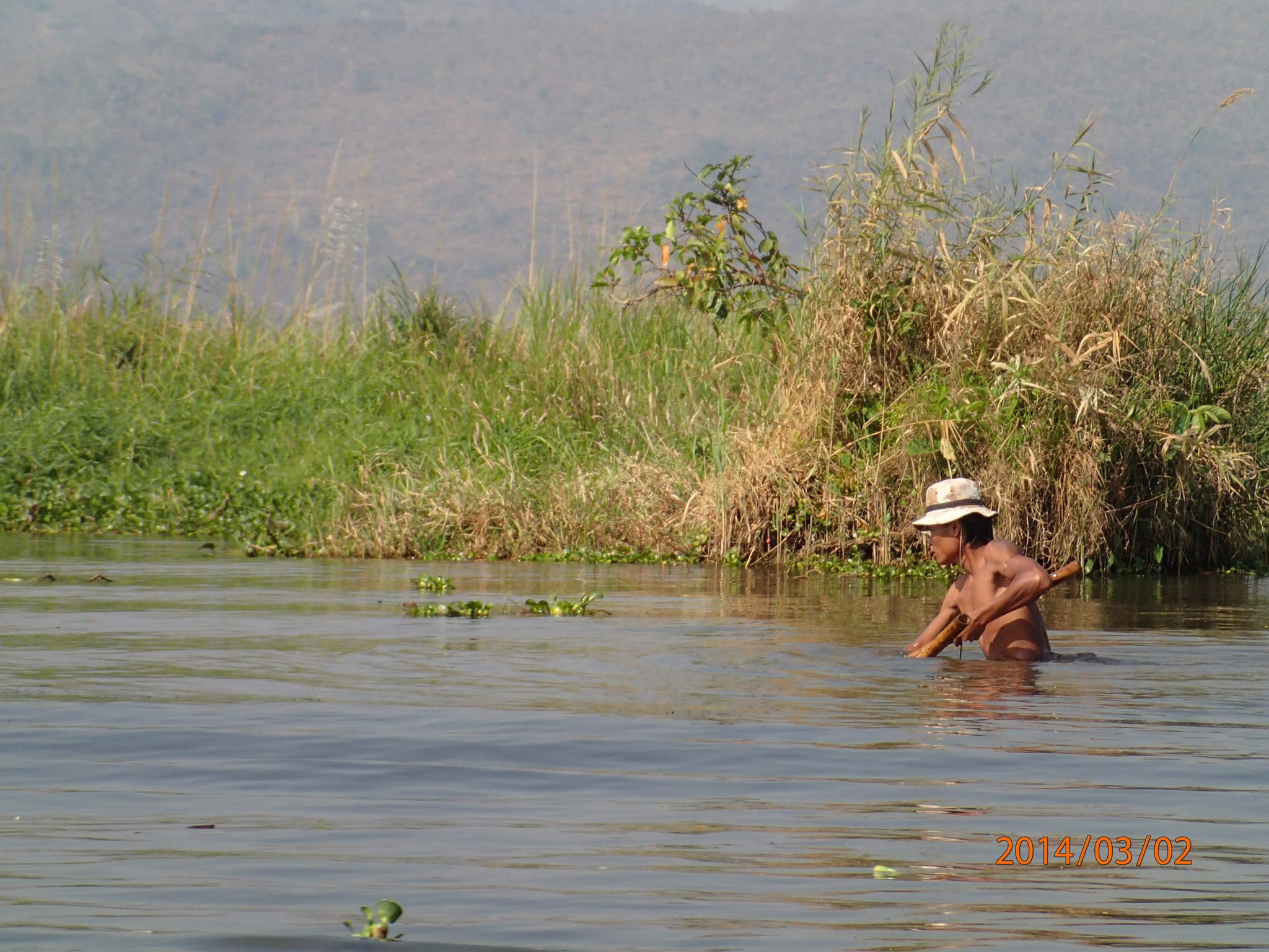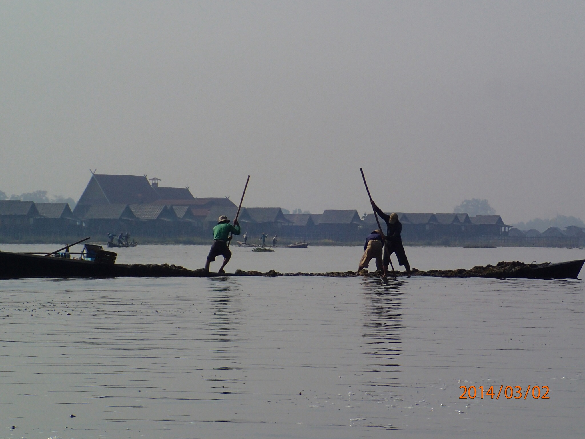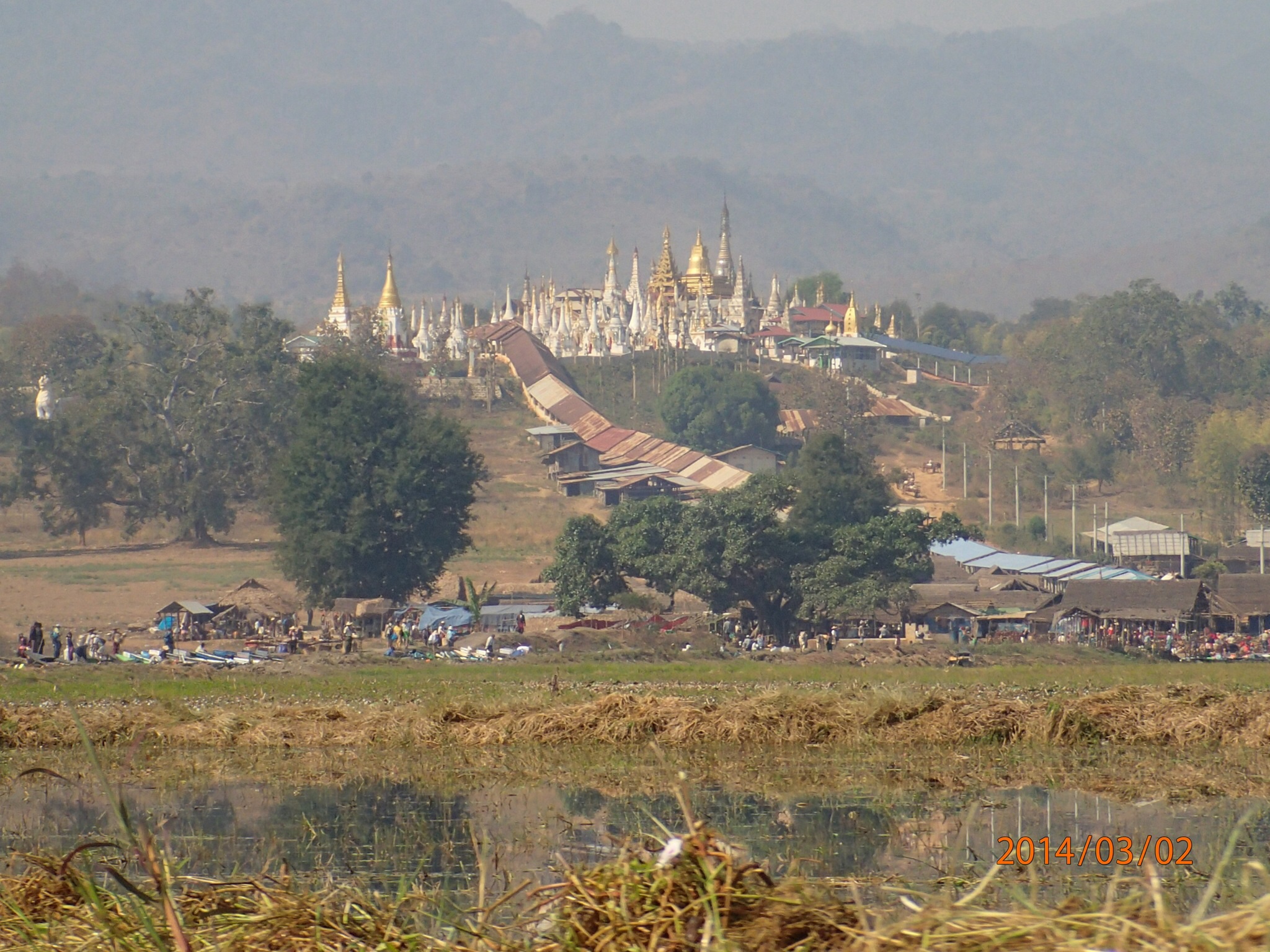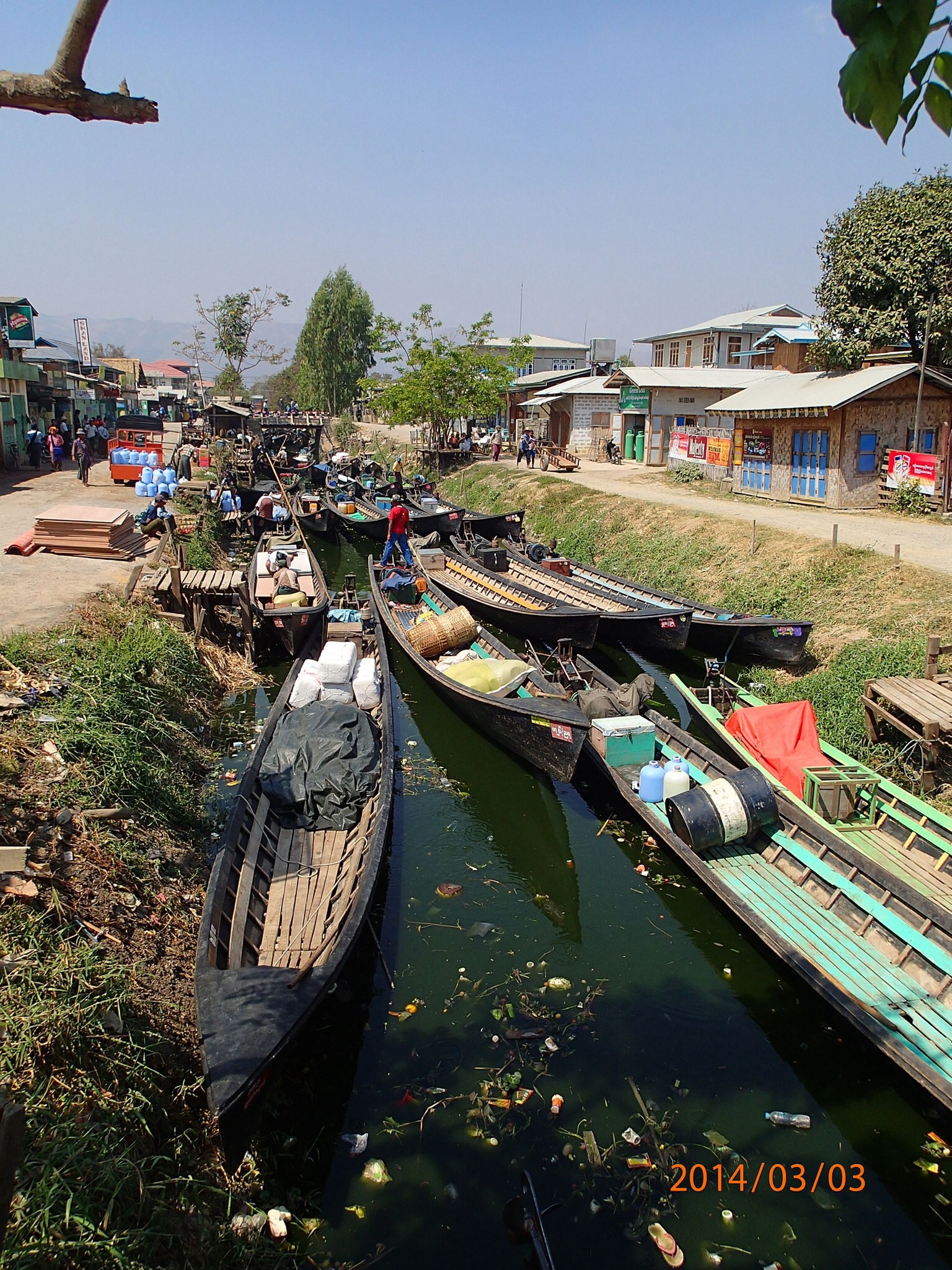 et tous les déchets de la ville (des milliers des touriste et de la population grandissante) s’y retrouvent, en plus de la prolifération des jacinthes d’eau et l’élargissement des jardins d’eau qui empiète sur l’éco système. Il est bien malade le lac des quatre villages (Inlé), les Intha (fils du lac) ne se rendent pas compte de ce qui s’en vient et on ne sait pas si le gouvernement a des plans en ce sens avant qu’il ne soit trop tard! Le Lac aurait perdu plus du tier de sa surface entre 1952 et 2012!