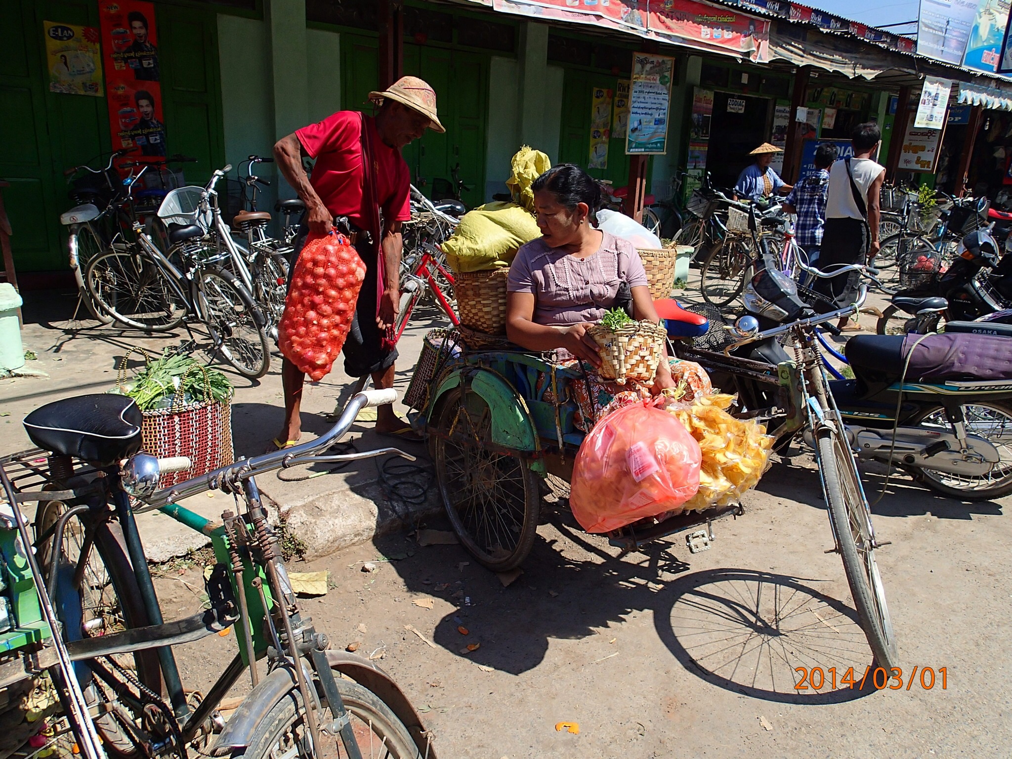 la proprio on réserve un tour du Lac pour demain et on loue des bicyclettes pour aujourd’hui. Tous frais, la panse bien remplie, on part pour le marché car c’est la plus grosse journée aujourd’hui. Balade a pied entre tous ces commerçants qui vendent de tout dans des kiosques des plus colorés les uns des autres: fruits, poissons, viandes fraîches et séchées, vêtements, couteaux et Nath remarque même une dame qui fait de la couture avec une vieille machine à coudre! À l’extérieur on voit aussi des forgerons à l’oeuvre!