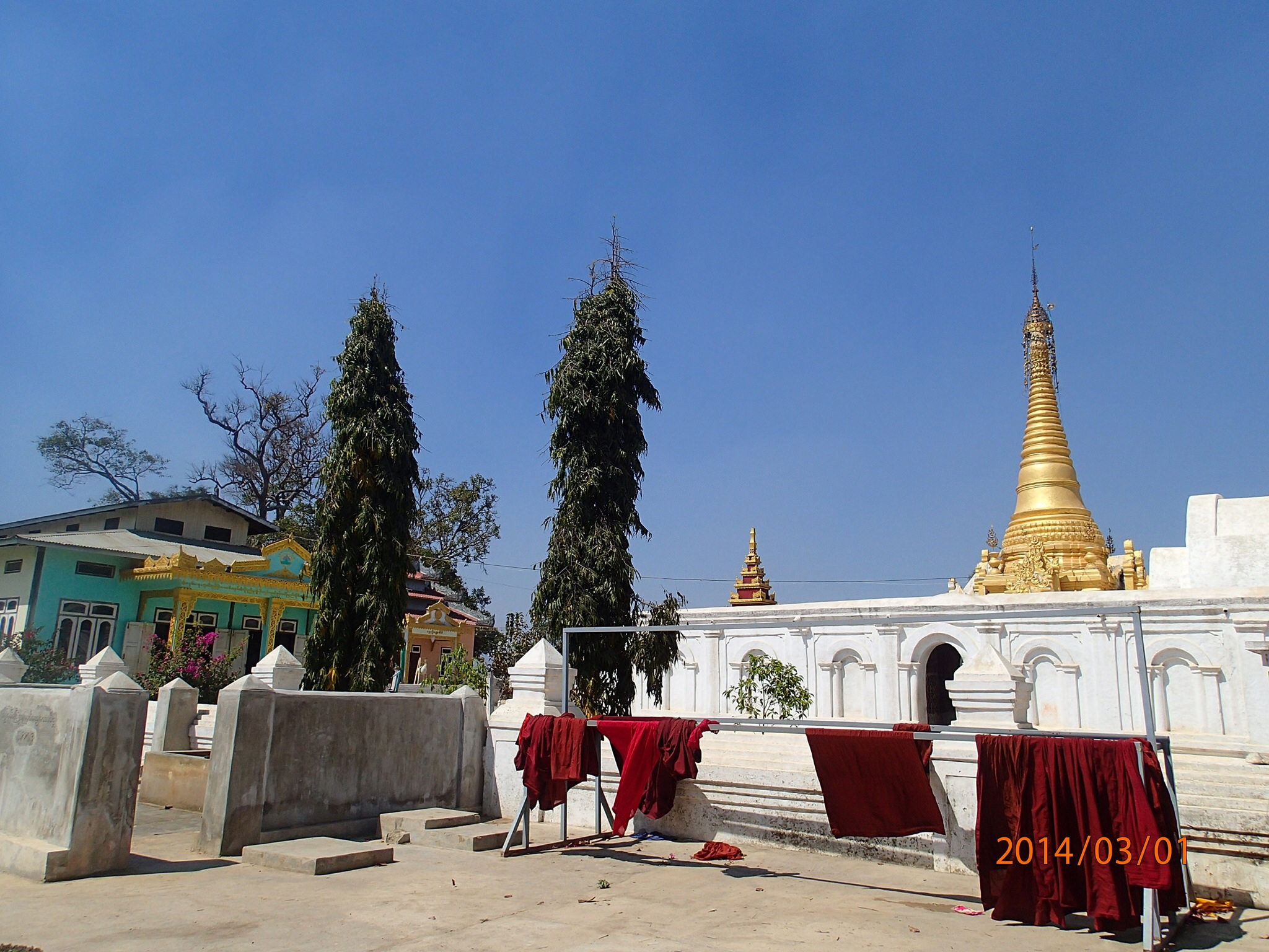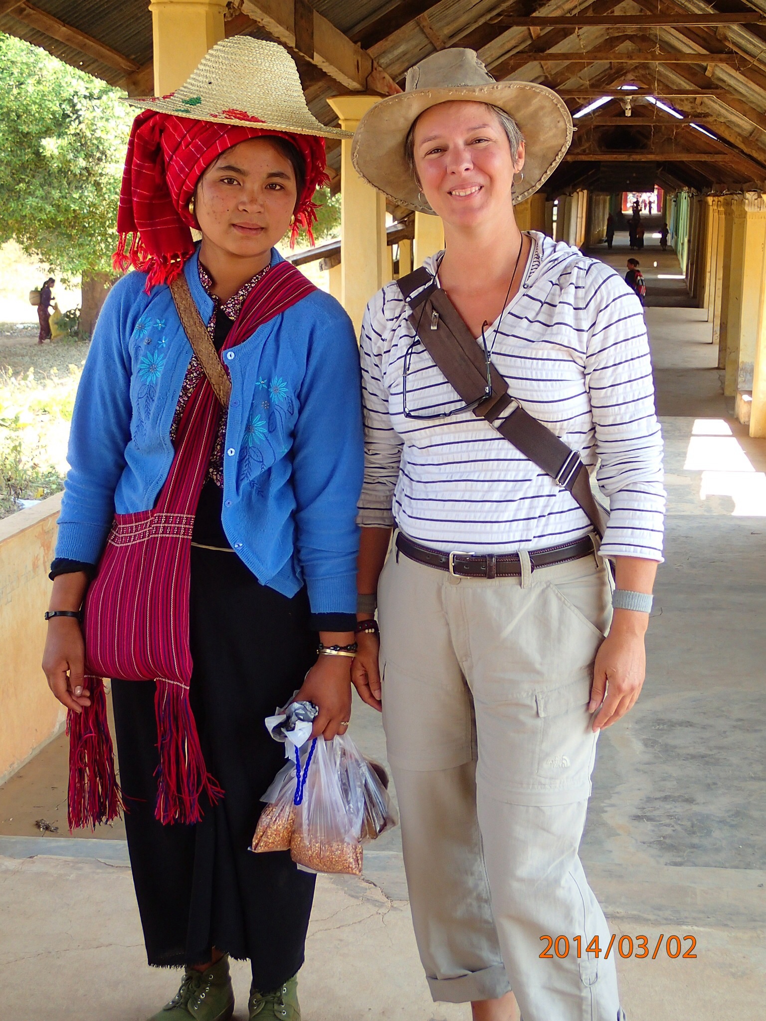 s villages respectifs. Puis on monte jusqu’à la pagode de Shwe Inn Tain (???, on n’est pas sûr). En montant Nath se fait photographier par son chum avec une Birmane d’une tribue qui s’en retourne a son village. Visite de la pagode mystère et les quelques dizaines de stupas qui l’entoure, vraiment spécial! On se croirait dans un autre monde avec pleins de gros stalactites dorés pointant vers le ciel!! Après quelques photos, on redescend à travers les kiosques et Nath va magasiner quelques Longyï et Denis lui va faire baisser le prix de moitié (non mais on fait une bonne équipe!).Puis se se