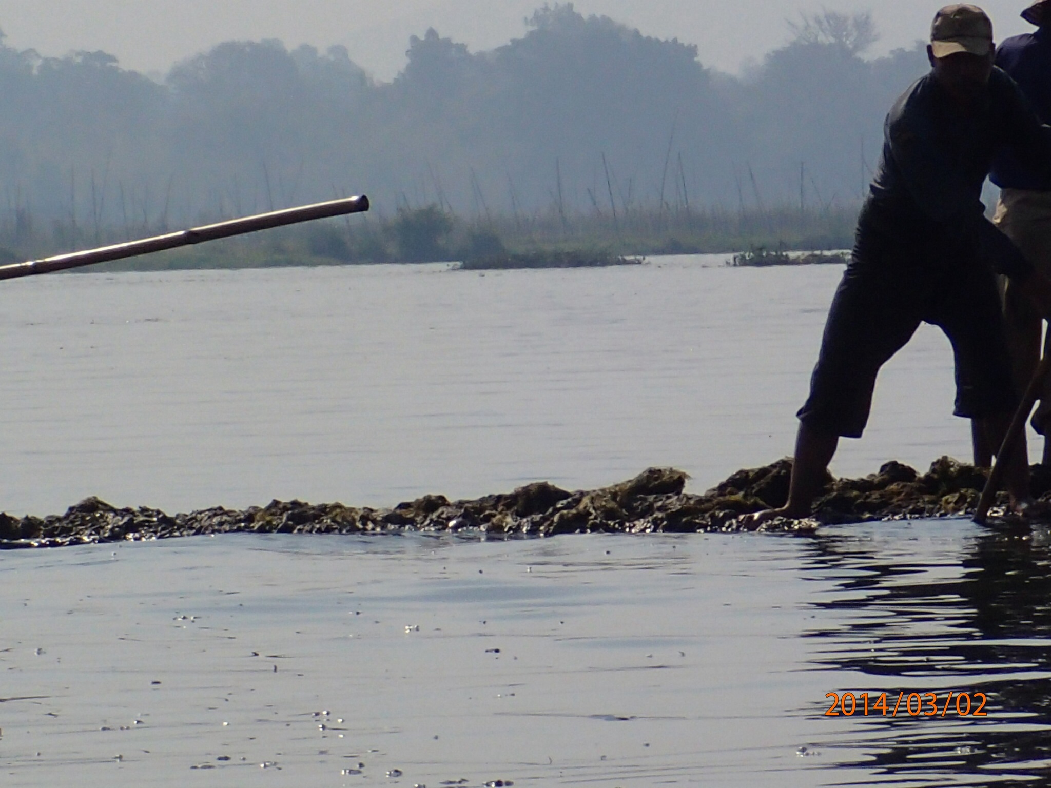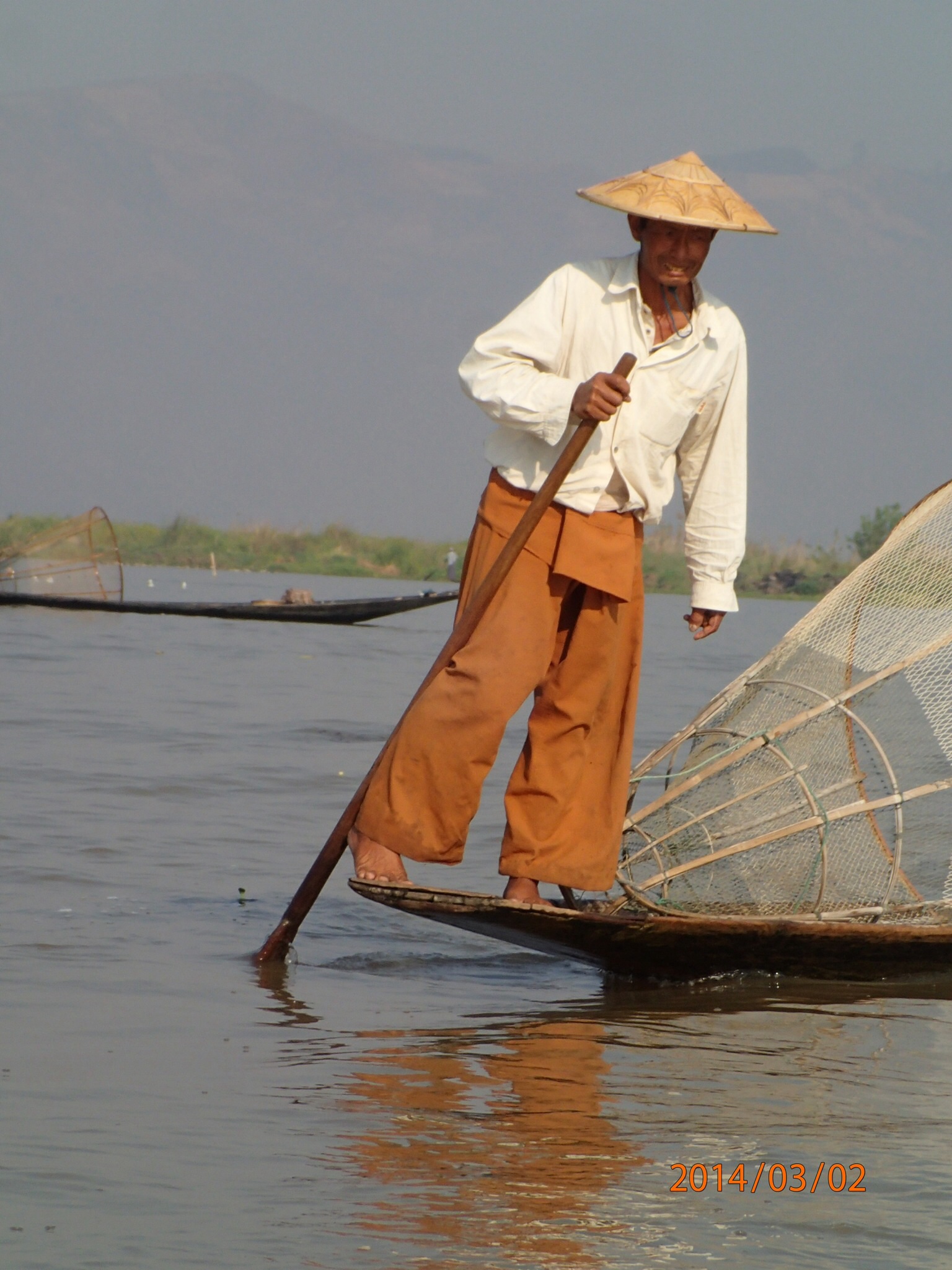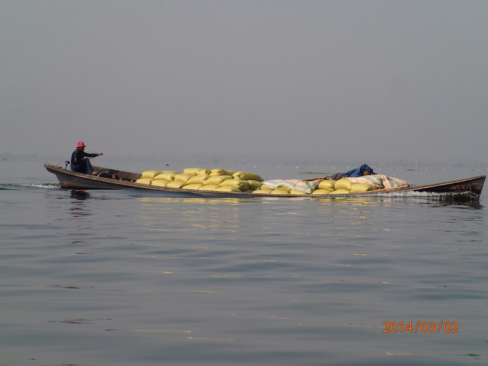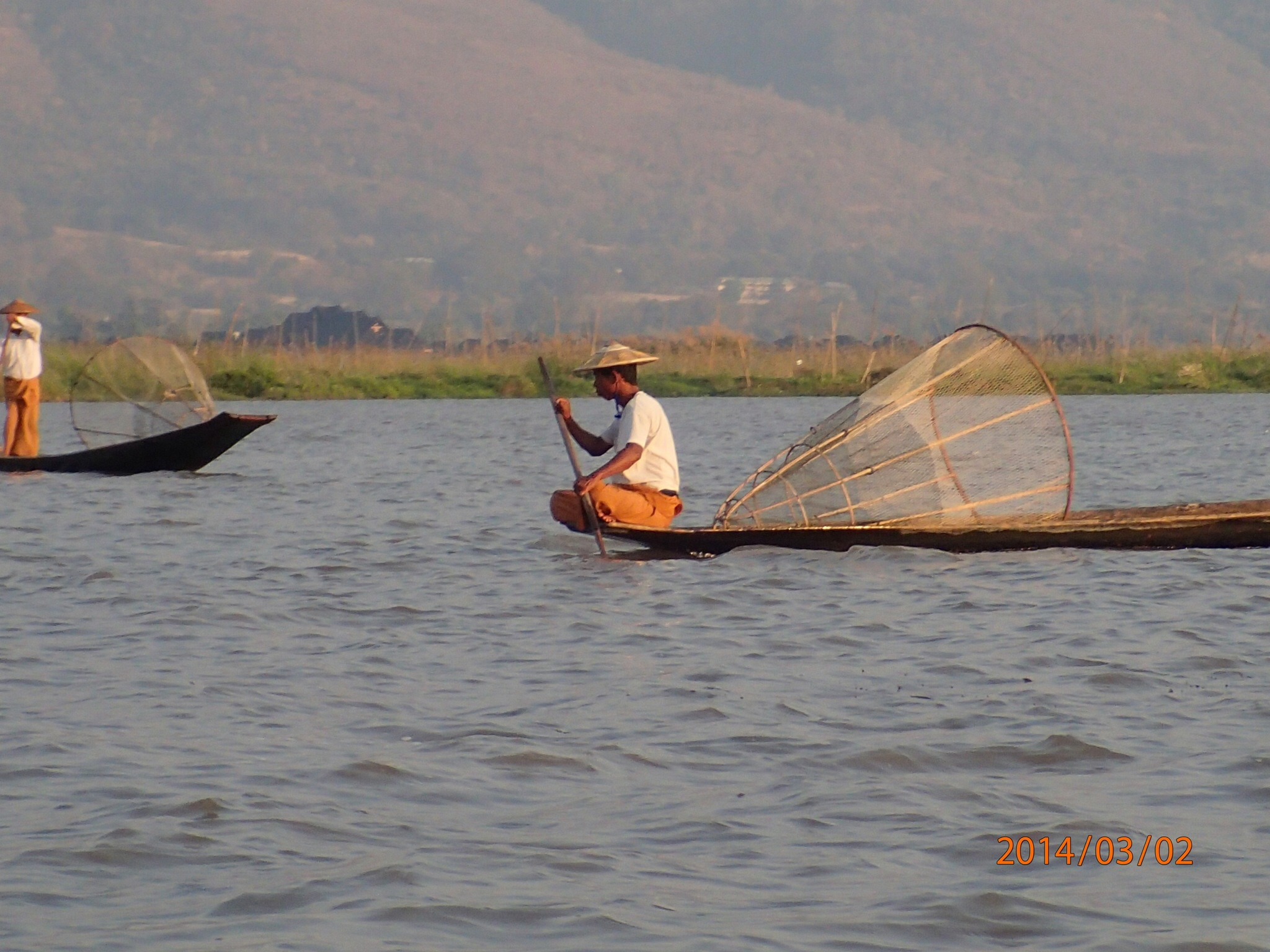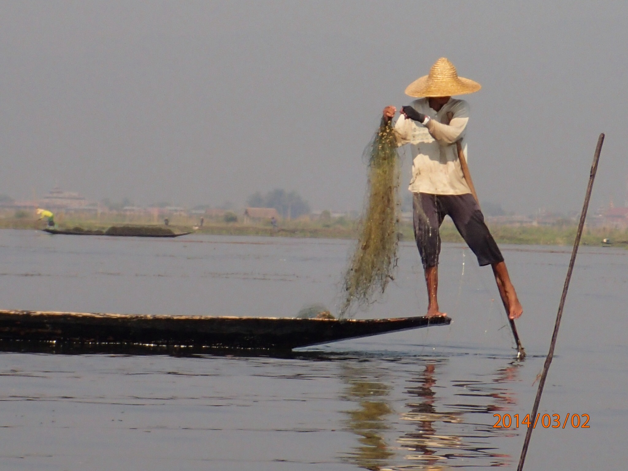 de tout du riz, des fruits et légumes, du bois, de la pierre et bien sur des de personnes!!! Ce qui est le plus renversant c’est de voir à quel point certaines de ces pirogues sont chargées, leurs rebords sont tellement à fleur d’eau que l’on pourrait croire que si la pirogue s’arrête elle va couler!!! Le long du chenal on peut observer la vie suivre son cours les pirogues partent et arrivent (beaucoup de touristes), puis on rejoins le lac immense (20km long sur ~10 de large) mais peu profond jamais plus de 6m.On se dirige vers le marché de Tang To complètement à l’autre bout du lac. Première observations: ces pêcheurs debout sur leurs frêle embarcation, une rame enroulée à une jambe et appuyée sur l’épaule pour stabiliser (ils rament aussi de cette façon) l’embarcation pendant qu’ils lancent leurs filet à l’eau!!! Un spectacle de toute beauté à voir.