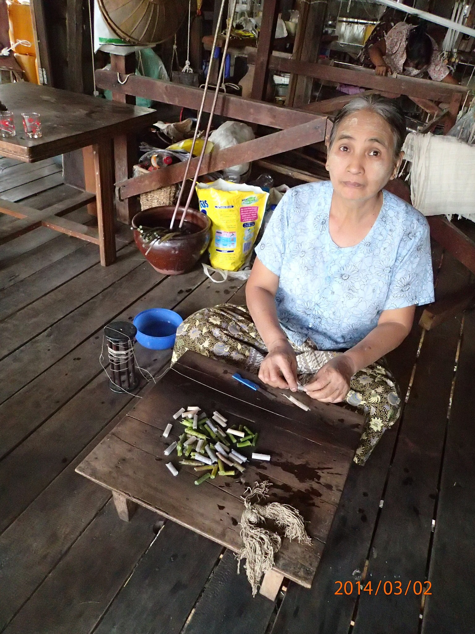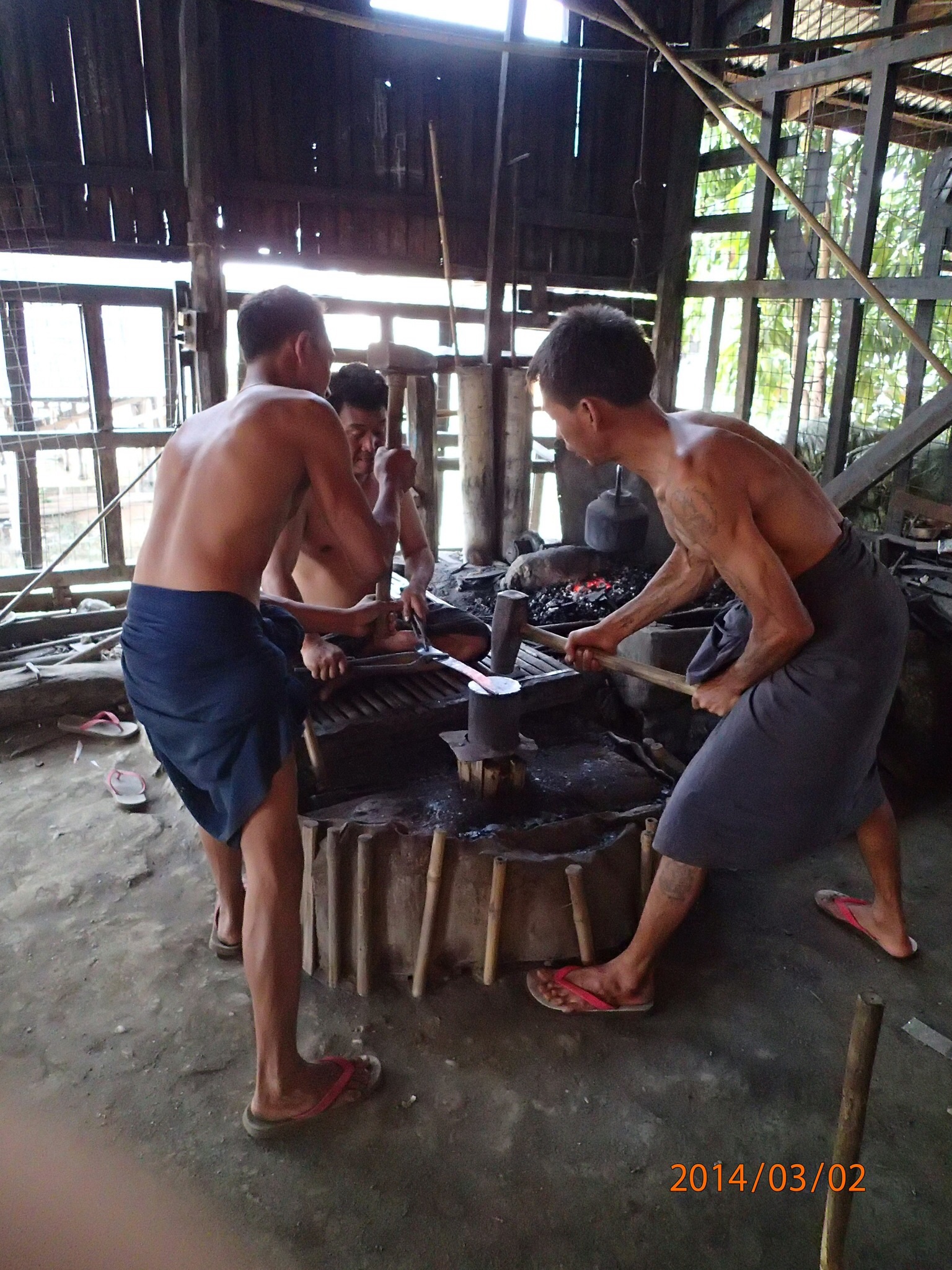 celle des textiles où ils tissent la fibre de lotus pour en faire des vêtement ($$$$$$$$$), aussi de la soie et du coton. Deuxième arrêt: la forge où les forgerons utilisent tous le métal recyclé des voitures et autre pour faire des machettes, couteaux de tous genres etc…tous un spectacle de les voir travailler le métal rouge et lui donner la forme désirée. Puis se sera la pause lunch au troisième étage d’un resto sur pilotis (quand il vente on sent tout bouger!) bonne bouffe et belles photos de la vie sur le chenal tout en face de nous!