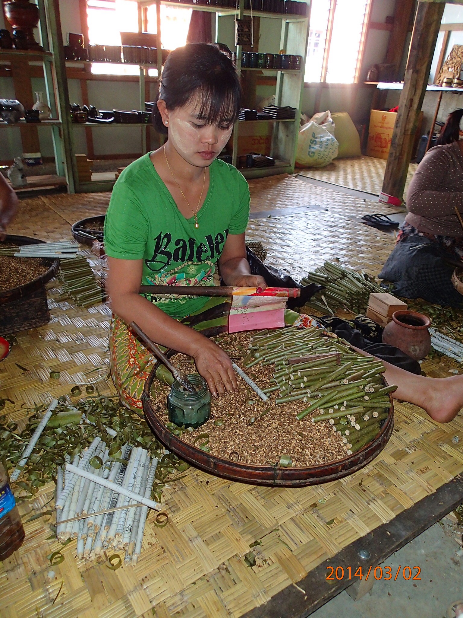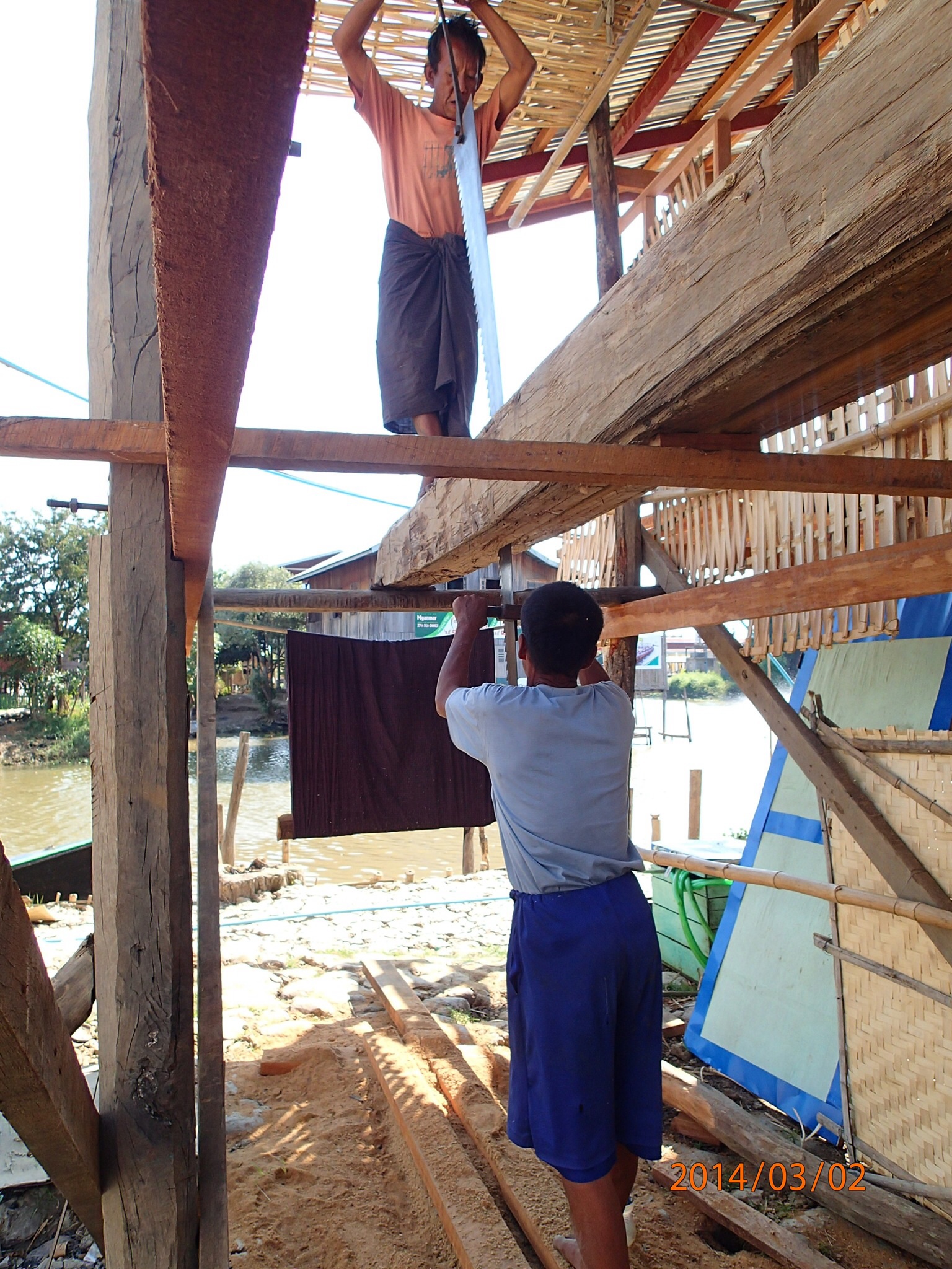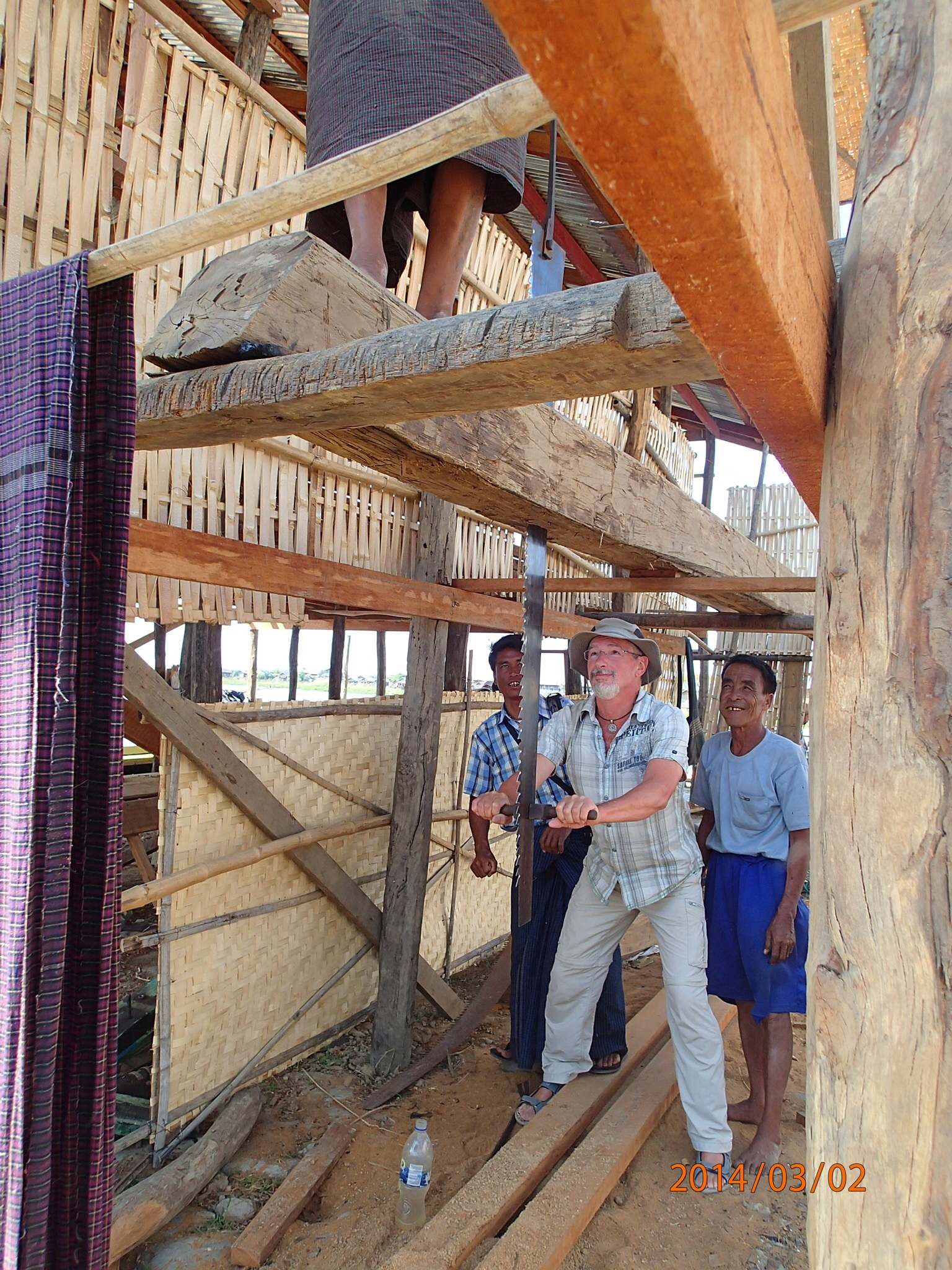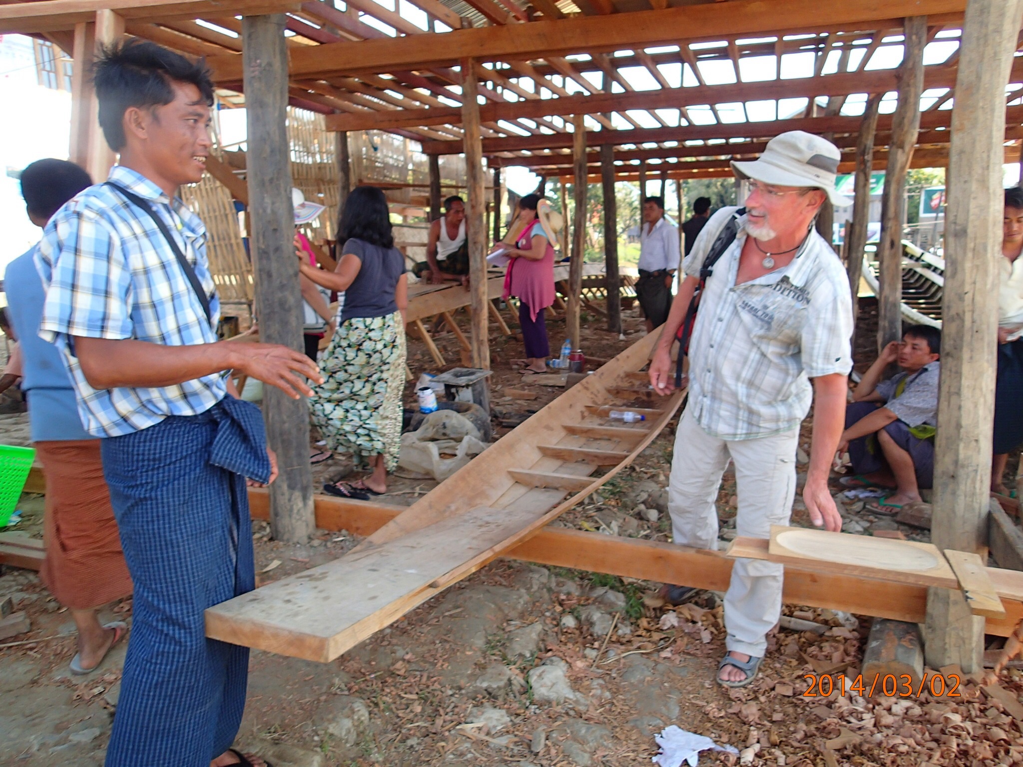 On repart le ventre plein pour une fabrique de pirogue où Denis prend plaisirs a essayer la sciotte (avec un autre Birmand tout en haut) pour scier les troncs et en faire des planches de même épaisseur (tout est manuel: scier du Tek avec une sciotte!!!)! La fabrication de ces pirogues est vraiment exceptionnel à voir: 4 jours pour une petite et 1 mois à 4 hommes pour les très grandes! On assiste aussi à la fabrication de cigare (ça roule en titi ici les Birmands).Prochaine étape la pagode de Phaung-Daw U (là ou nous avons aidés a maintenir les abris en