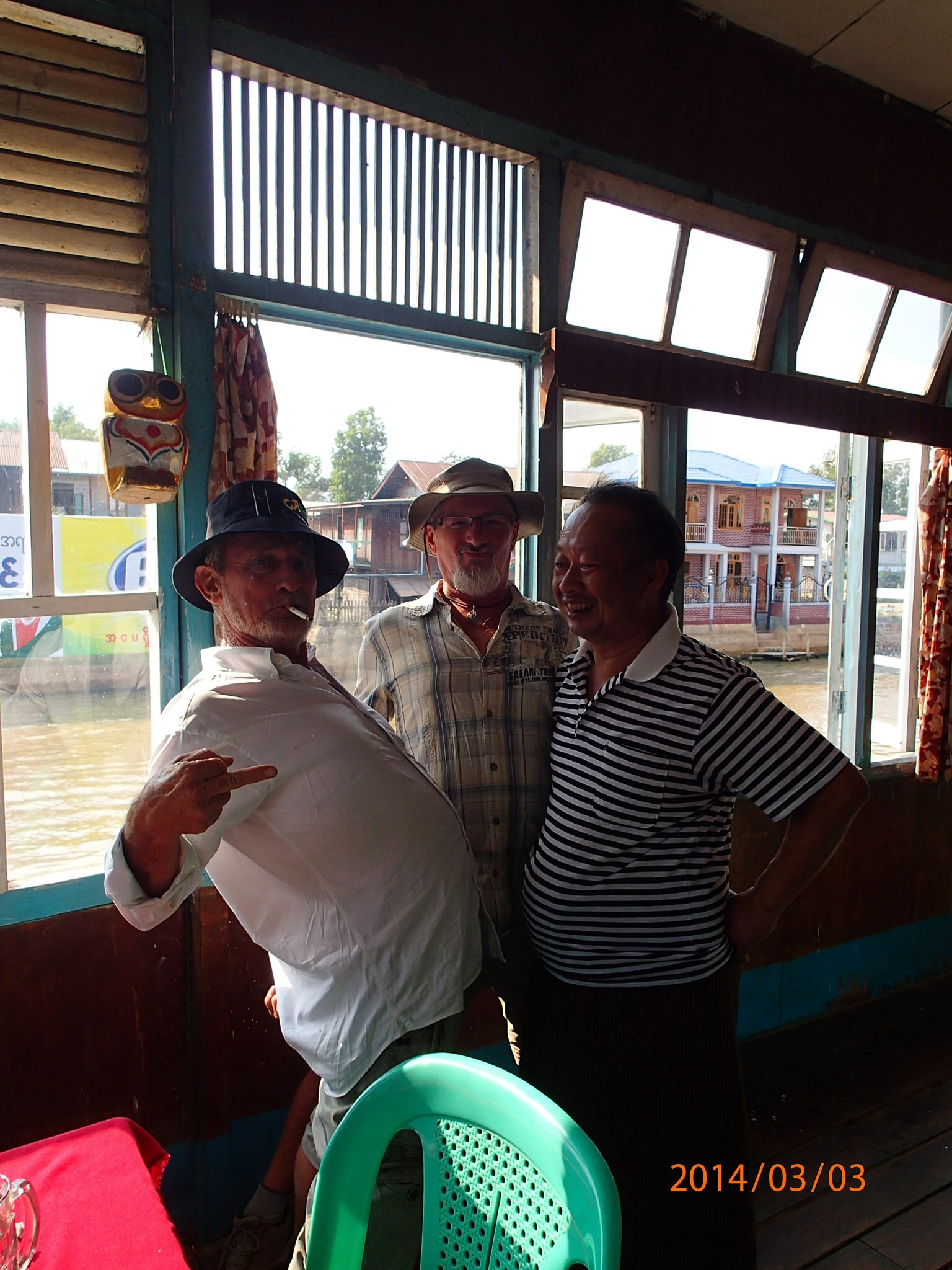 droit local sur pilotis au bord de l’eau. On pourra ainsi observer le va et vient des bateaux et aussi d’un pêcheur avec son filet de l’autre coté de la rive qui semble faire parti d’une autre époque! Puis Brandon (Australien) fait son entré quelques minutes plus tard et nous salut, en moin de deux il est assis avec nous et on discute de toutes nos expériences de voyage (il a rencontré le Dalailama mais ne savait pas que c’était lui et ils ont rit ensemble, puis Eric Clapton et Carlos Santana dans des circonstances plus drôles les une des autres) enfin tout un personnage et très coloré, un très beau moment tout ça dans le bruit infernal des long tail, assez typique! Et puis il faut qu’on rentre au guest house, blog, note, courriel, lecture pour les prochaines destinations etc…C’est un départ pour une autre destination celle de Mrauk-U, chemin faisant vers le terminal on rencontre un groupe de jeunes étudiants, ils sont 500 en tout qui font un tour du monde (croisière) en 4 mois tout en étudiant pendant les déplacements de leur bateau!!!! Et pour finir on aura droit à un vrai bus VIP de nuit avec fauteuils confortables, doudounes et des films/soap en Burman!