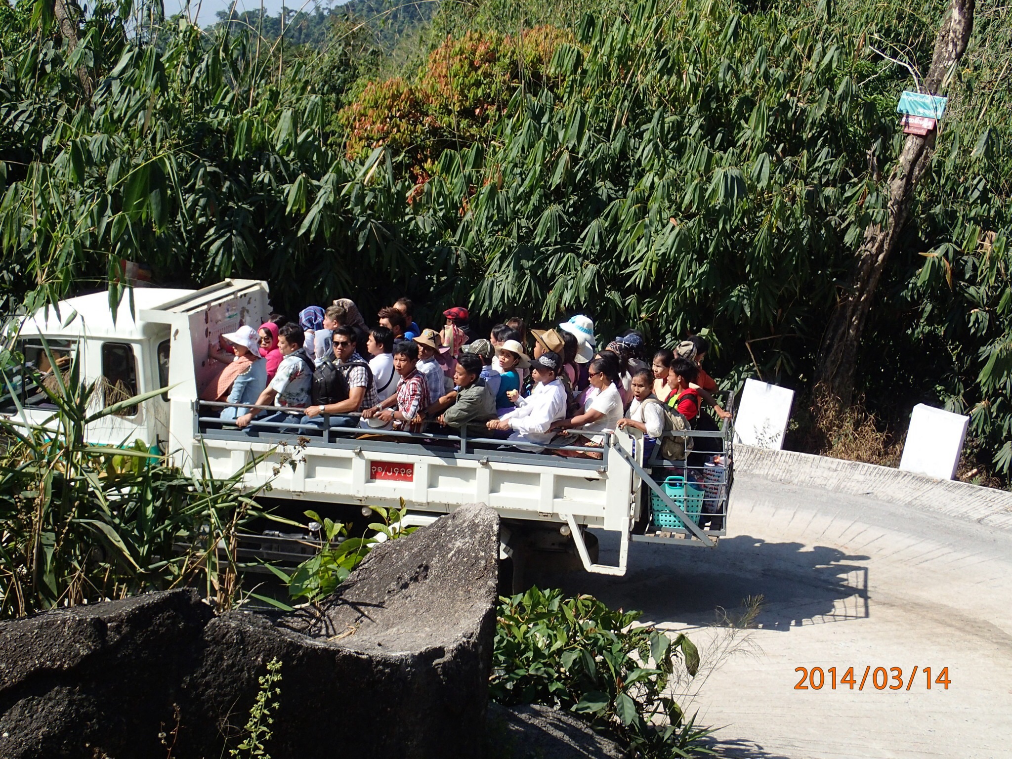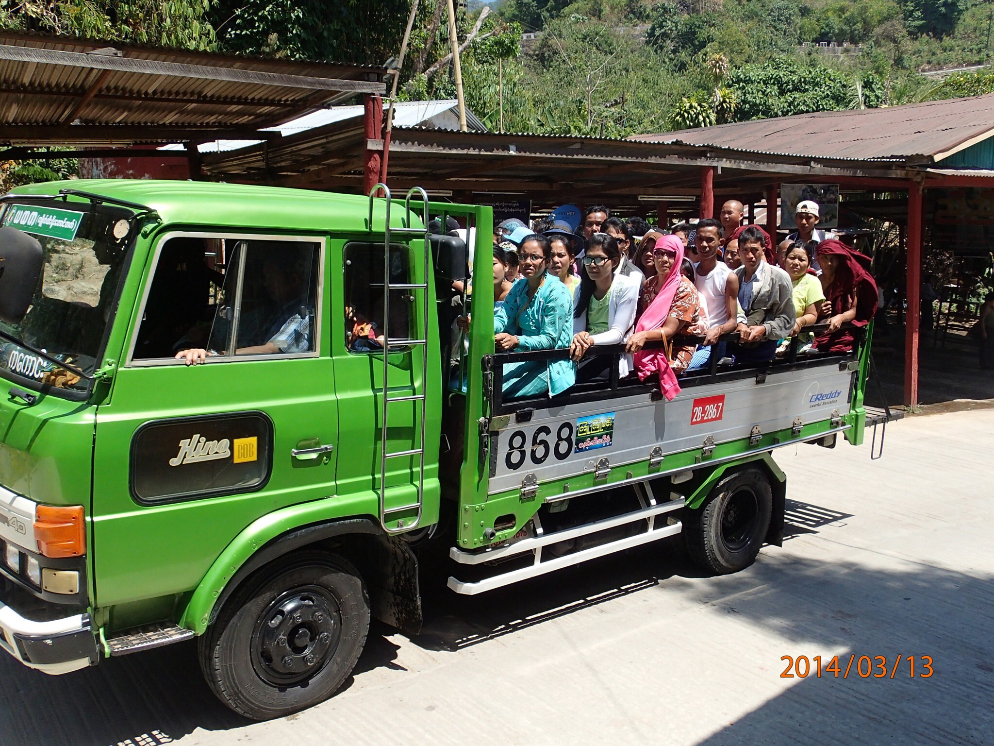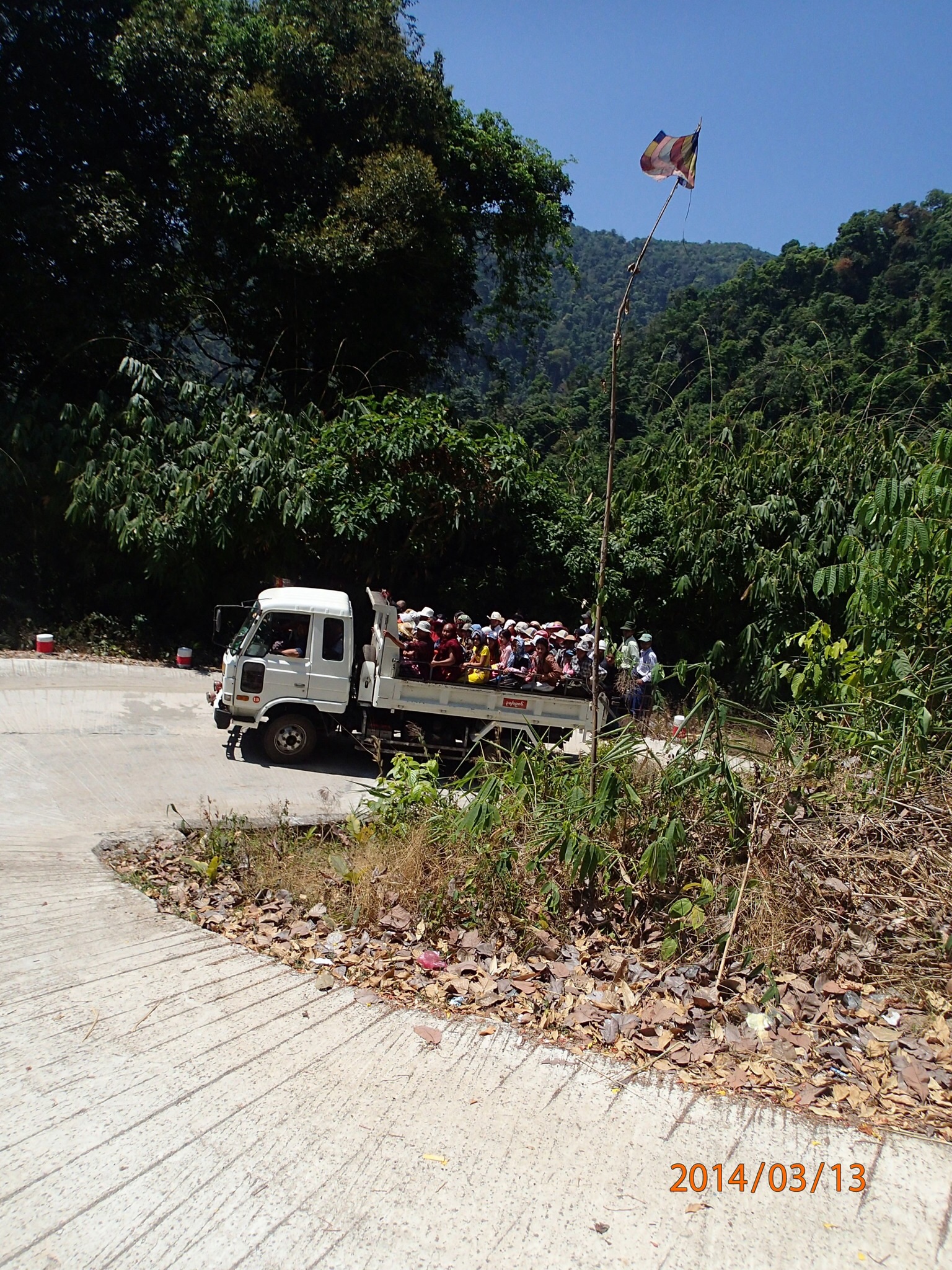 Arriver à Kyaiktiyo, on nous fait débarquer du bus pour monter dans un petit pick up (boite du camion) avec environ 20 autres personnes pour nous amener au camp de base, la bonne nouvelle c’est qu’il ne nous demande rien car ça fait partie du prix du billet!!! Donc là on est vraiment avec les locaux entassés dans la boite presque les uns par dessus les autres, le petit voyage durera ~30min jusqu’au camp de base d’où partent les seuls camions faisant la navette entre le camp et le site au sommet!!!!
