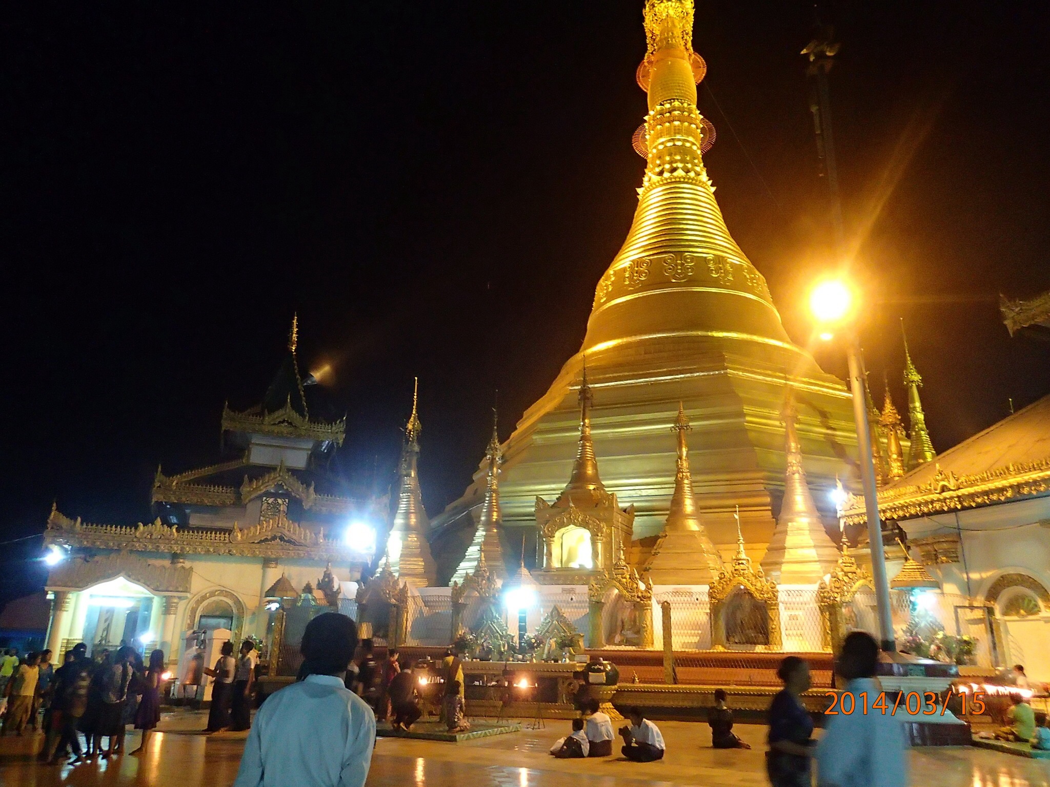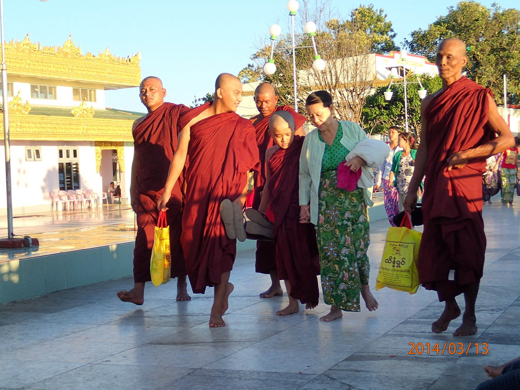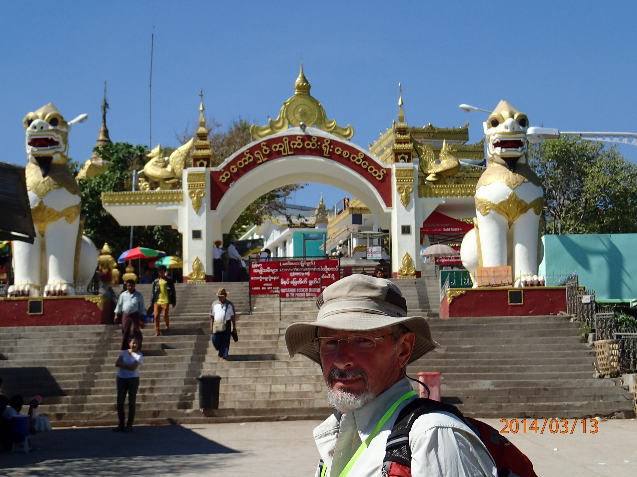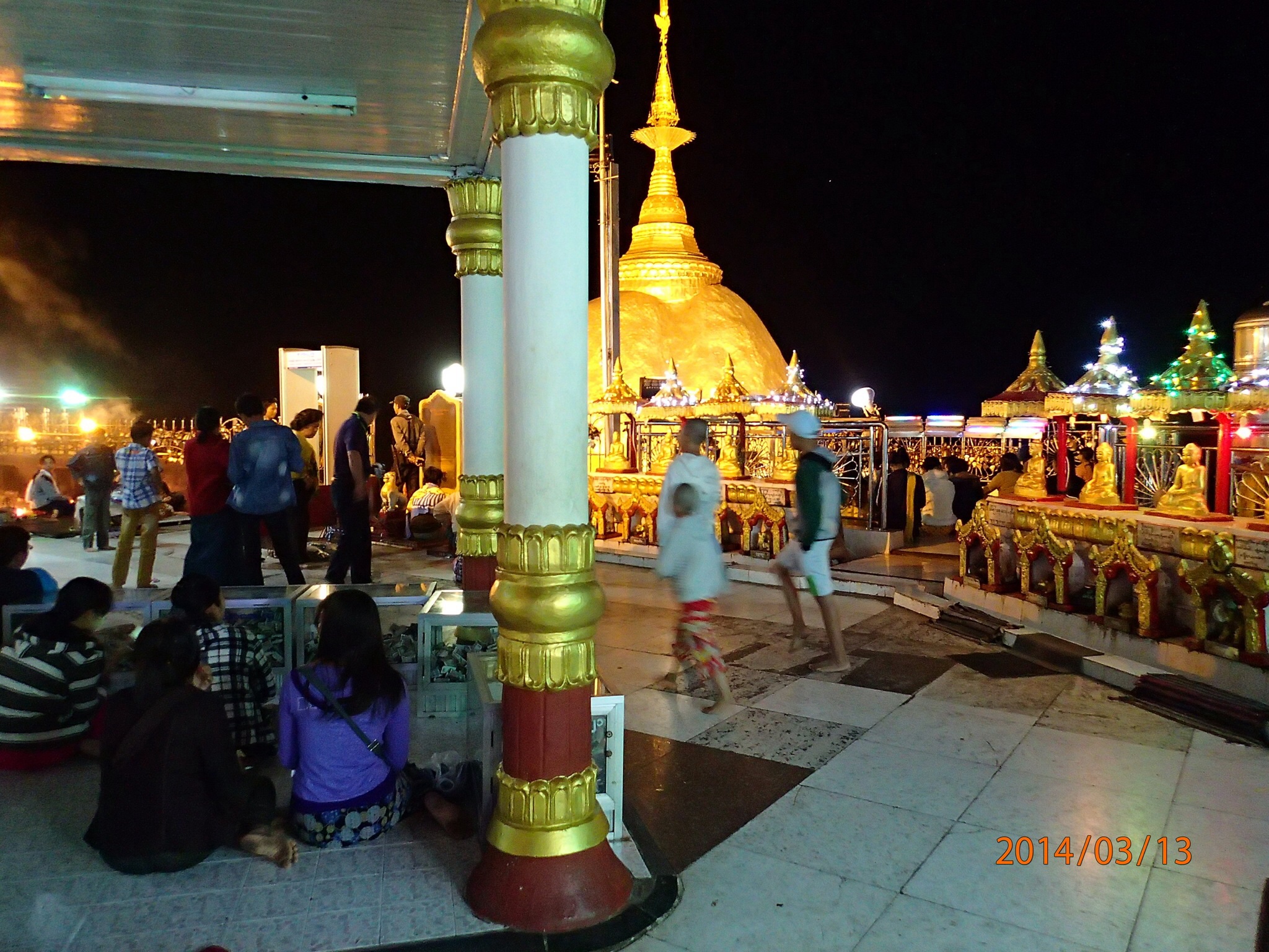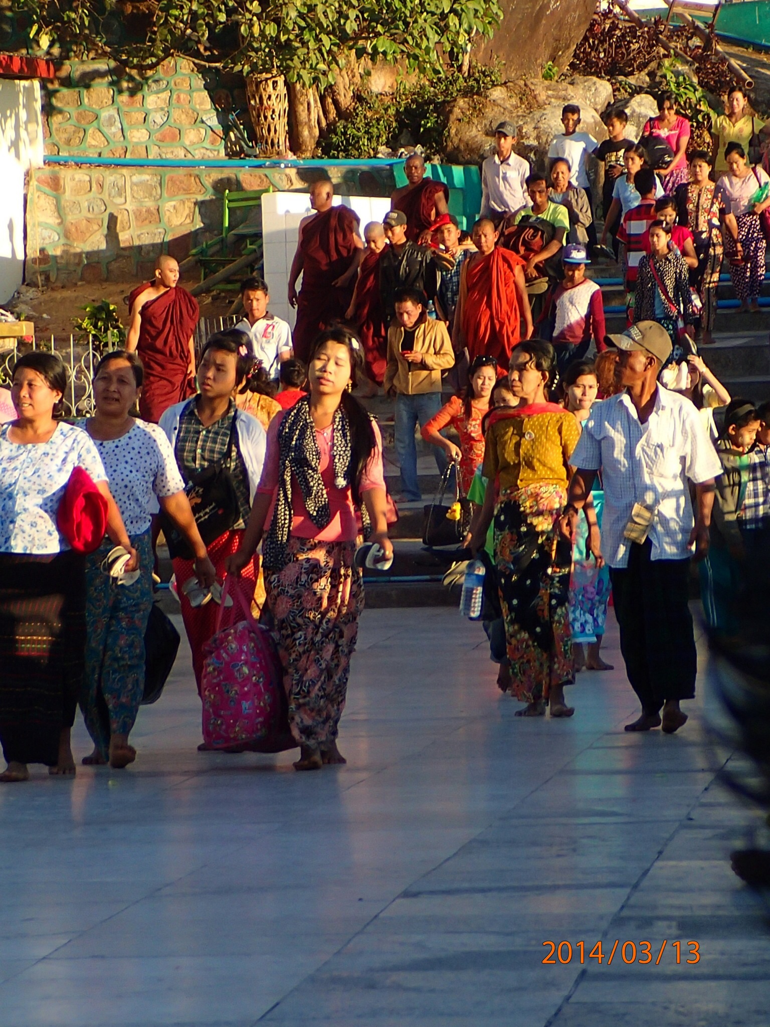 (resto et tout) commence à être de plus en plus difficile donc on a conclut qu’il était tant pour nous de sortir (2 jours avant la fin de notre visa de 28 jrs) et rentrer en Thaïlande pour prendre la direction des îles du sud au bord de la mer afin de souffrir un peu moins de la chaleur (sur le bord de l’océan il y a de l’air !!!). A la tombé du jour on va aller visiter la Pagode de Kyaikthanian, que je qualifierai de petit format de celle de Yangon mais toute aussi spectaculaire. C’est la fête de la pleine lune et il y a beaucoup de monde qui se rendent sur le site, ça bourdonne d’action (on se demande de où tous ces gens sortent !). Courte visite car on en a vue tellement que l’éblouissement y est moindre, mais en revanche le panorama de la ville est splendide le soir. On rentre diner à l’hôtel, nos amis Anita et Pascal se joindront à nous et on passera un autre bon moment à échanger ensemble.