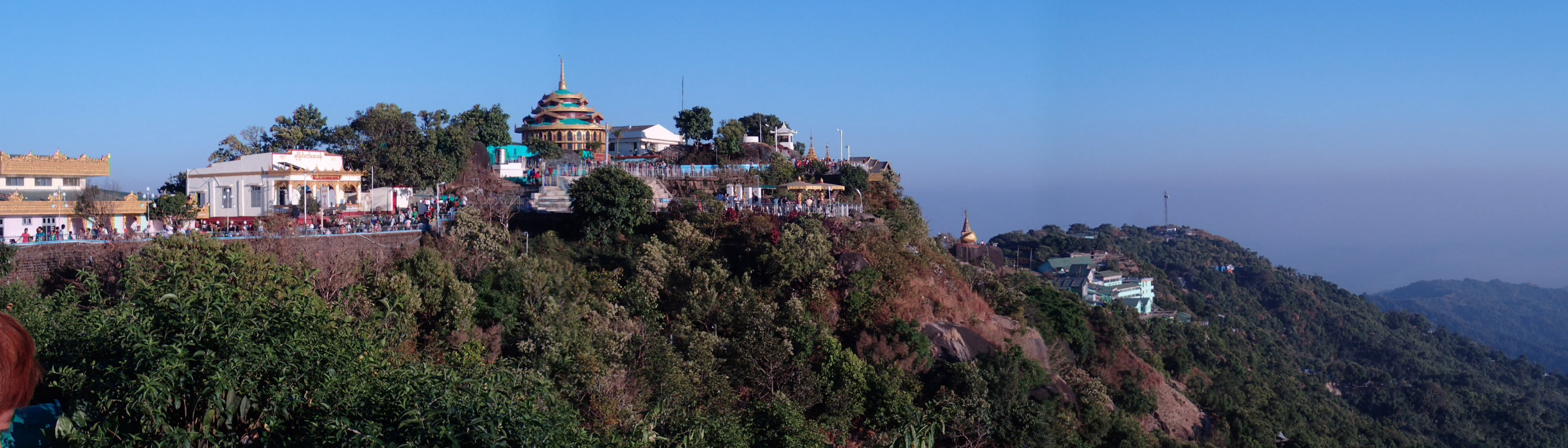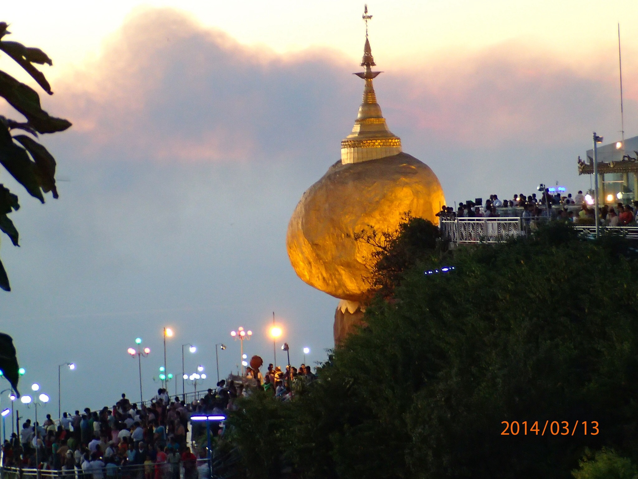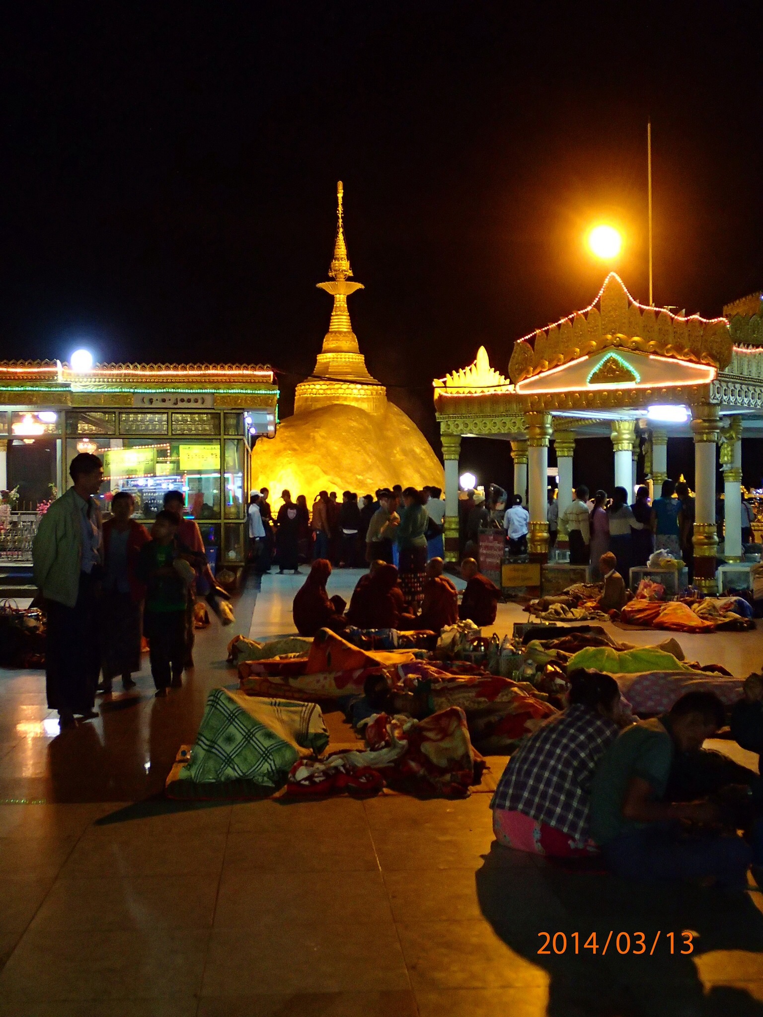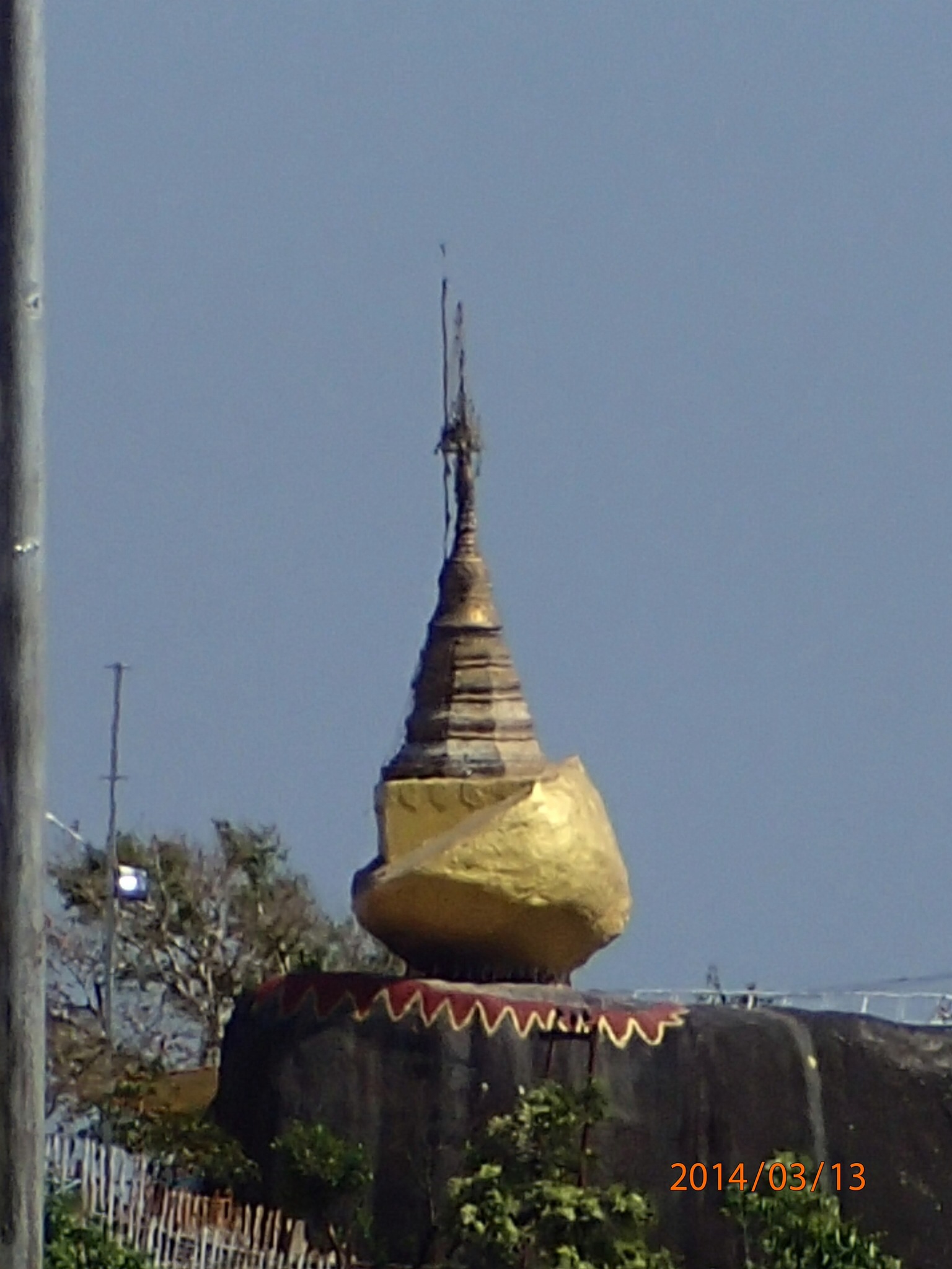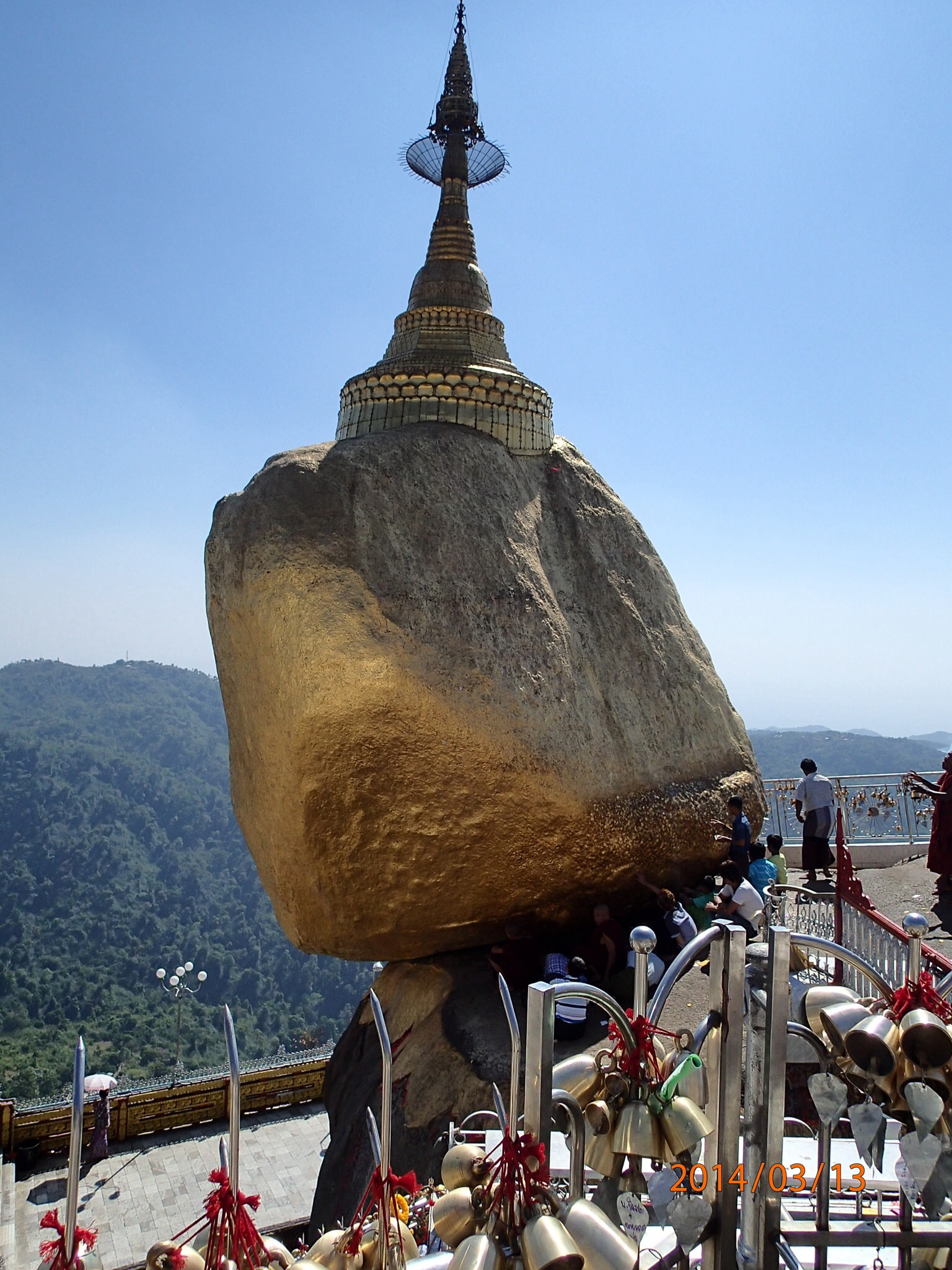 emière impression : on l’imaginait plus gros!!! Mais c’est surtout l’ensemble du site qui est majestueux et surtout de voir tout ces gens. Pas surprenant que ce soit l’un des principaux lieux de culte du bouddhisme birman. Selon la tradition, le rocher aurait été placé à cet endroit par deux nats (esprits) il y a 2 500 ans ; il ne tiendrait que par un fil, un des cheveux de Bouddha. Les pèlerins le recouvrent de feuilles d’or évoquant la tête du célèbre ermite. Autre fait, les femmes n’ont le droit ni de le toucher, ni de s’en approcher. Tout en s’approchant on observe les fidèles (des familles co