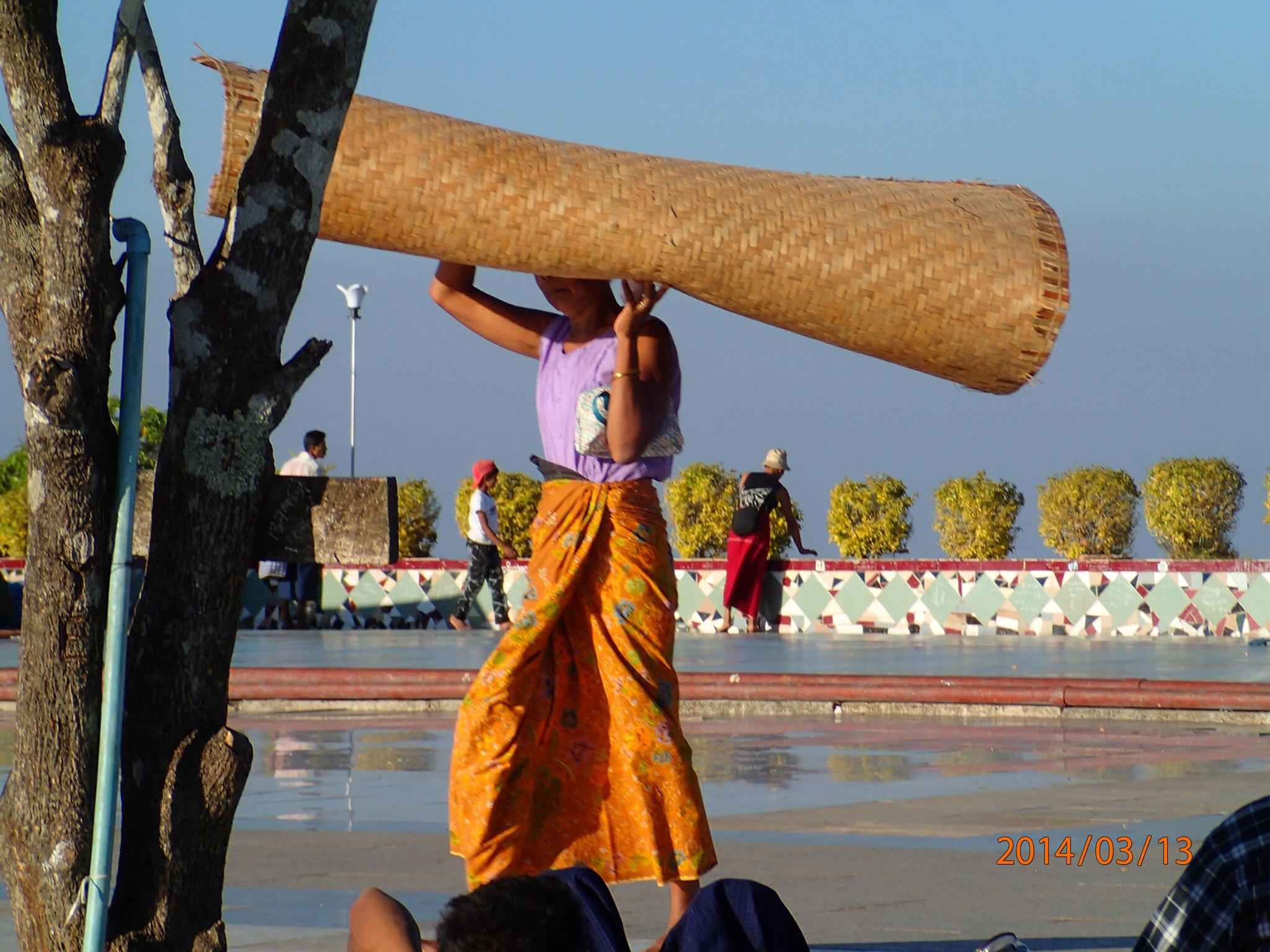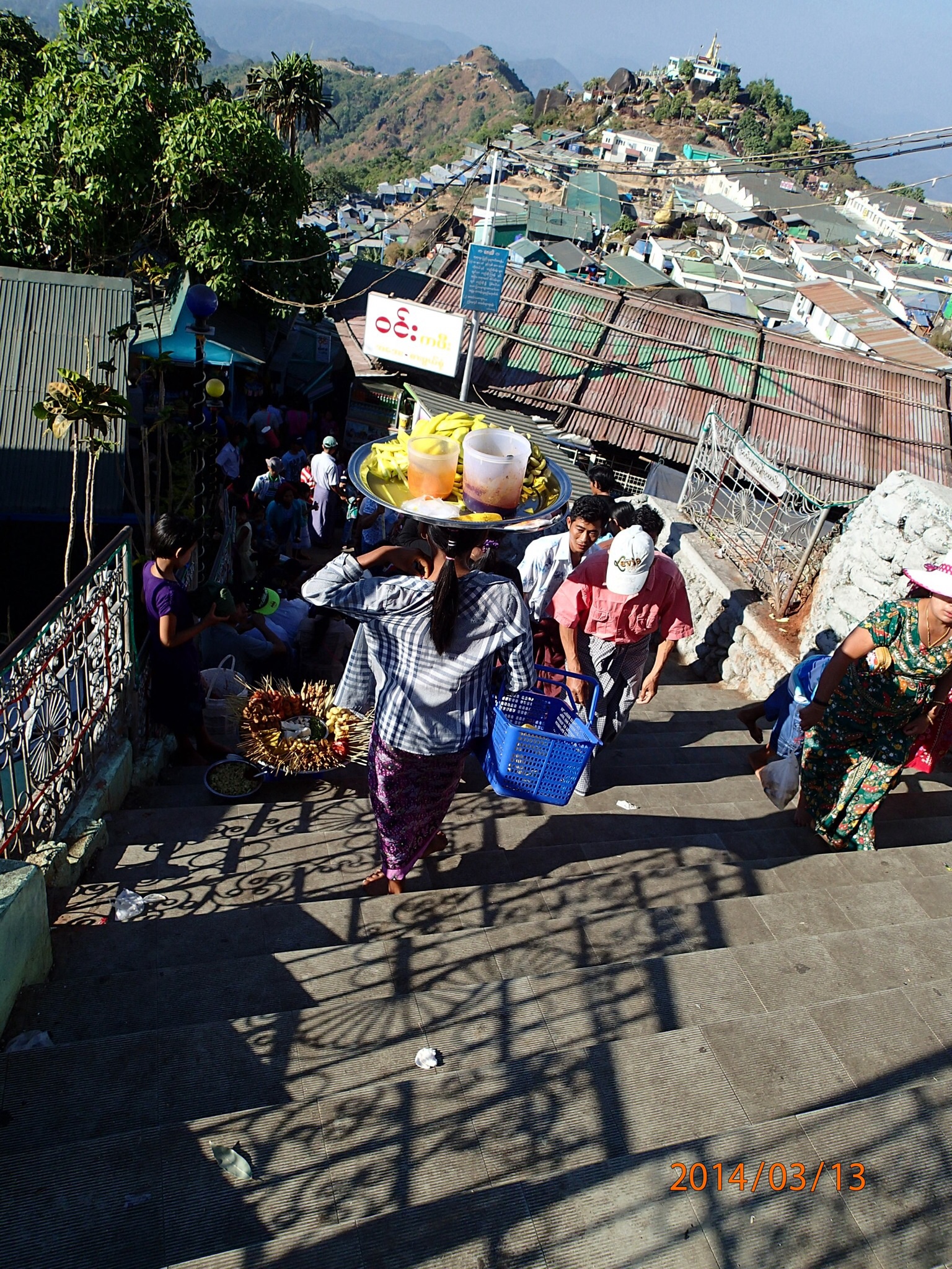 attendent pour transporter nos bagages jusqu’à l’hôtel, il y a même des porteurs de chaise pour les gens à mobilité réduite!!! Nous avions déjà décidé de porter nous même nos bagages en guise de pèlerinage par respect pour les Birmans croyants. Il reste environ 1km de marche pour atteindre le fameux roc