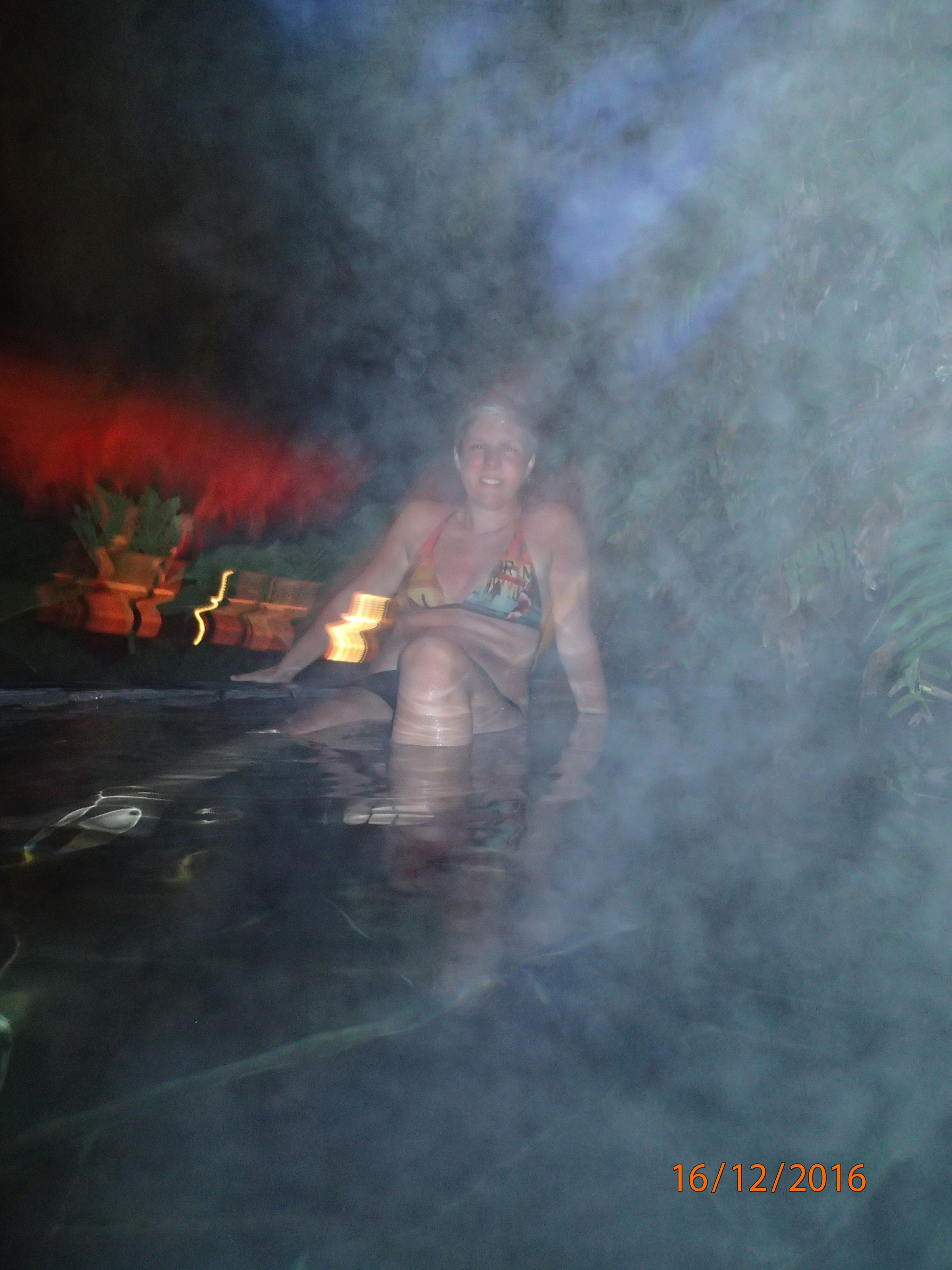 bien sûr à cet endroit, on admire puis on redescend au premier bassin. Ici tout est bien pensé, a chaque bassin, un endroit pour laisser nos effets et se changer si besoin. Toilette tout au long du parcours et quelques petit endroits pour faire une pause. Puis on y va, premier bassin on savait pas trop, Nath entre dans l’eau, houla! houla! c’est chaud, quelqu’un lui dit qu’il faut entrer de l’autre côté car même dans le bassin la température de l’eau varie d’un bout à l’autre. Ouf, on est bien, très relaxant, rien à voir avec les SPA, tourbillons, musique,