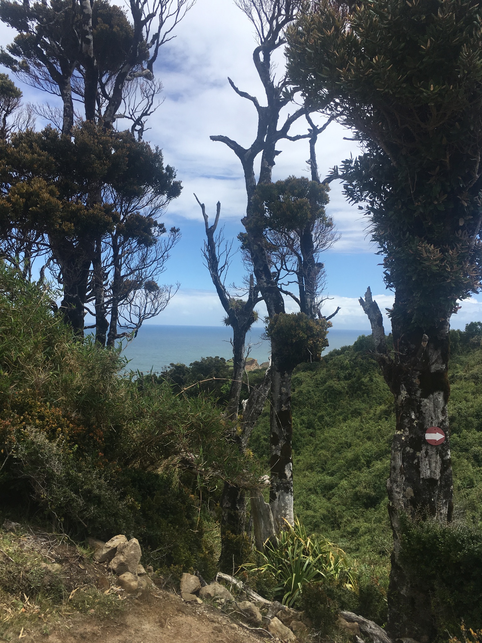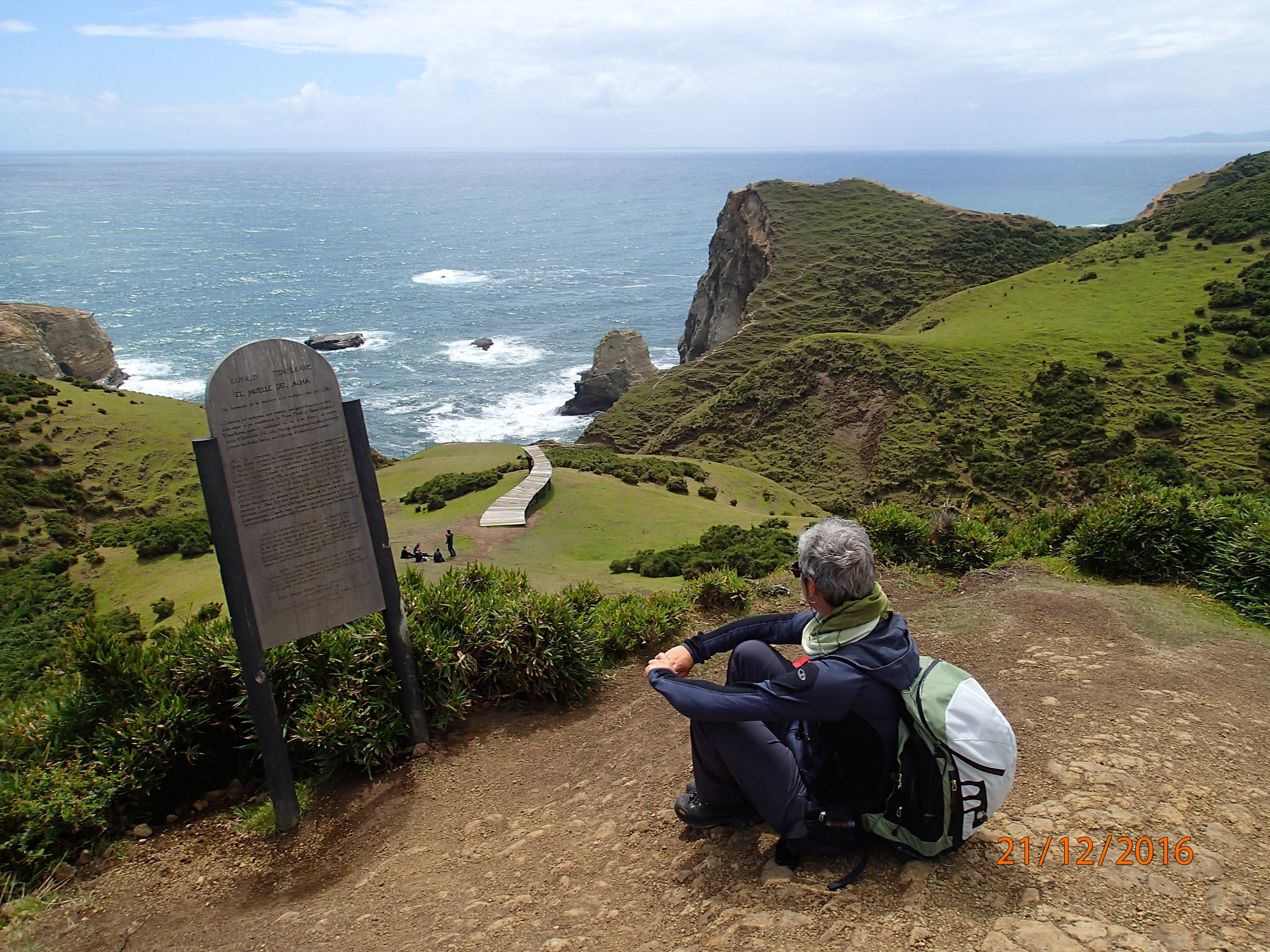 Point culminant en arrivant au bord de l’océan, nous sommes au sommet d’un colline, on sent le vent constant de l’océan, on peut admirer la mer à perte de vue et les vagues qui se déferlent sur les rochers et falaises. Un paysage matnifique qui couronne très bien notre randonnée! On mangera les « tout ce qui » de nos sacs: banane, peanut, barre céréale, chocolat…on est santé hein!