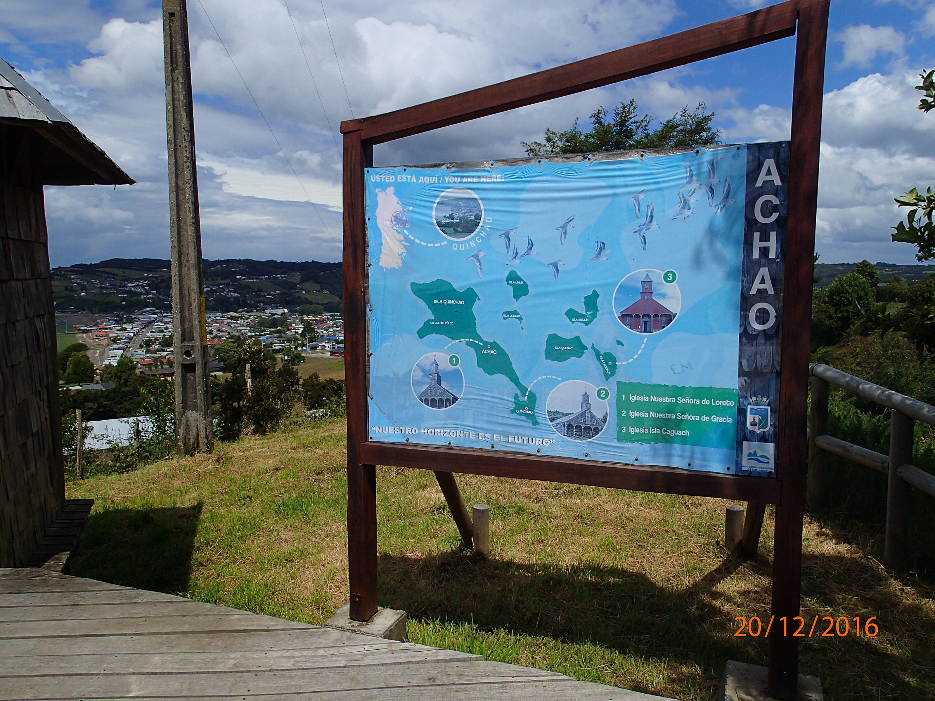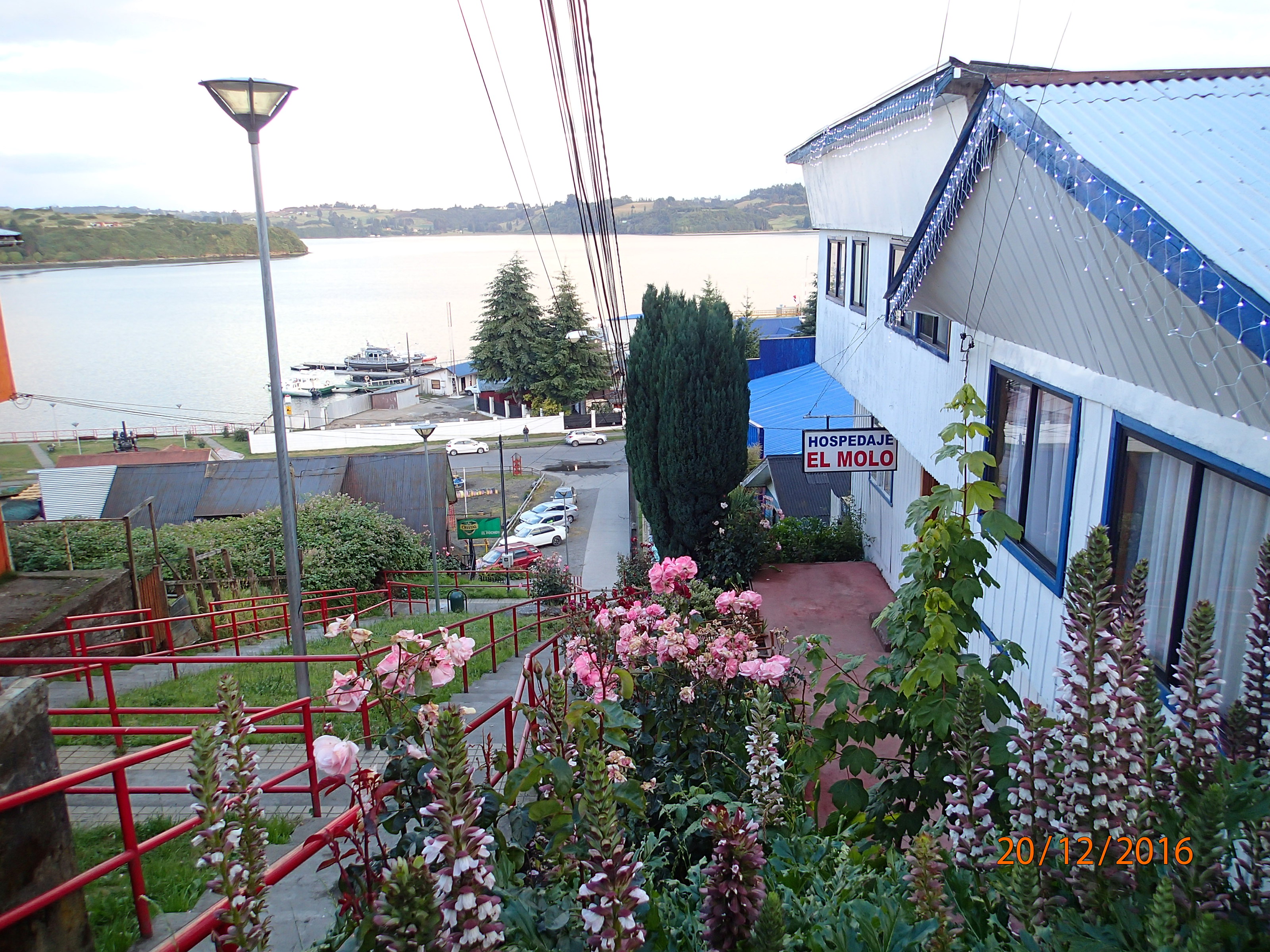 voyages, expériences un peu tout y passe. Après on s’assoit dans la véranda (vue sur la baie), on bouquine et définit notre itinéraire pour nos 3 jours restants à l’île. On quitte direction Castro mais avant petit croche vers Dalcahue puis traversier vers une autre Île vers Achao. On fait un petit stop