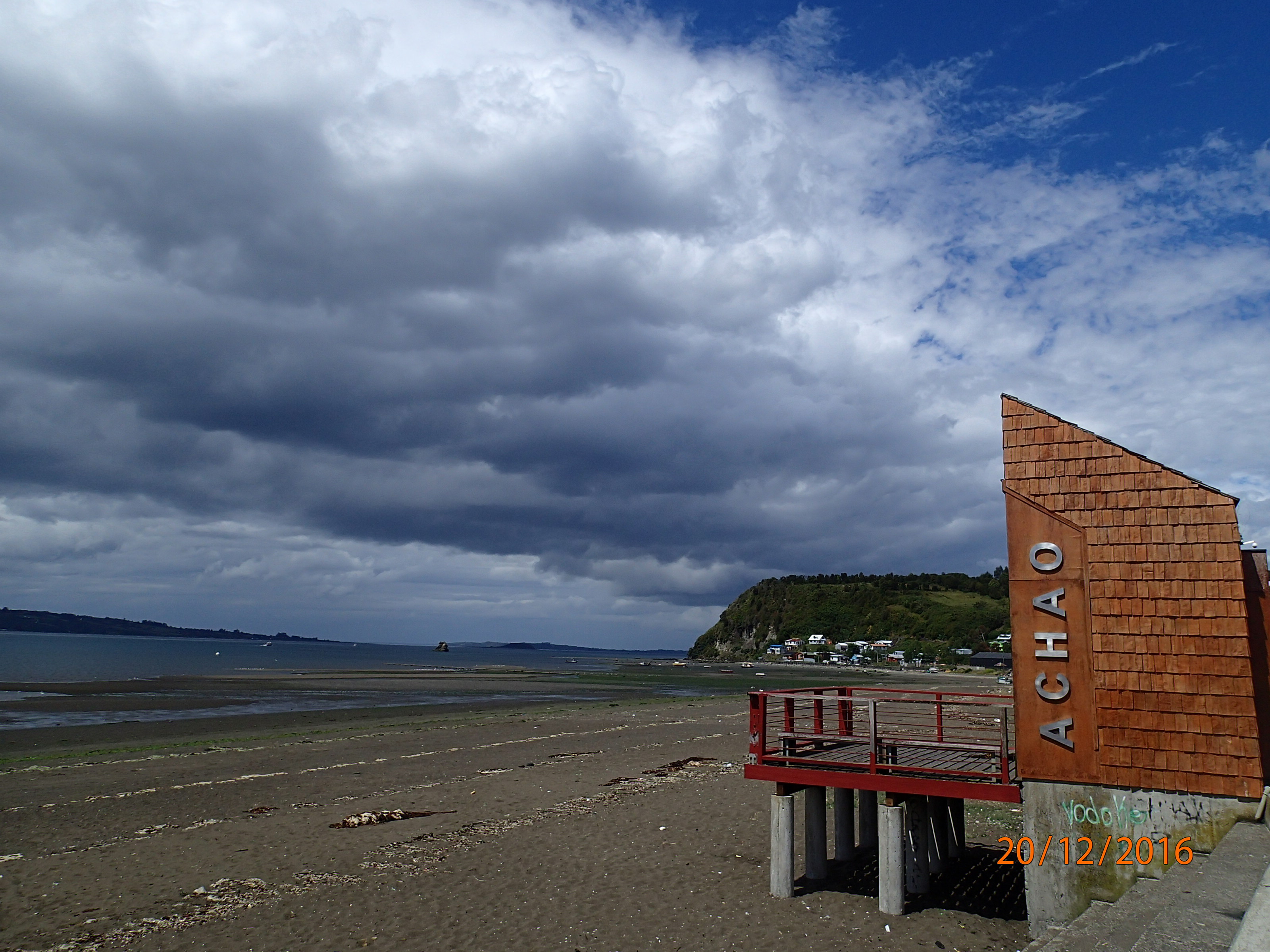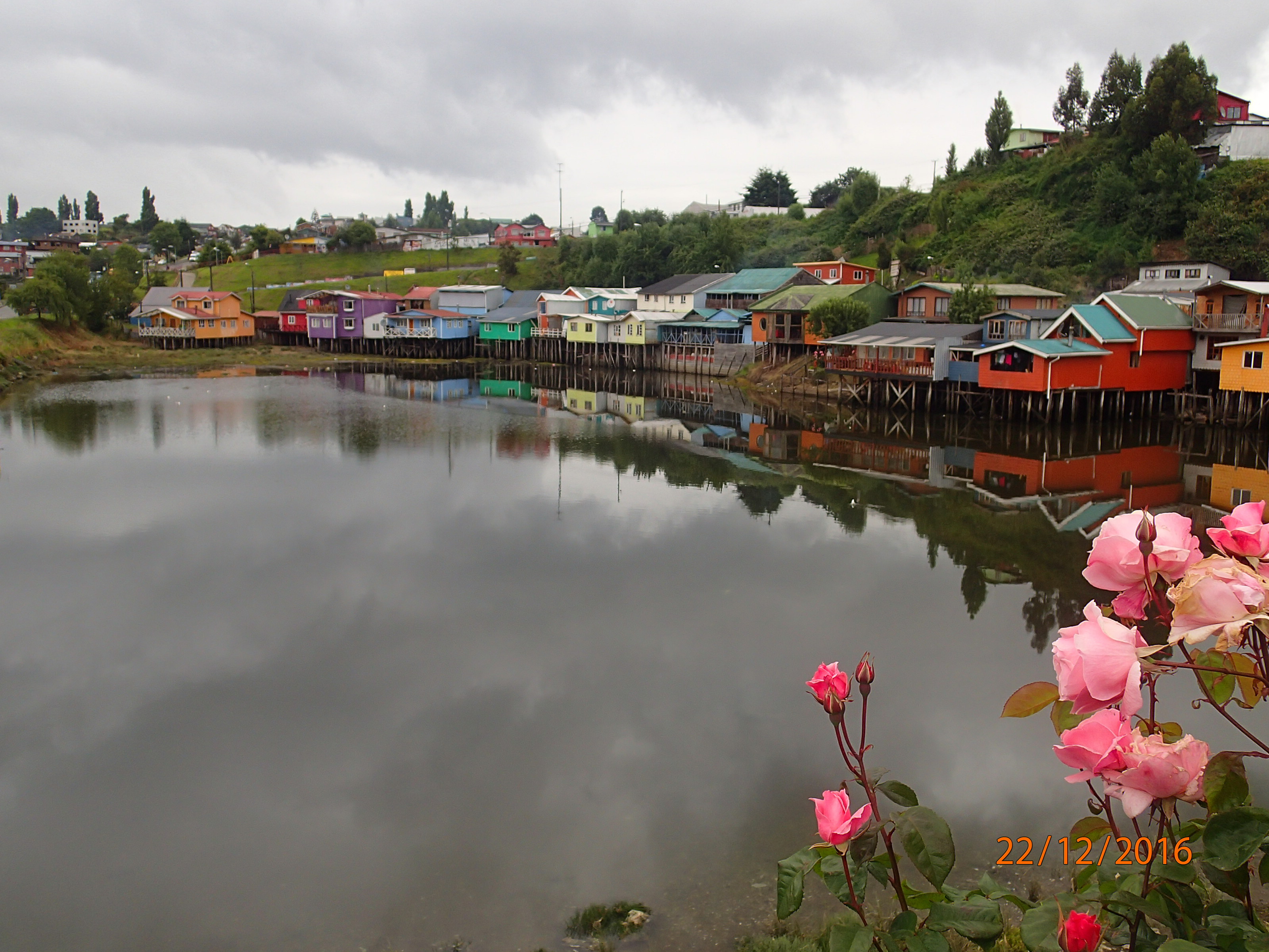 vraiment sans impasse🚧, même pour nous piétons!!! On remonte et retourne sur nos pas, on doit prendre le chemin que l’on tentait d’éviter. Super la route s’avère très belle, on peut apprecevoir les Palafitos de l’autre coté du chenal. Petite averse (ici ça semble normal, soleil, nuageux, de 5 minutes, puis le cycle recommence, seule le temps des cycles change!), Nath à quand