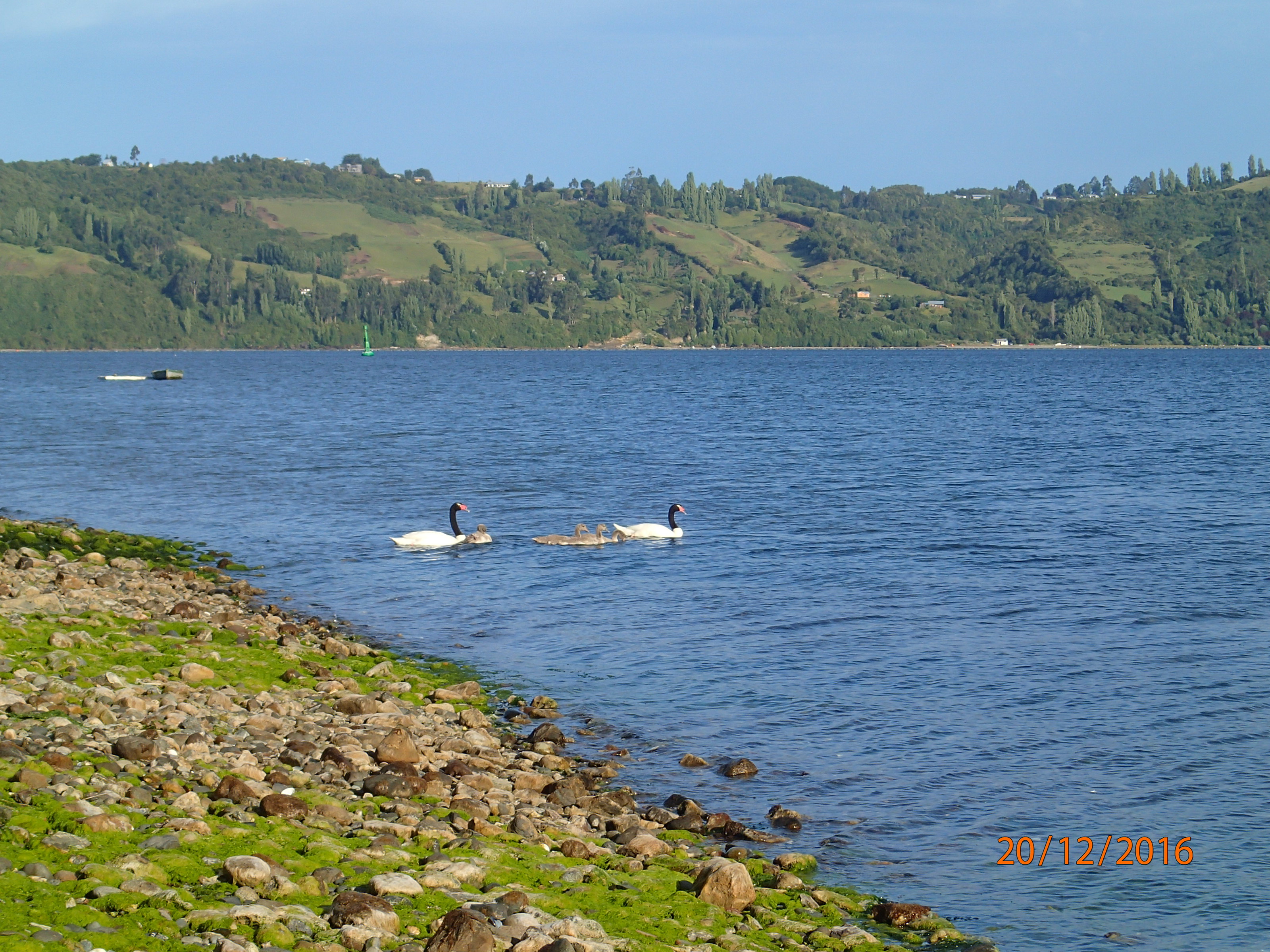 sentier qui nous fait descendre au bord de l’eau! Cool, oiseaux et cygnes à cols noirs se pavanent devant nous et quelques Palafitos (maisons sur pilotis). Mais pas ceux que nous cherchons donc on rebrousse chemin car c’est