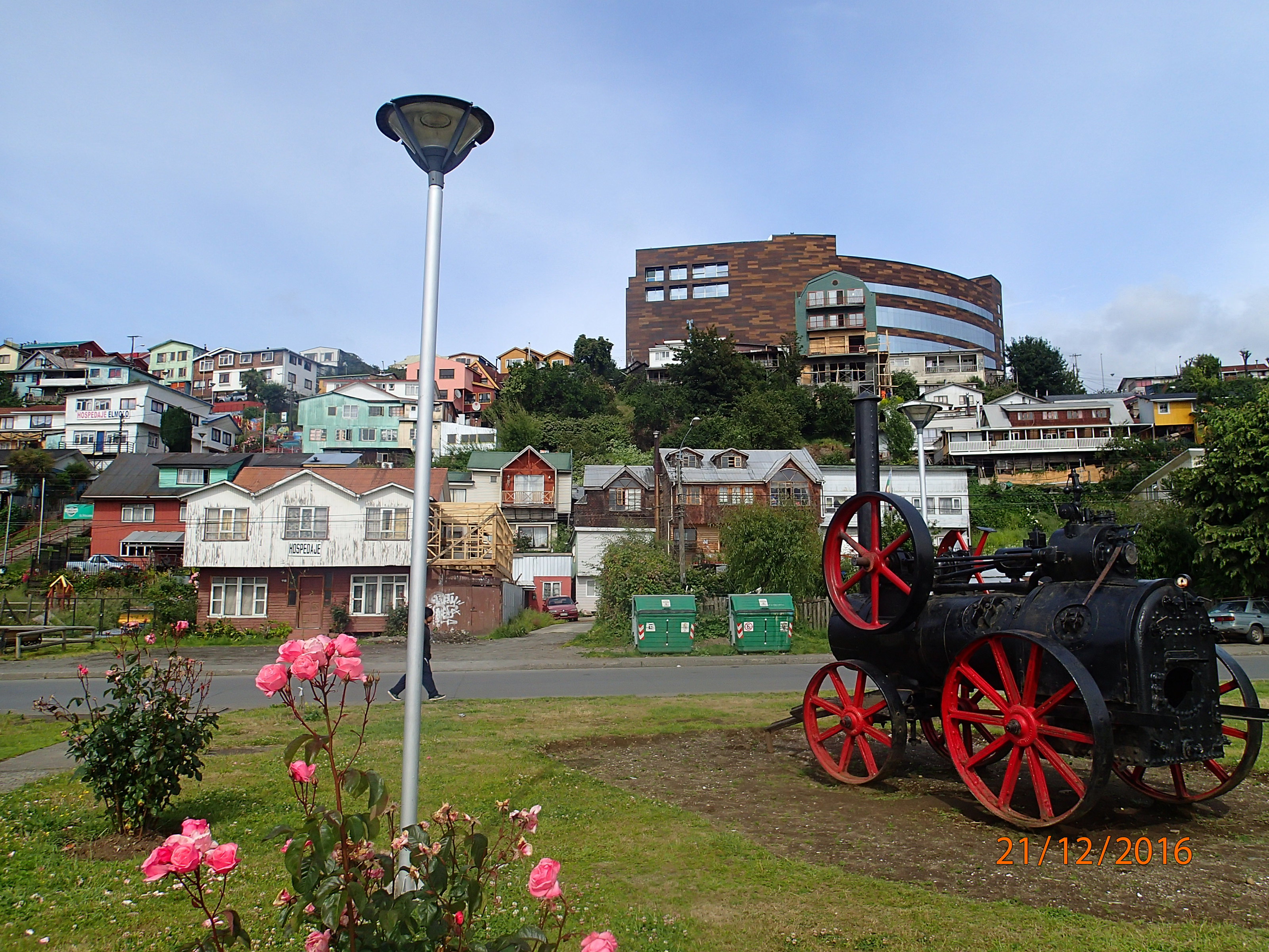 vraiment la mer puisque Chiloe fait 50km par 200km de long! On arrive à Castro, première expérience de conduite dans une ville!!! Wouin🤔😳😱 beaucoup de monde (même si c’est un « village ») et de panneaux de signalisation, une fourche devant nous!!! izquierda, derecha?? Ben on prends a gauche, oups🙃 sens unique sur un boulevard, faut le faire!!!
