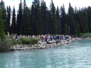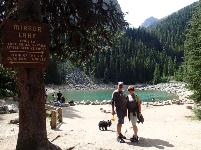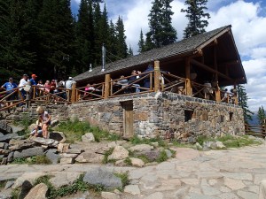 craquer mais on arrives tout de même à se trouver 2 emplacements dans le stationnement. Puis devant nous dejà le fameux Lac Louise et l’hôtel Fairmont (les deux sont majestueux!!!). Oh mais il y a foule et de toutes les nationalités. La couleur du lac de ce point de vue n’est pas tout a fait au point a cause des vents. On décide donc d’aller vers une maison de thé au haut d’une des montagnes et se donner un autre point de vue du lac et en espérant s’éloigner de la foule. ~3 km d’ascension avant d’arriver là haut (Lac Agnès et maison de thé du même nom), petit oasis de paix et de sérénité (en d’autres temps car aujourd’hui bondé comme partout ailleurs). Mais c’est quand meme une tres belle randonnée a faire avec de tres belles vues surtout en haut. Puis Scotch sera au paradis l’instant d’un moment car ici les tamias sont obèses tellement les gens les nourrissent( malgré l’interdiction).