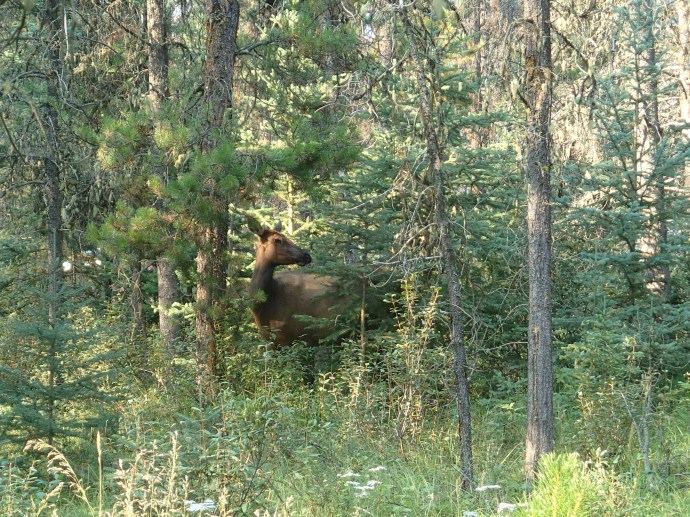 Le soir au campement en allant chercher de l’eau chaude au toilette du parc pour faire la vaisselle, en ressortant j’aperçois un cheval laissé dans le chemin en train de brouter! 🤨 Ça m’a pris un moment avant de constater que ce n’était pas un cheval, mais un Wapiti 🤪 puis il n’est pas tout seul, d’autre femelles aussi s’y trouvent dans les environs. Je capote!!!! Ils sont tous près de moi. Et sont juste à côté d’une gang à la table de pique-nique et ne les voient pas. Merde je n’ai pas mon cell ou Kodak!