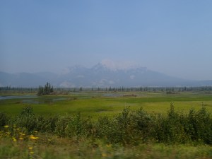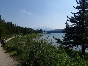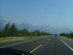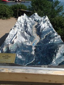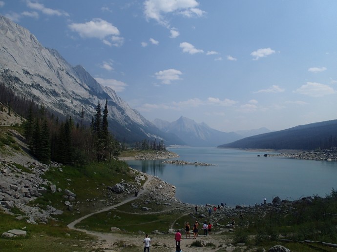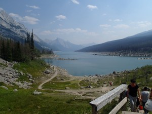 Arrivé au Lac Maligne, sur le coup un peu déçue jusqu’à ce qu’on étudie la maquette 3D et qu’on voit que ce lac est entourée de montagne et même de glacier! Mais avec la fumée pressante on ne distingue pas très bien toute cette beauté.
