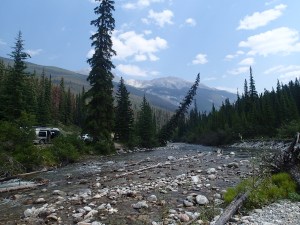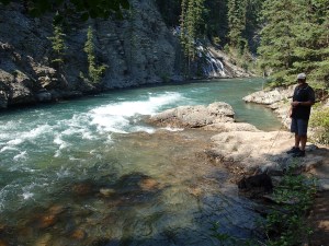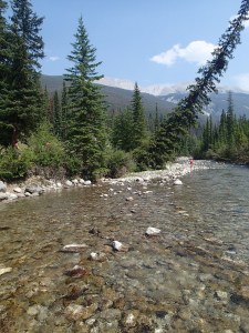 Au retour on arrête pique-niquer sur le bord d’une rivière et ensuite Claude et Jo continu vers le Lac Maligne tandis que nous on va tenter notre chance dans cette rivière. Ouch les pieds me gèlent en traversant faut pas trop s’attarder mais c’est plein de roches! Et devinez quoi: ben rien! Bon mais c’est quand même fou juste à l’idée de pêcher ici entouré de ce paysage! Et moi( Nath) je m’imagine juste voir un ours pêcher et le regarder tout en le prenant en photo. 😁