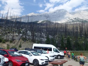 Direction Lac Maligne on voit le Lac Medicine, bleu turquoise avec une très grande partie de la forêt brûlé en 2015. Ce lac alimente le Canyon Maligne sur une distance de 17km en source souterraine!