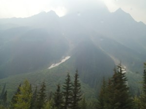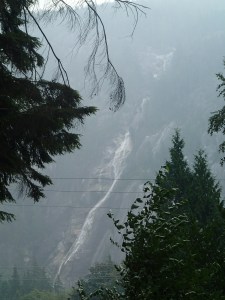 On reprends la route puis plus loin un autre attrait: Takakkaw Falls, la 2e plus haute chute au pays….255m. Ok on essaie même si on doit aller s’enfoncer 12km dans le bois. Ha un campground…c’est plein! ( pas surprenant avec le retard causé par l’accident)…aller reprenant la Route du bois avec la van….oups ça monte pas mal et des virages en lacet dont un assez serré ( pas tout le monde qui peut passez ici). En temps normal avec le beau temps cette route doit être magistral! On arrive on met les imperméables et allons au pied de la chute qui fait tout un vacarme! Très beau et puis on essaie d’apercevoir tant bien que mal les sommets avec une lueur de glacier…